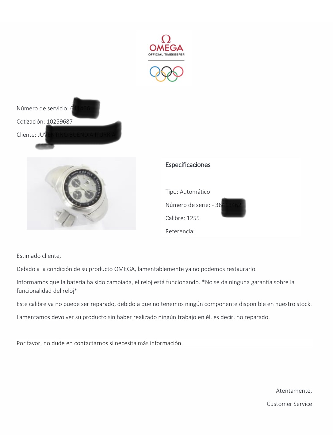 This is one of the letters they sent me, it basically says that they could not do anything to my watch because they no longer have the necessary spare parts.