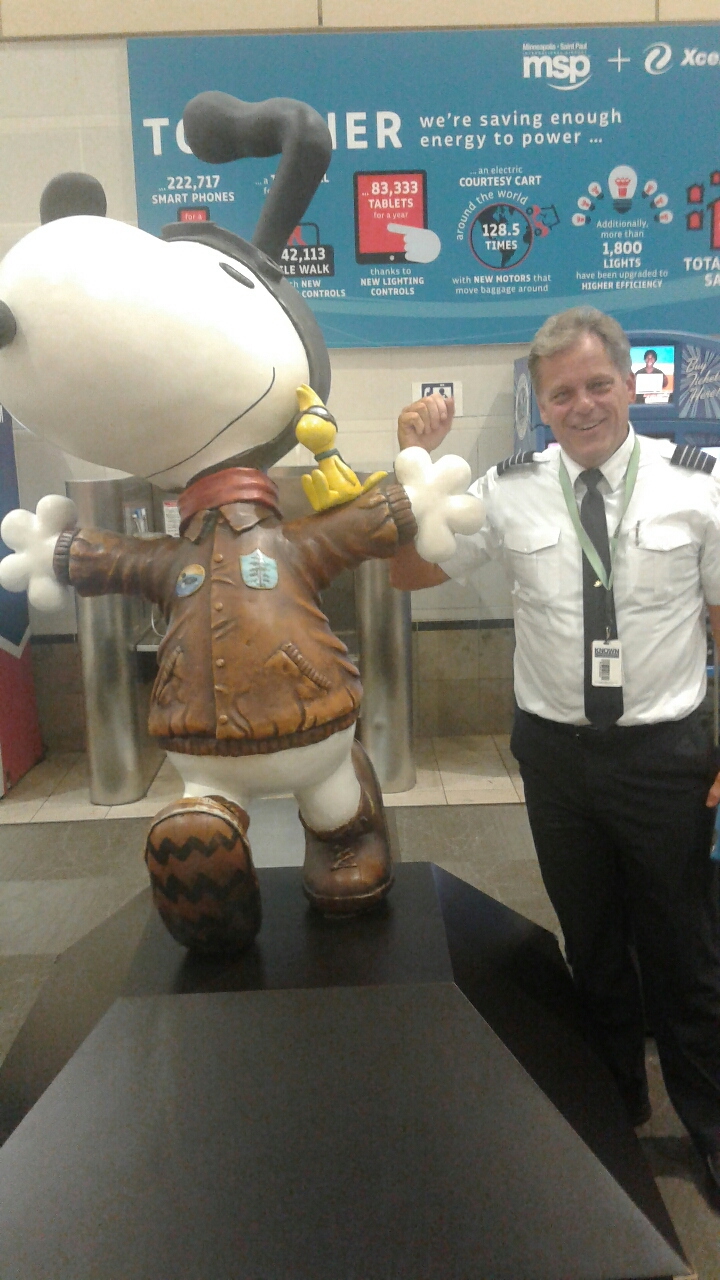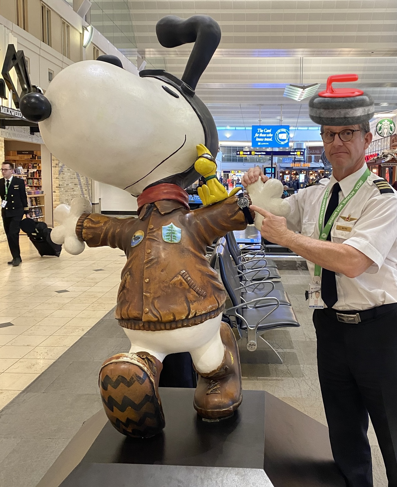 OK…currently in the Minneapolis airport…they must have multiple Snoopy & Woodstock pilot action figures here since this looks like a different location than what you posted. Anyway, I loaned my 3861 to Snoopy for the pic…good thing I have my Omega NASA strap for his ridiculously humongous wrist. Also, I’m having a really bad hair day so I used some technologies to put a [regionally correct] curling stone on my head to hide my really bad hair…