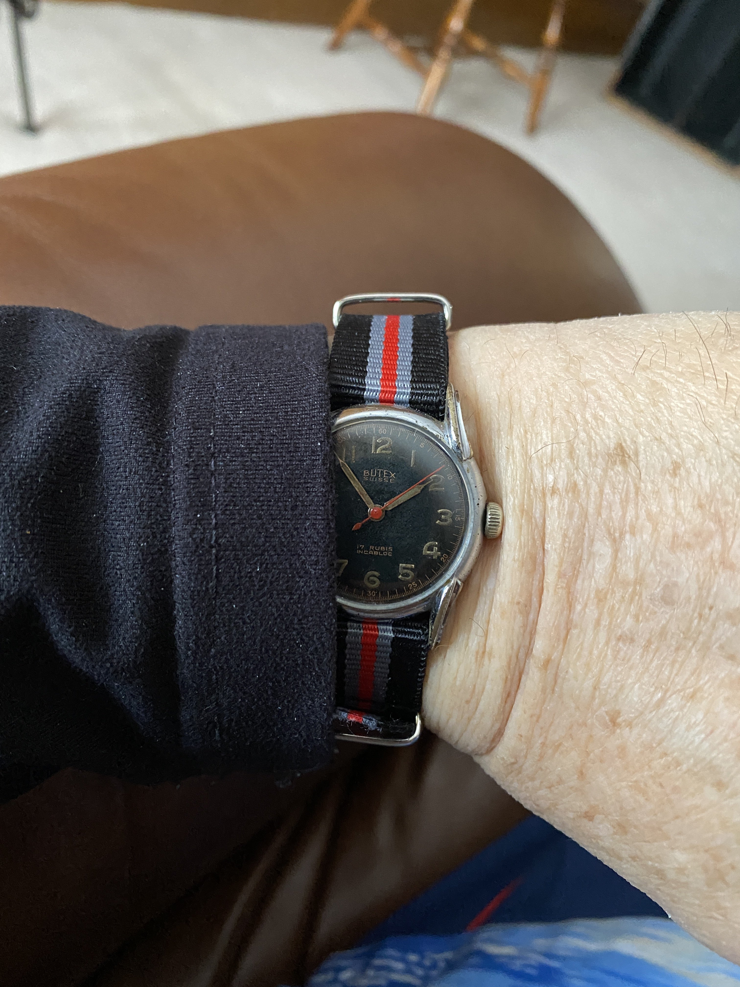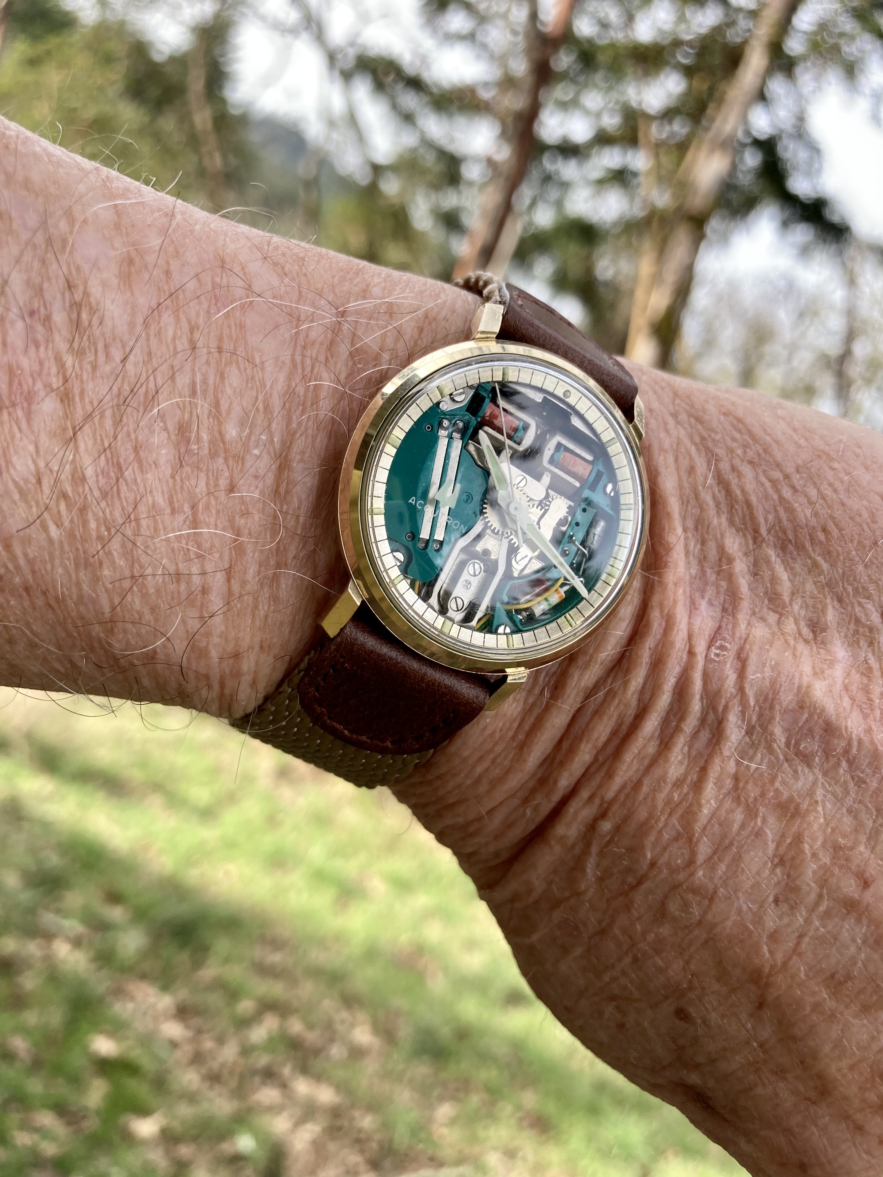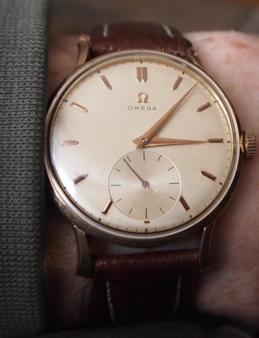 Which one to park, and which one to wear! So I parked the Mido bumper automatic, and donned my rose gold filled jumbo, 2809-2, with calibre 266. I’m the second owner. This watch and the first owner survived a helicopter crash in the late 1950s. I wear it on a reddish brown bison hide strap which suits the watch.