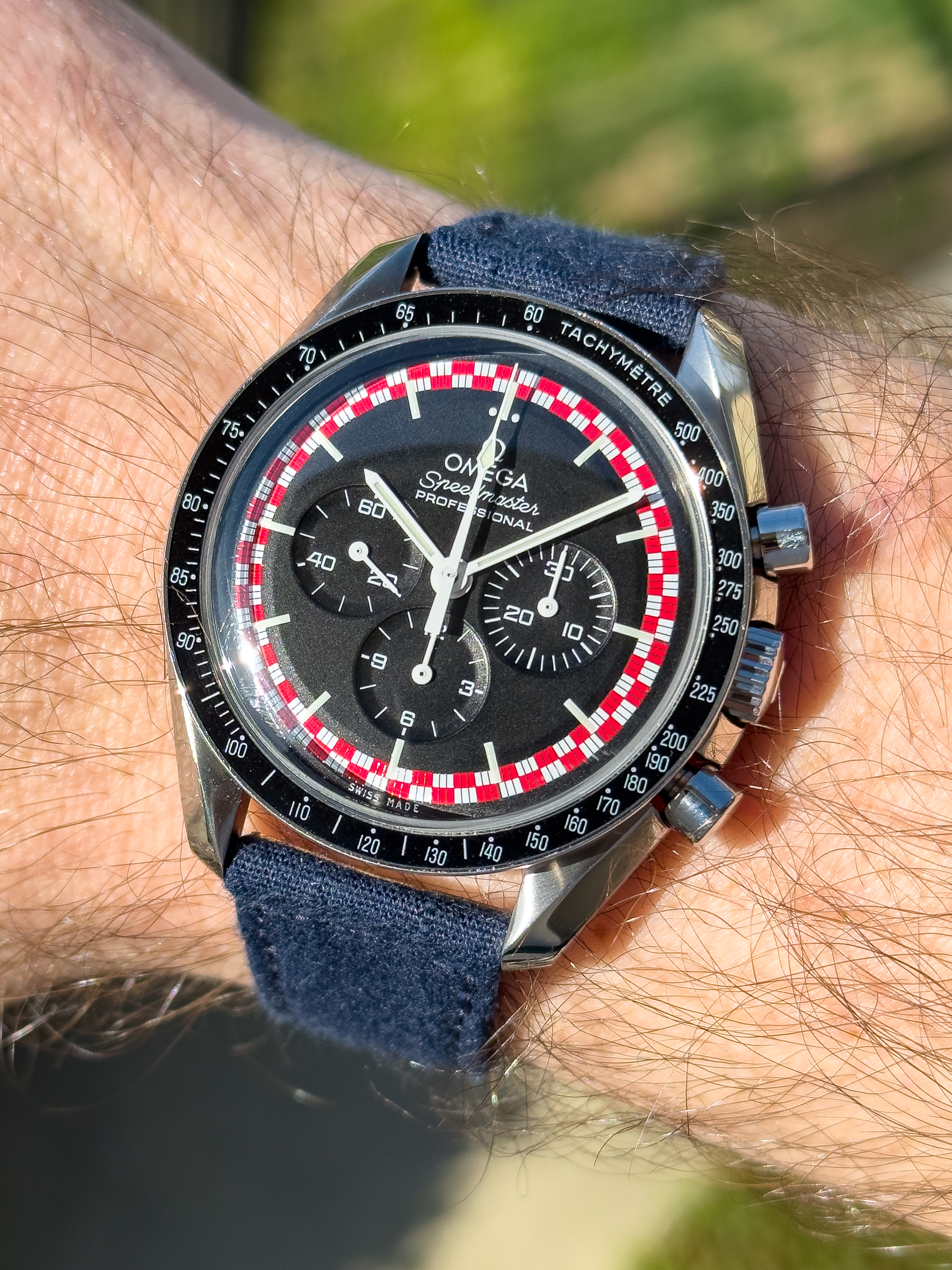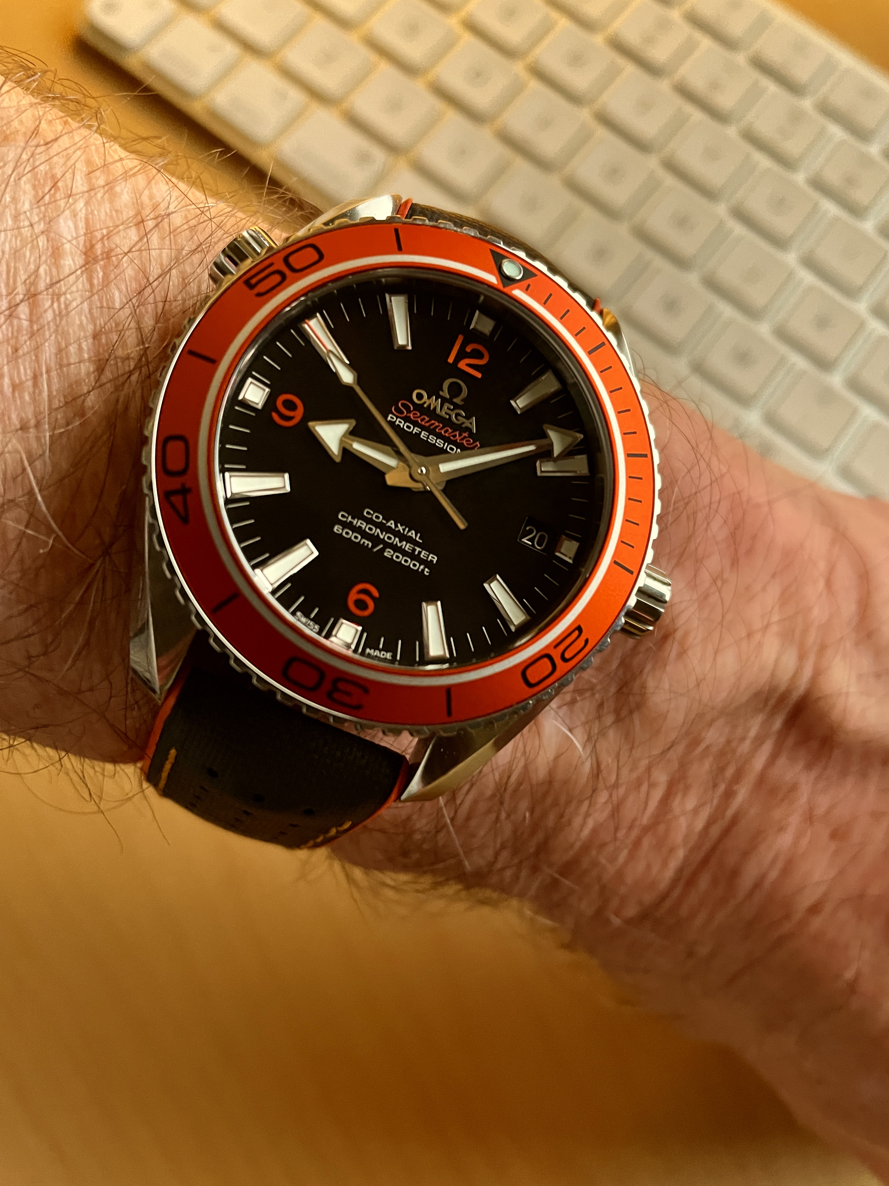 Yes, it's a Forstner Contemporary Flat-Link with the brushed/polished combination. I actually like the Omega OEM 5-link bracelet as much if not more, but its lack of micro-adjustments leaves me with a bracelet that's always uncomfortably loose or uncomfortably tight. The Forstner bracelet has eight micro-adjustments.