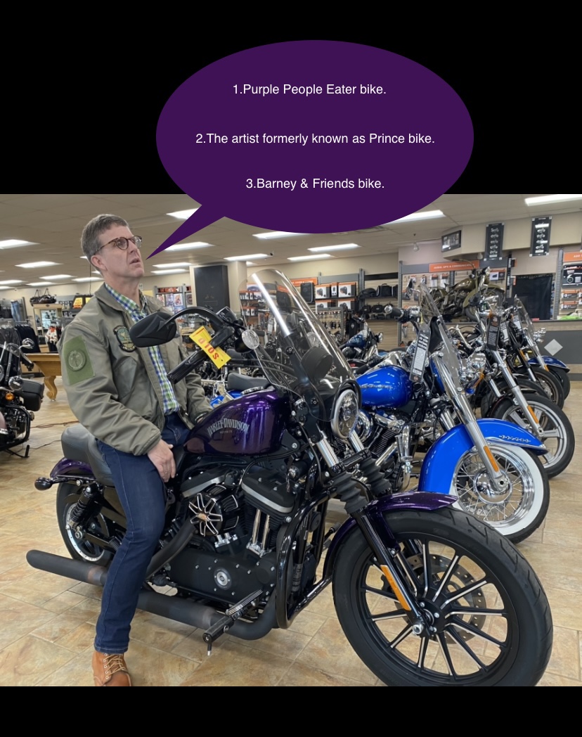 …AND she let me test ride it yesterday which was my first time riding an H-D [Thanks, MacGyverette!]…AND she really digs the purple…BUT I had to give her some crap about it…