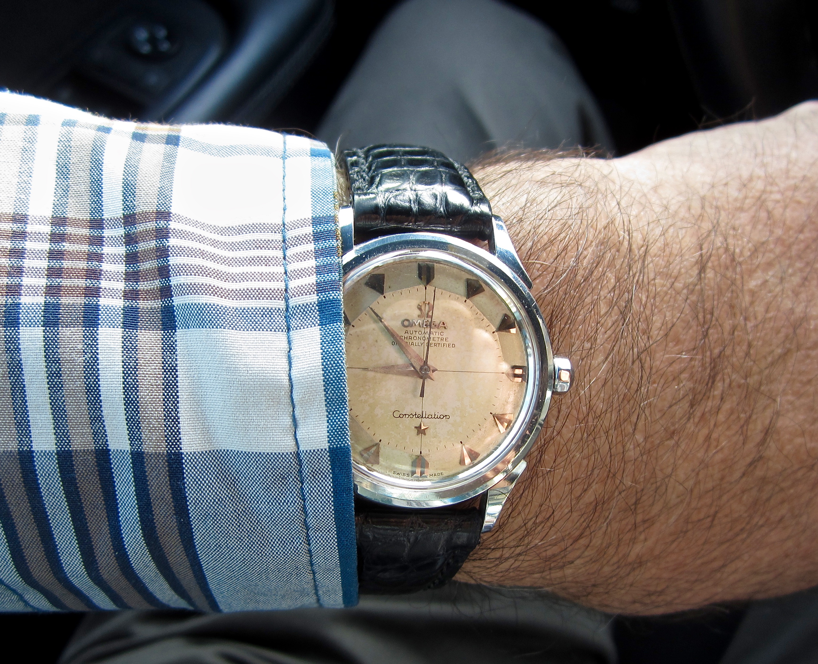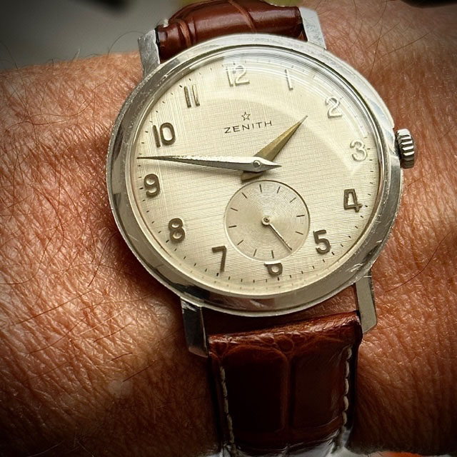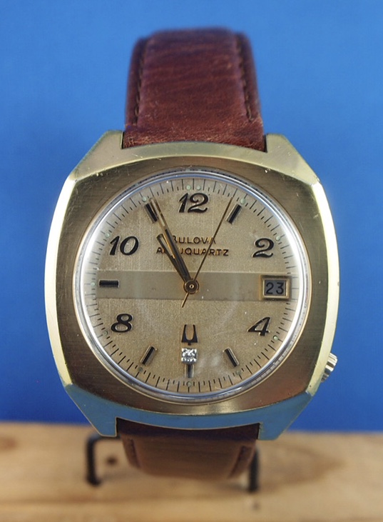 My choice for the day, my 1973 Bulova Accu-quartz. This was made during the waning years of the Bulova company. Bulova was at the forefront of battery powered watches for about 10 years, before this one was made. The Accutron was introduced circa 1962, a year or two after the introduction of quartz watches. Bulova didn’t see the writing on the wall in the early 1960s. They had spent so much money and so much time developing and introducing the transistorized (non-quartz) Accutron, they weren’t ready to abandon their investment to jump into quartz watches. In the early 1960s, at a time when the public could buy a Texas Instruments LED quartz watch for under $50.00, the public lost the taste for the Accutron which started around $200.00. Bulova soldiered on, well into the 1970s, but they just couldn’t compete. This Accu-quartz is basically an Accutron 218 model with a quartz modulator designed into the circuitry. It was too expensive to produce to be competitive in a changing market. Bulova folded as a manufacturer circa 1976-77. although the name is still around today, owned by the Citizen Watch Co.
