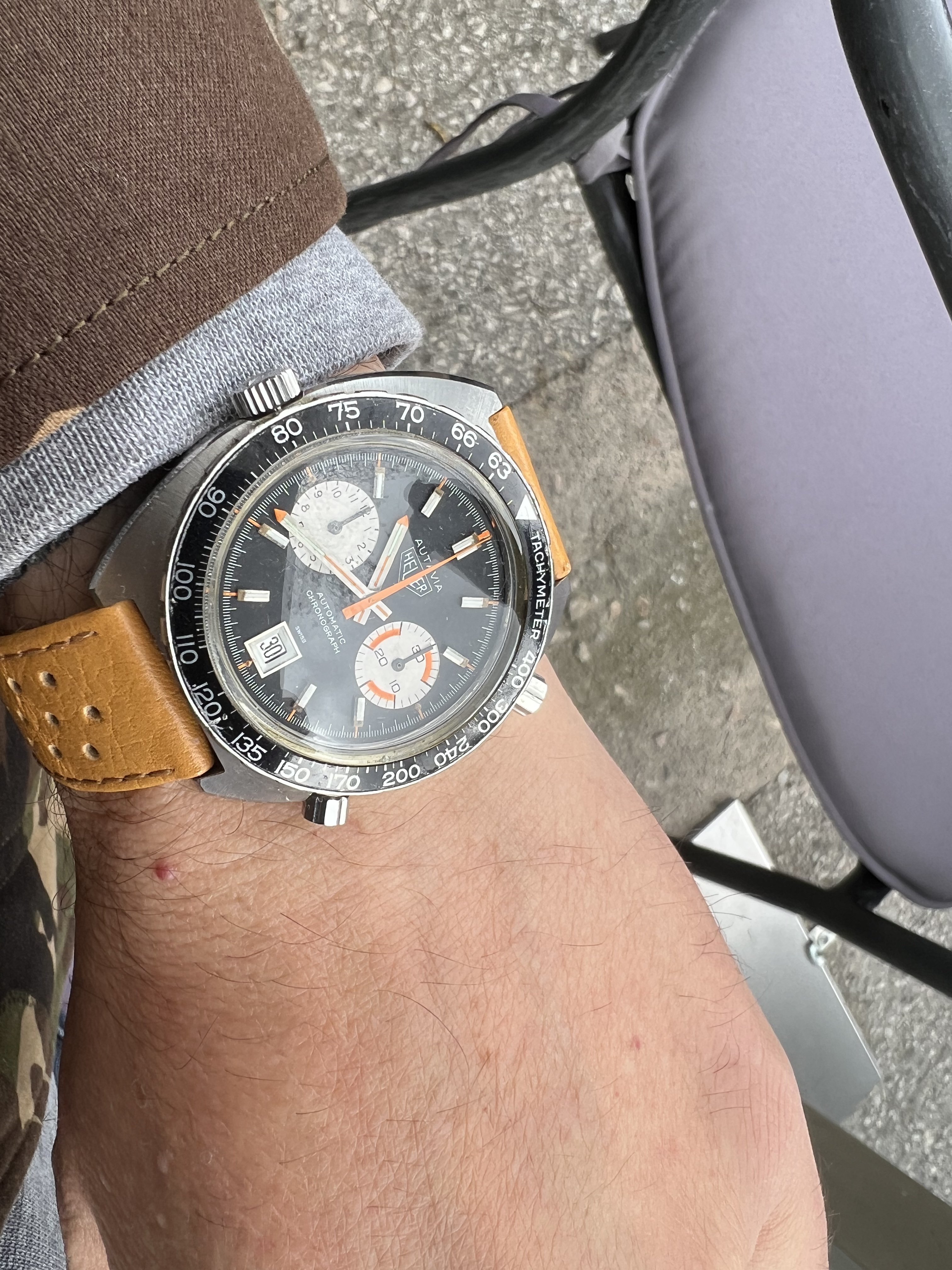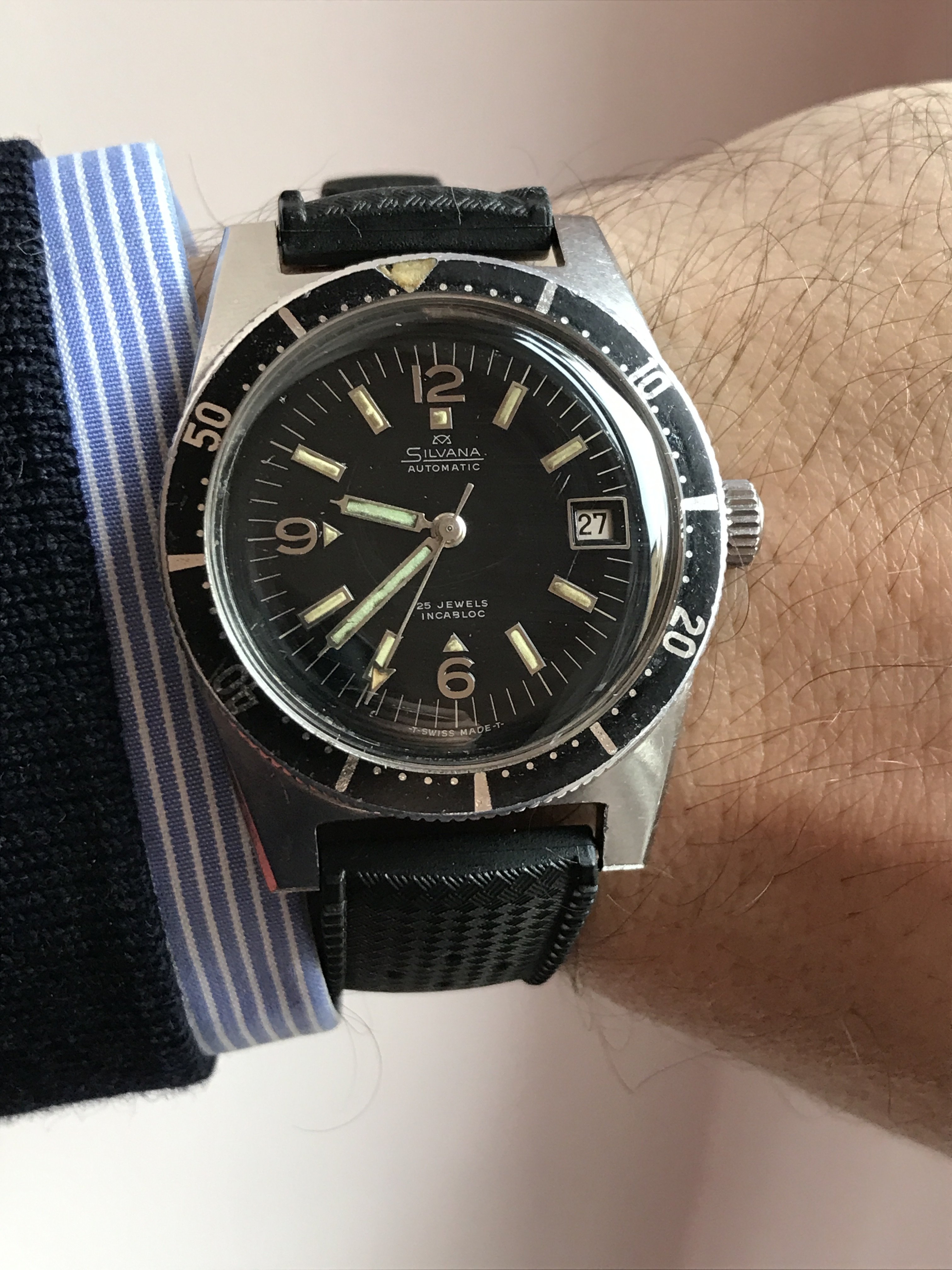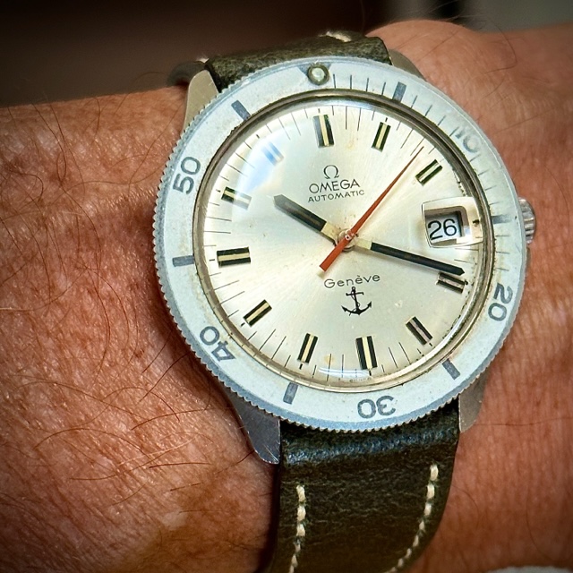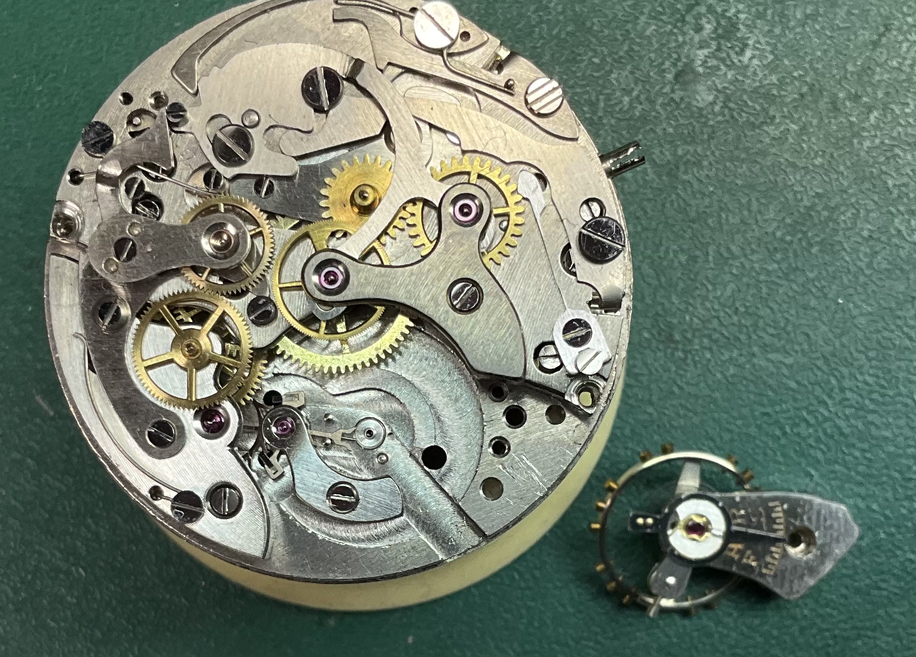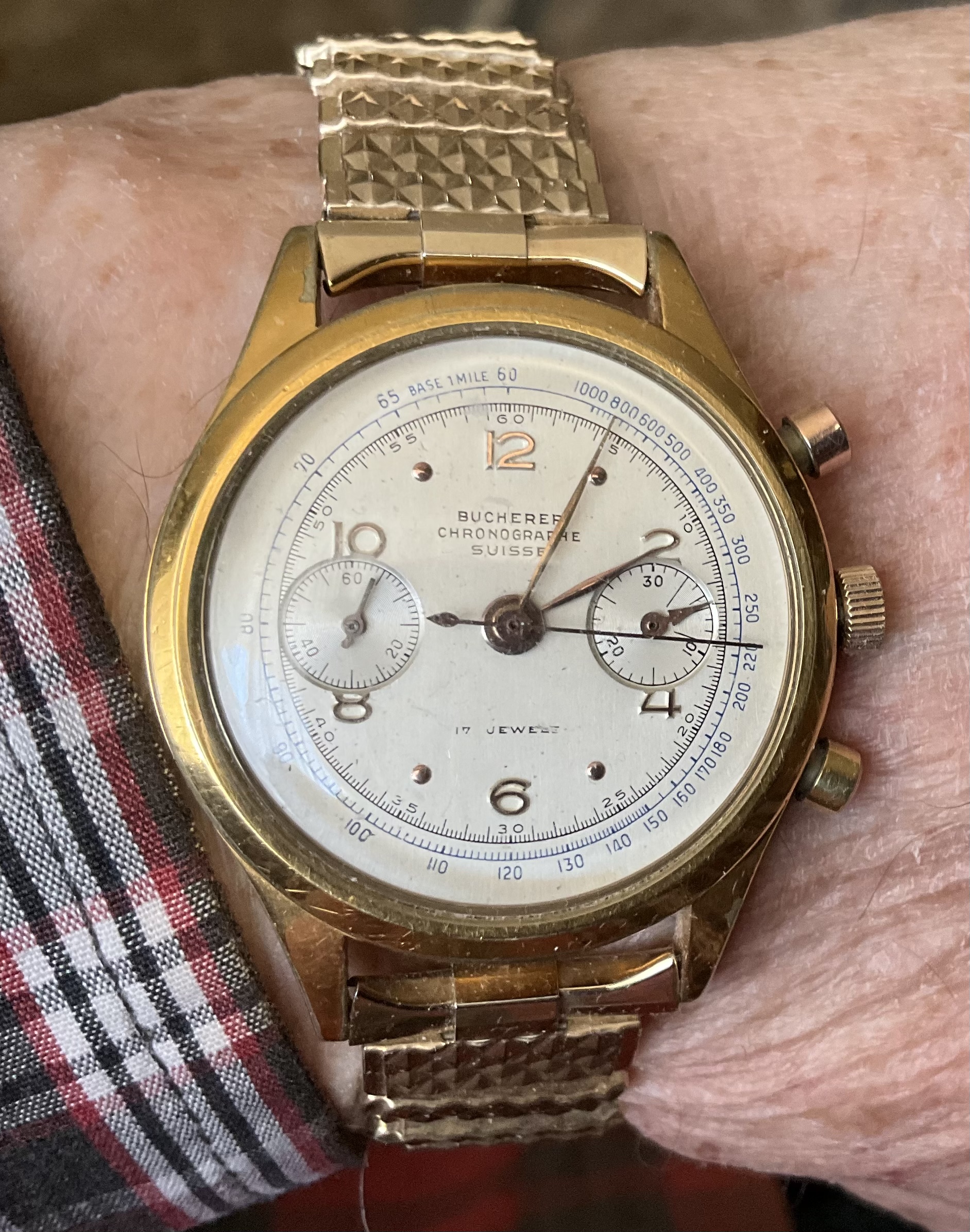 Time again to exercise the Bucherer two-register chronograph with a 17-jewel Landeron calibre 48 movement. The calibre 48 was introduced circa 1937, and produced until 1970. This one is in a gold filled “clamshell” case with steel back, and I estimate it would be circa mid 1950s. Close to 70 years old. I’ve owned it for about 20 years, but hadn’t worn it until I serviced it, early in January. (Finger mark on the balance cock no longer there since servicing!)