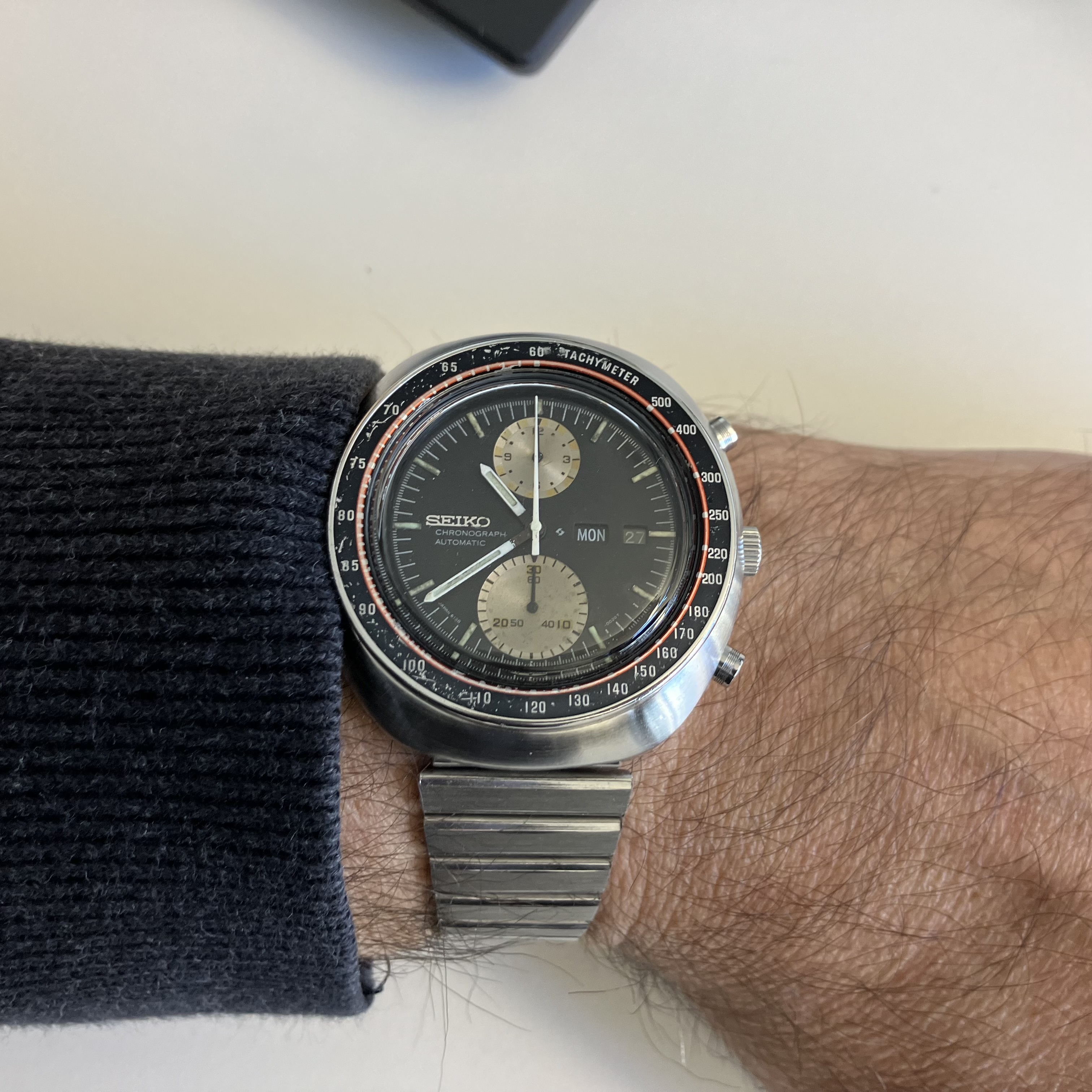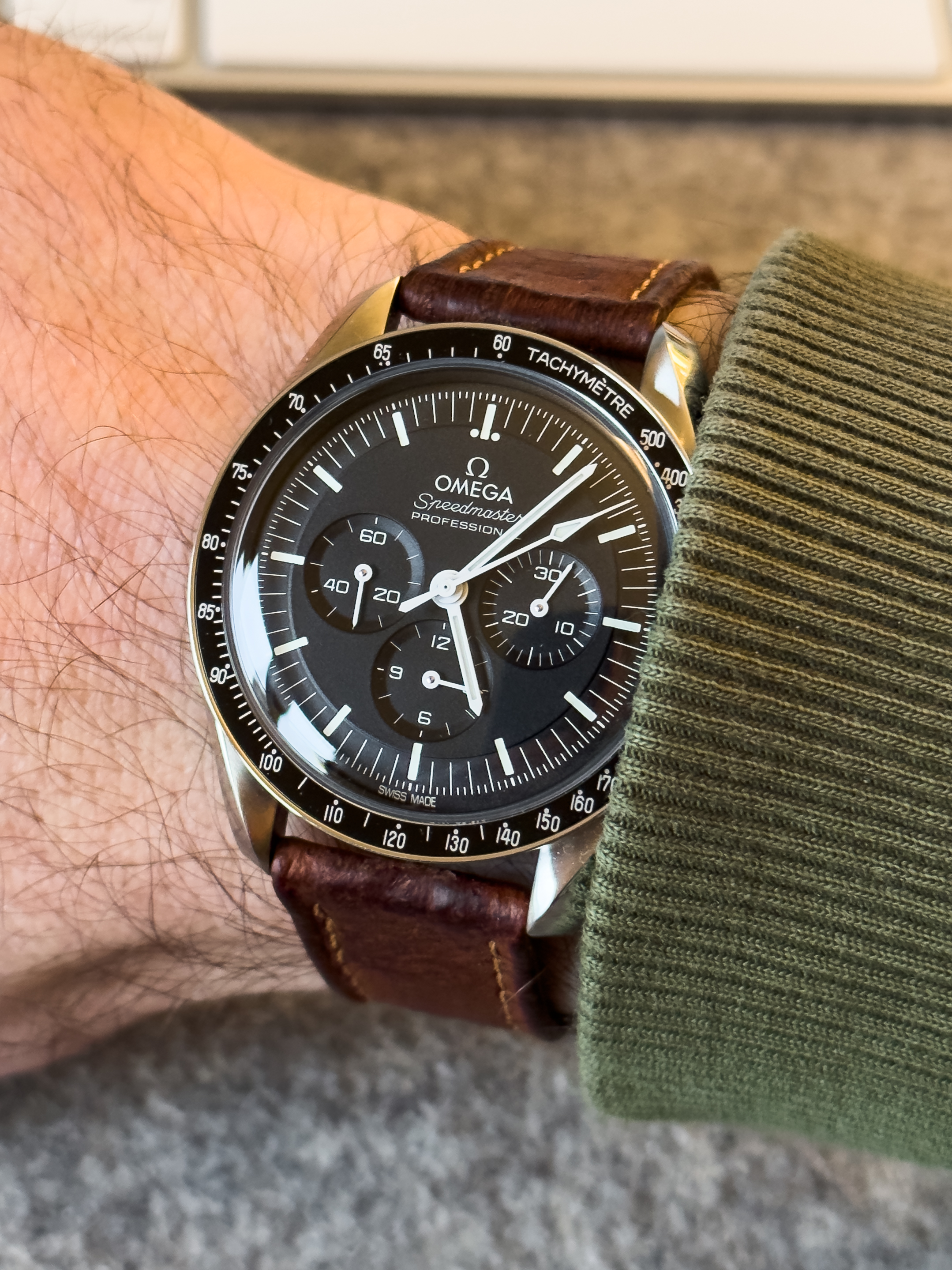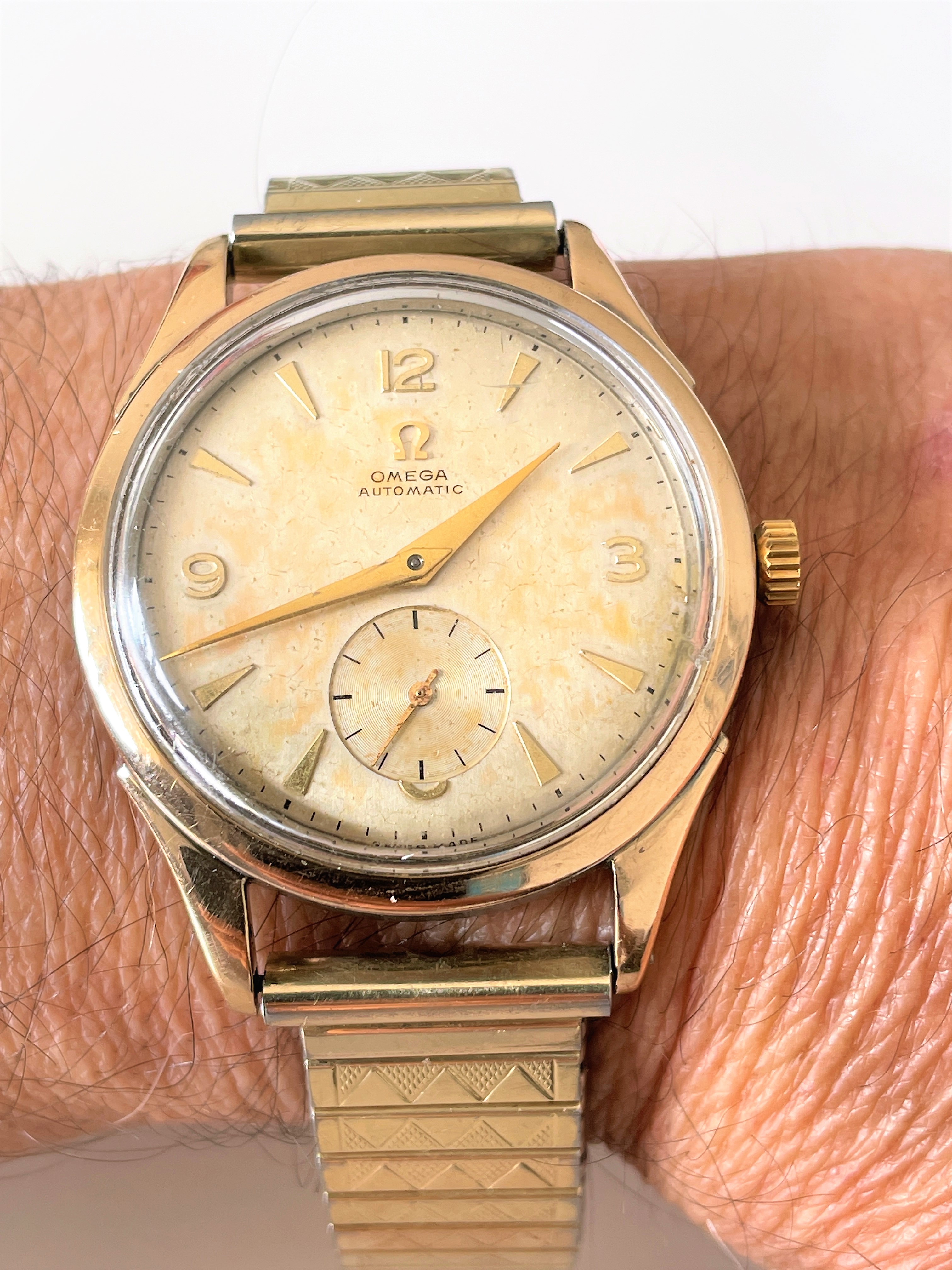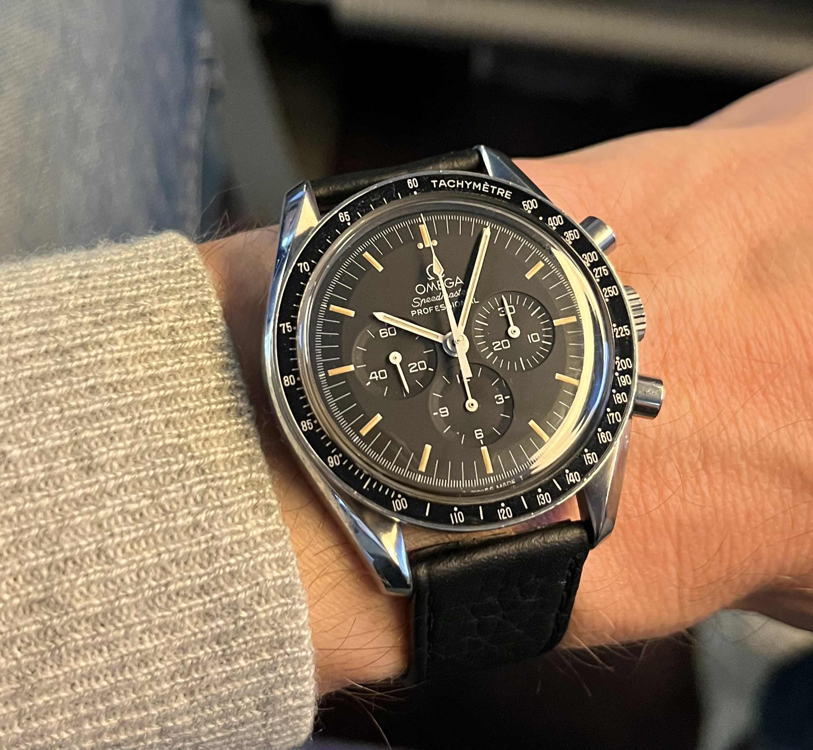Time again to exercise the Bucherer two-register chronograph with a 17-jewel Landeron calibre 48 movement. The calibre 48 was introduced circa 1937, and produced until 1970. This one is in a gold filled “clamshell” case with steel back, and I estimate it would be circa mid 1950s. Close to 70 years old. I’ve owned it for about 20 years, but hadn’t worn it until I serviced it, early in January. (Finger mark on the balance cock no longer there since servicing!)