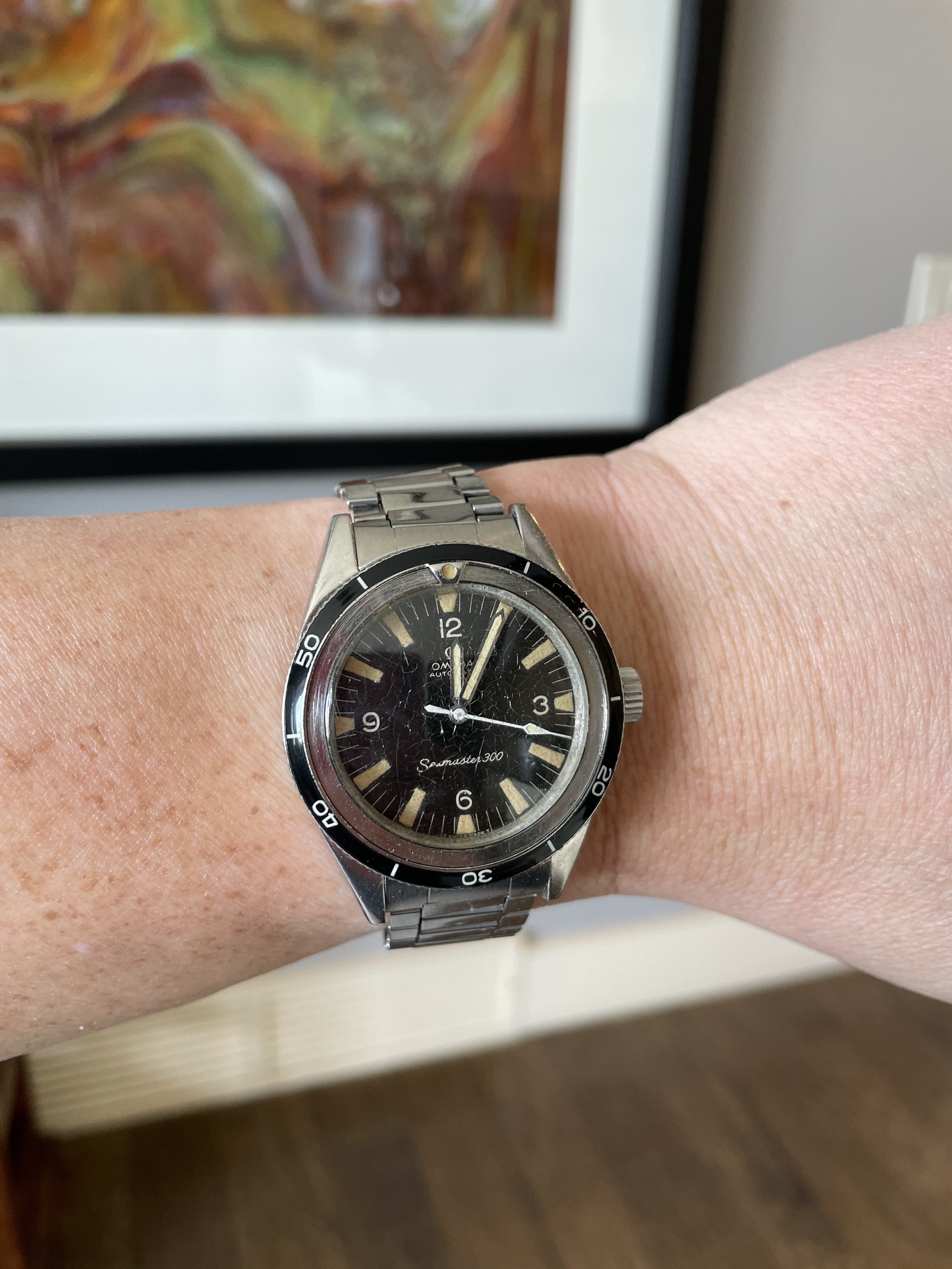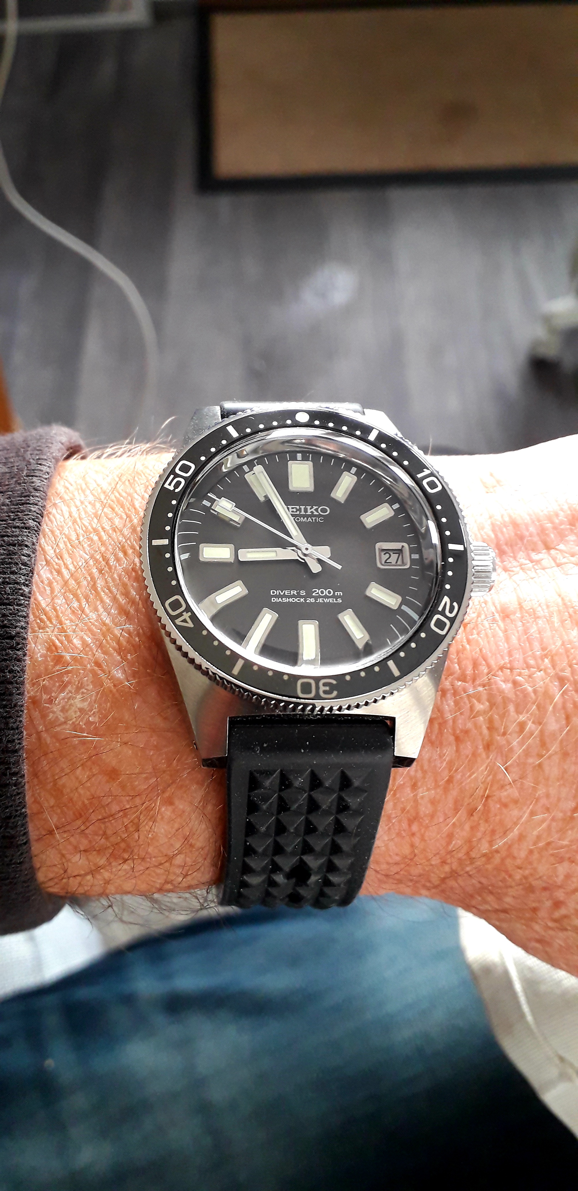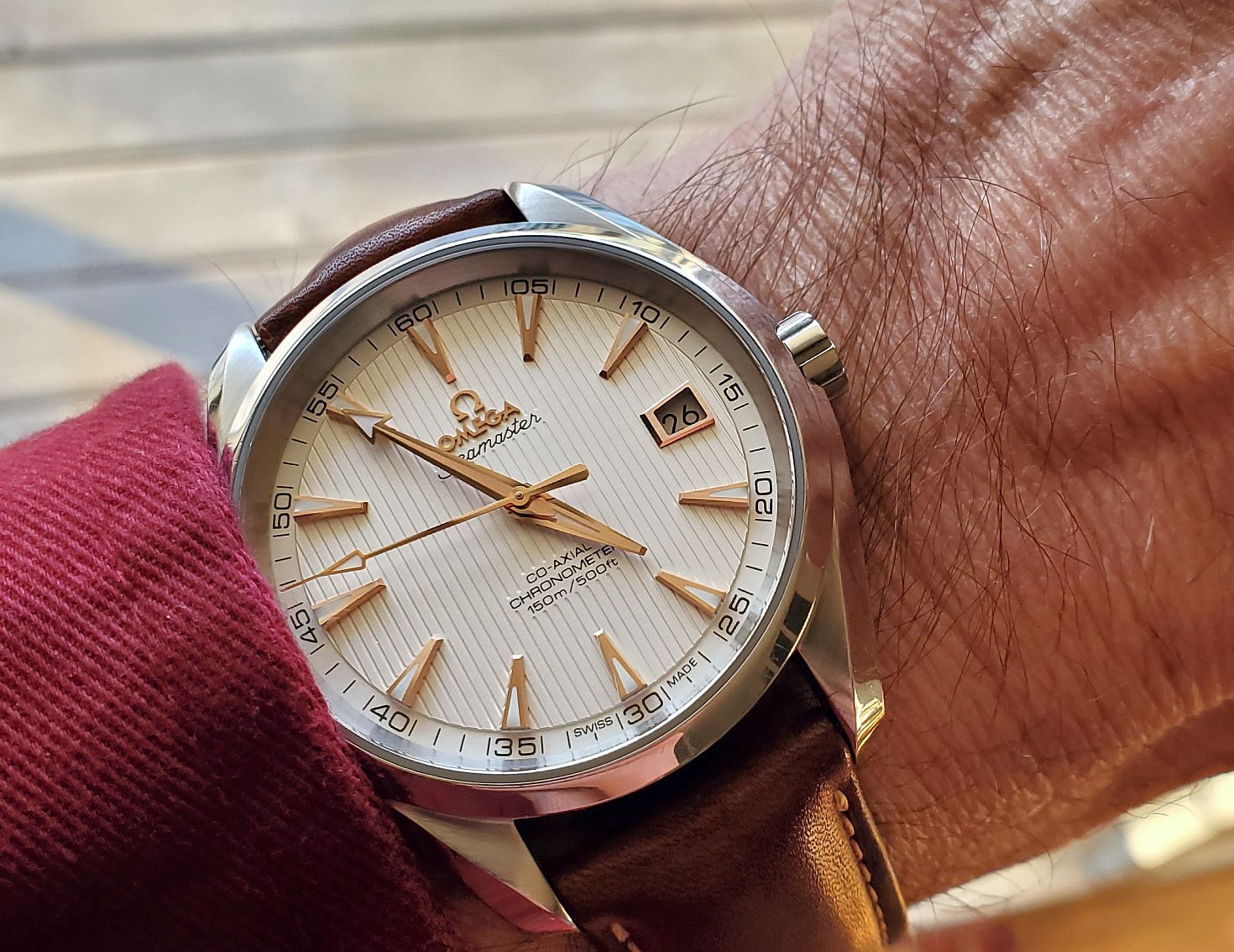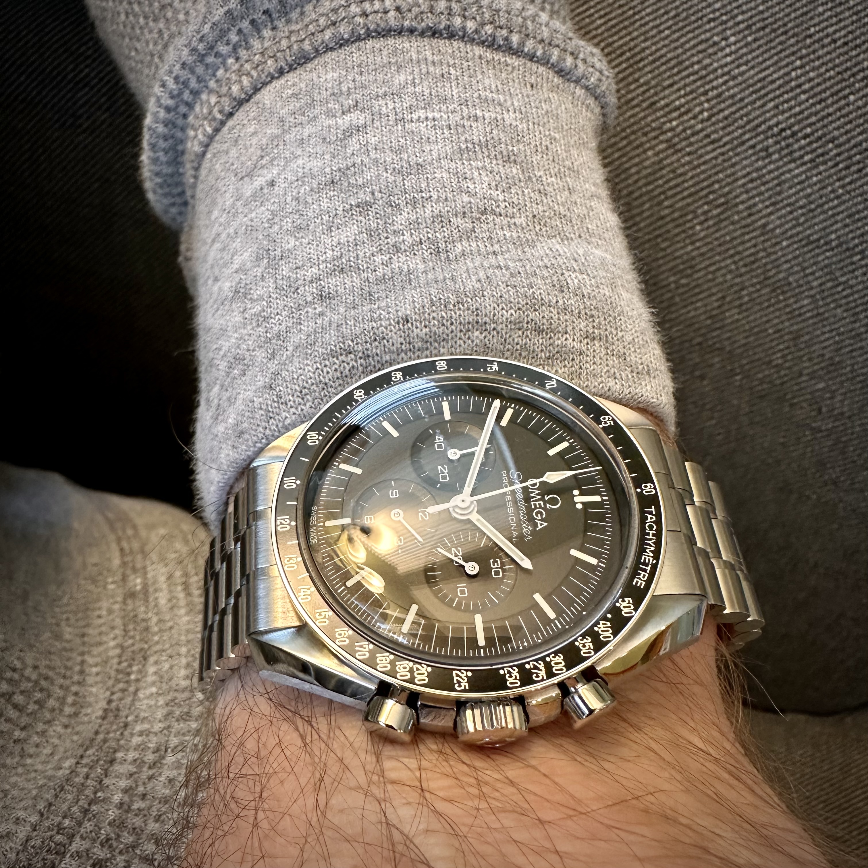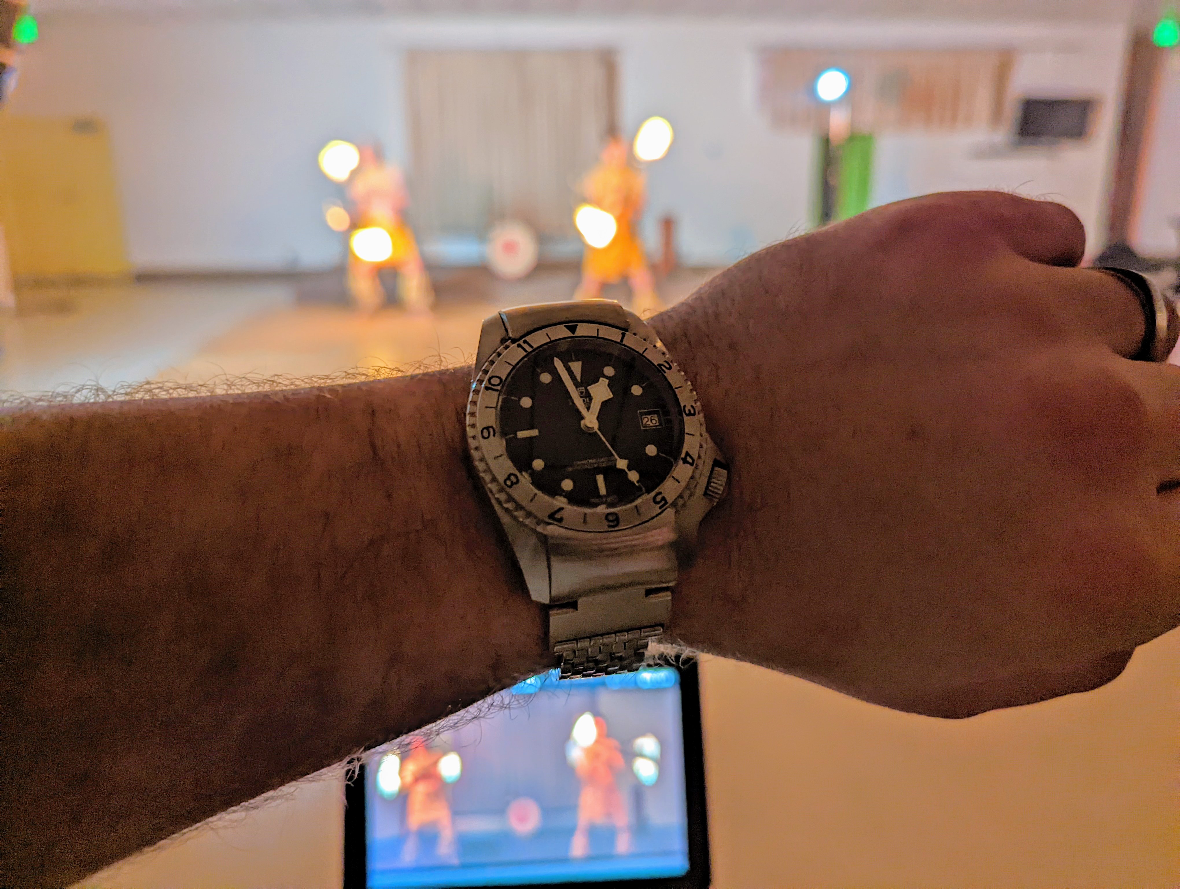 Time again to exercise the Bucherer two-register chronograph with a 17-jewel Landeron calibre 48 movement. The calibre 48 was introduced circa 1937, and produced until 1970. This one is in a gold filled “clamshell” case with steel back, and I estimate it would be circa mid 1950s. Close to 70 years old. I’ve owned it for about 20 years, but hadn’t worn it until I serviced it, early in January. (Finger mark on the balance cock no longer there since servicing!)