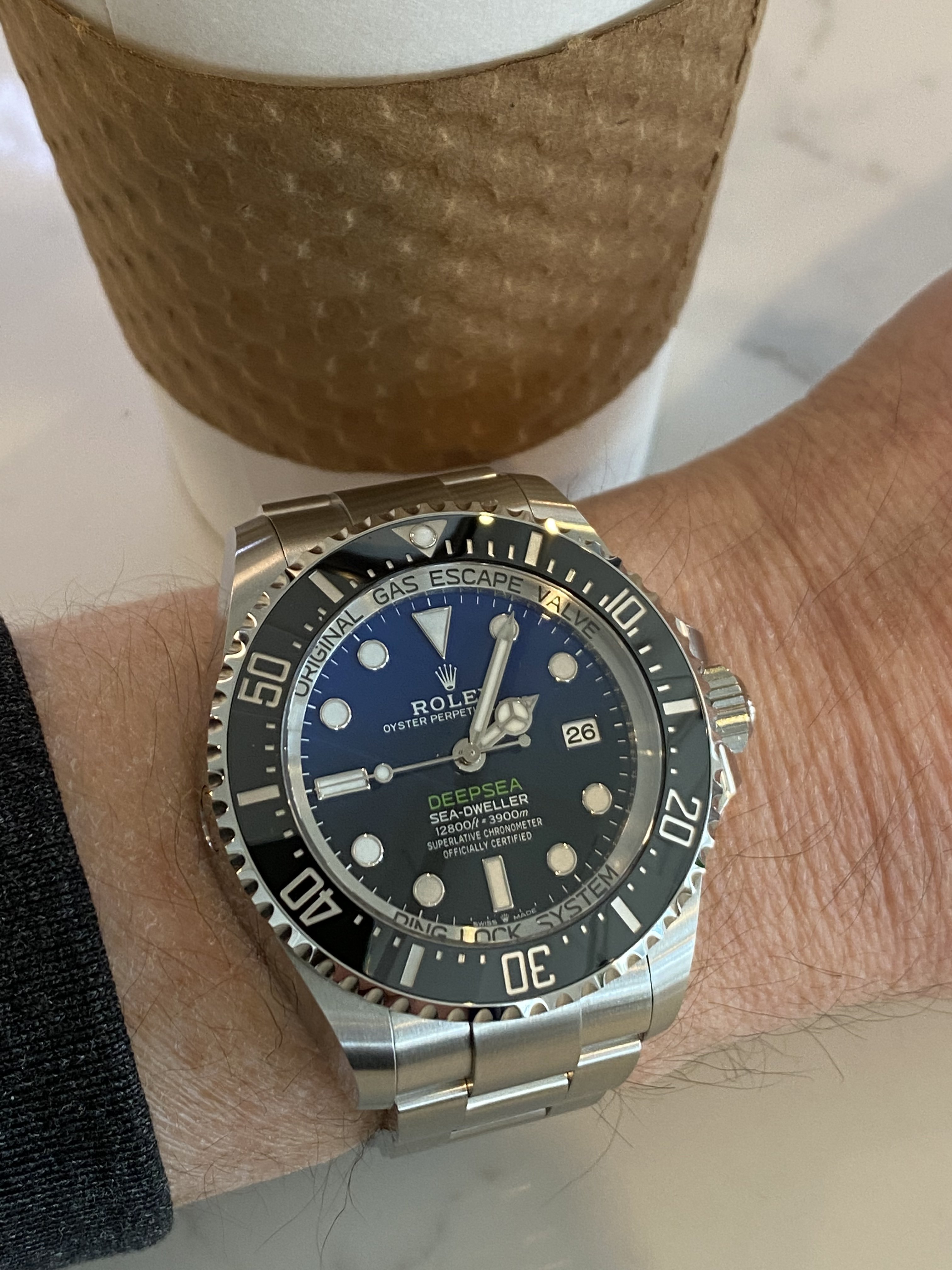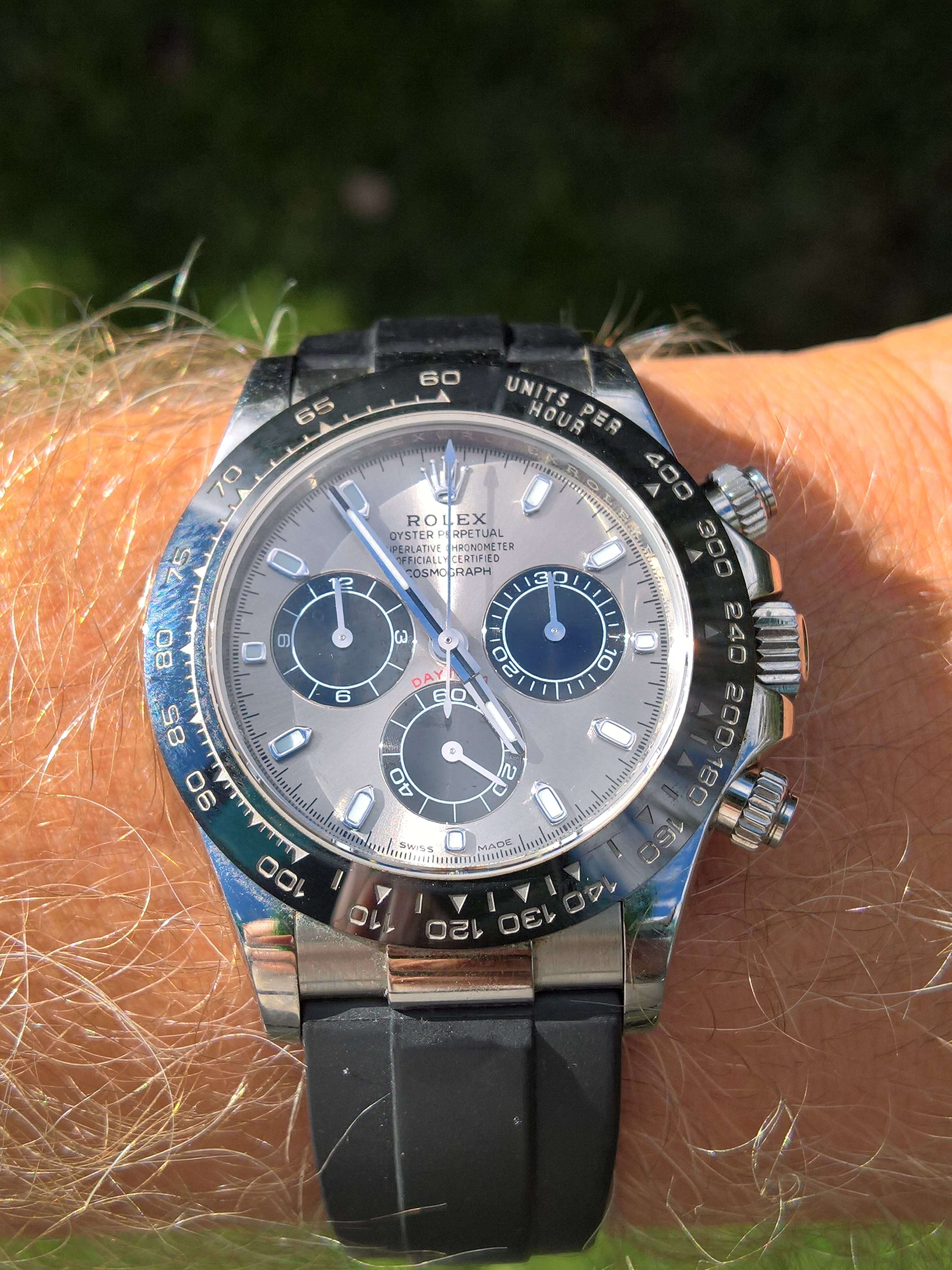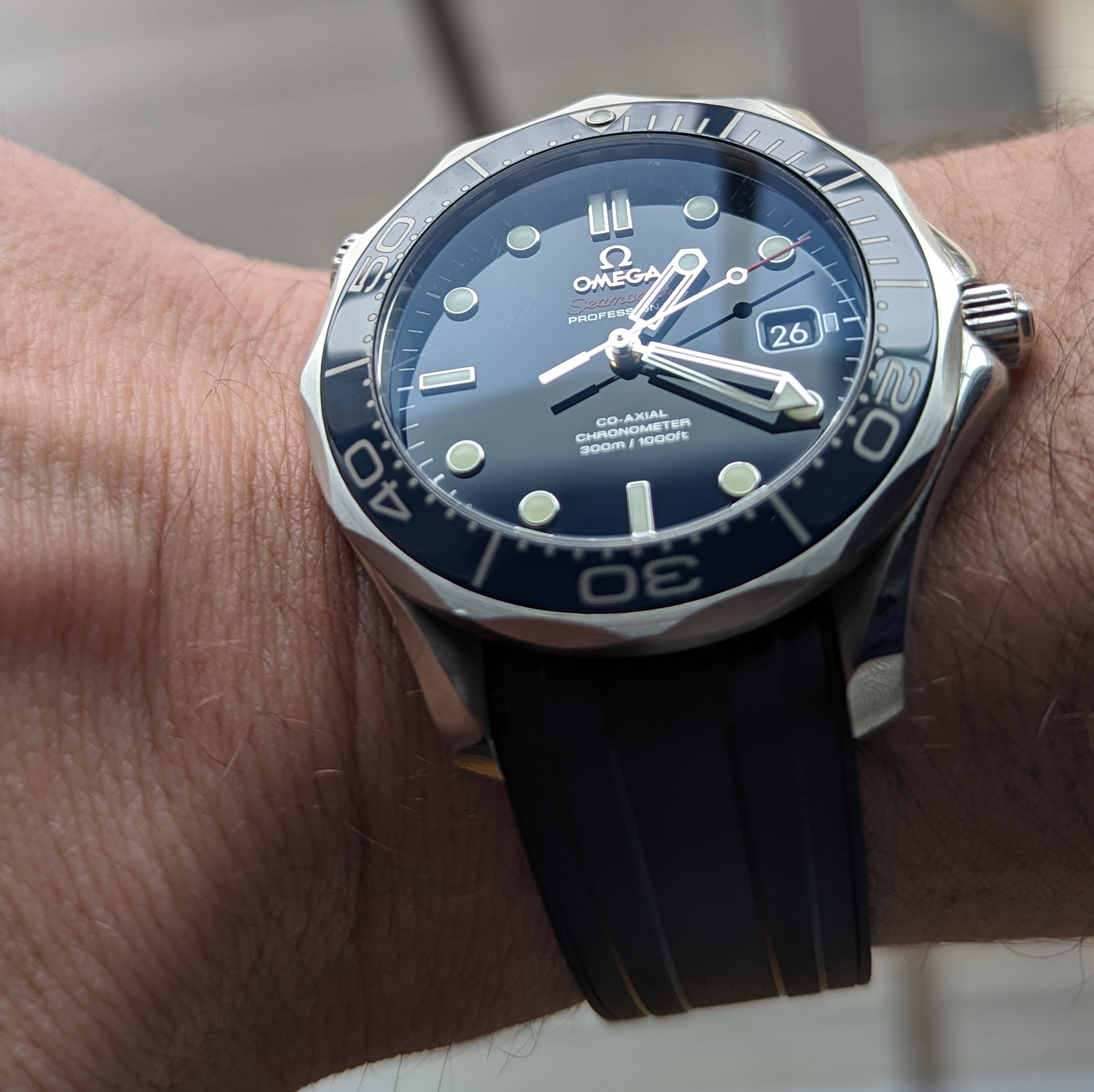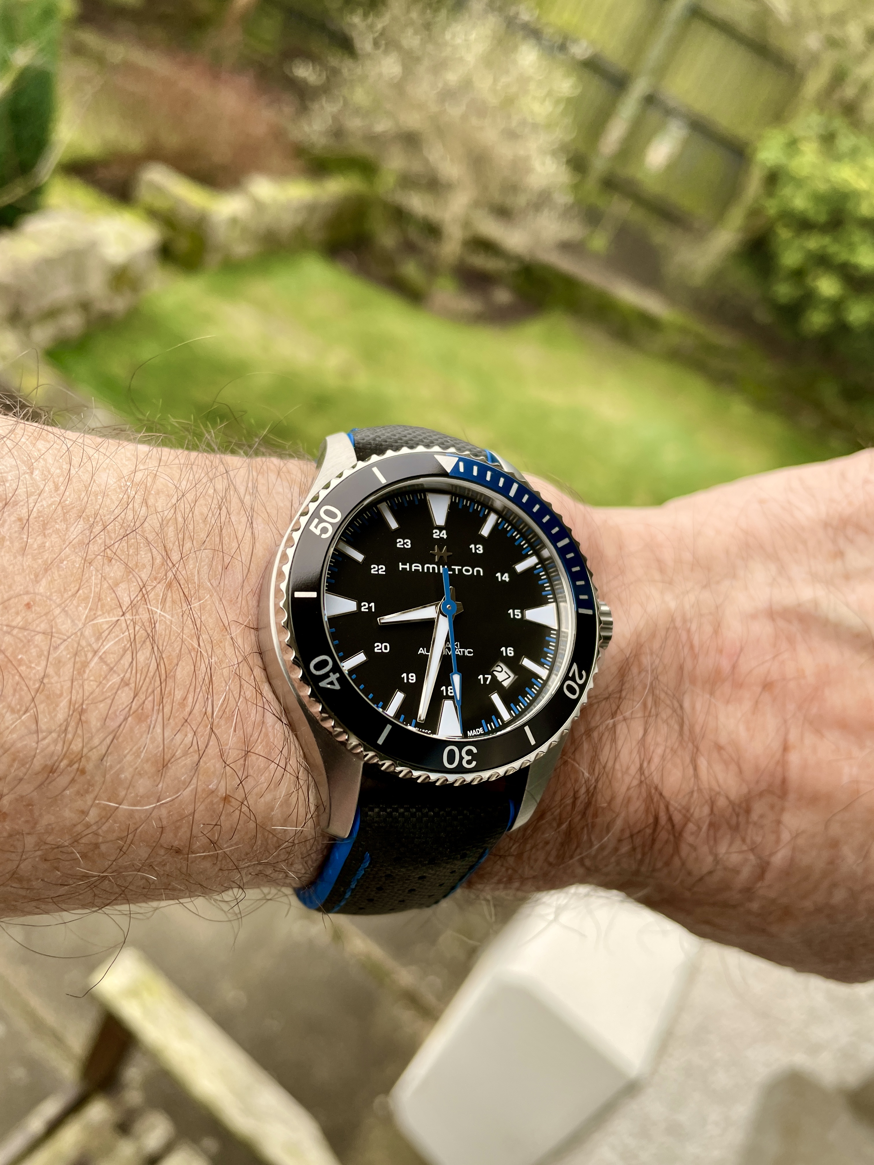 Time again to exercise the Bucherer two-register chronograph with a 17-jewel Landeron calibre 48 movement. The calibre 48 was introduced circa 1937, and produced until 1970. This one is in a gold filled “clamshell” case with steel back, and I estimate it would be circa mid 1950s. Close to 70 years old. I’ve owned it for about 20 years, but hadn’t worn it until I serviced it, early in January. (Finger mark on the balance cock no longer there since servicing!)