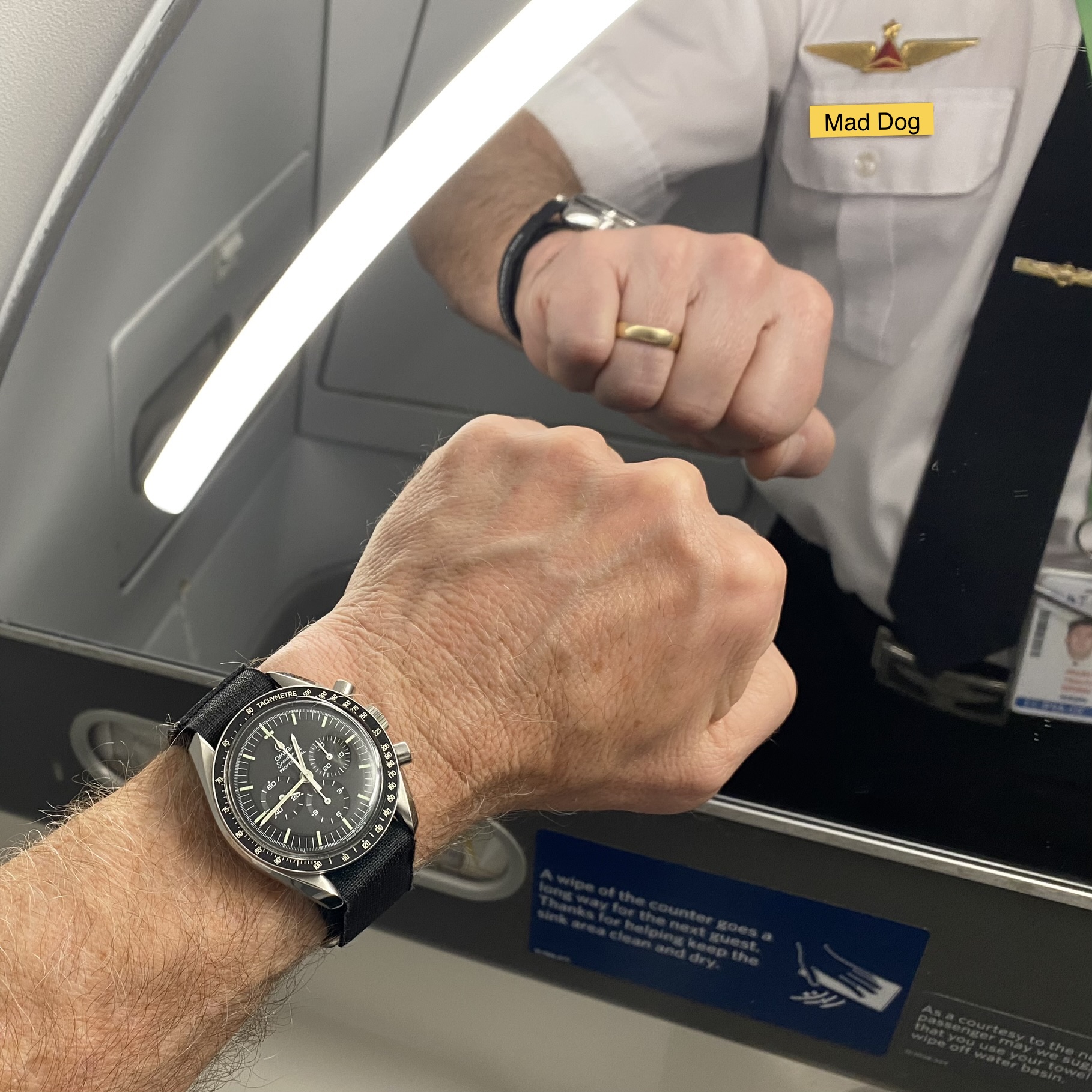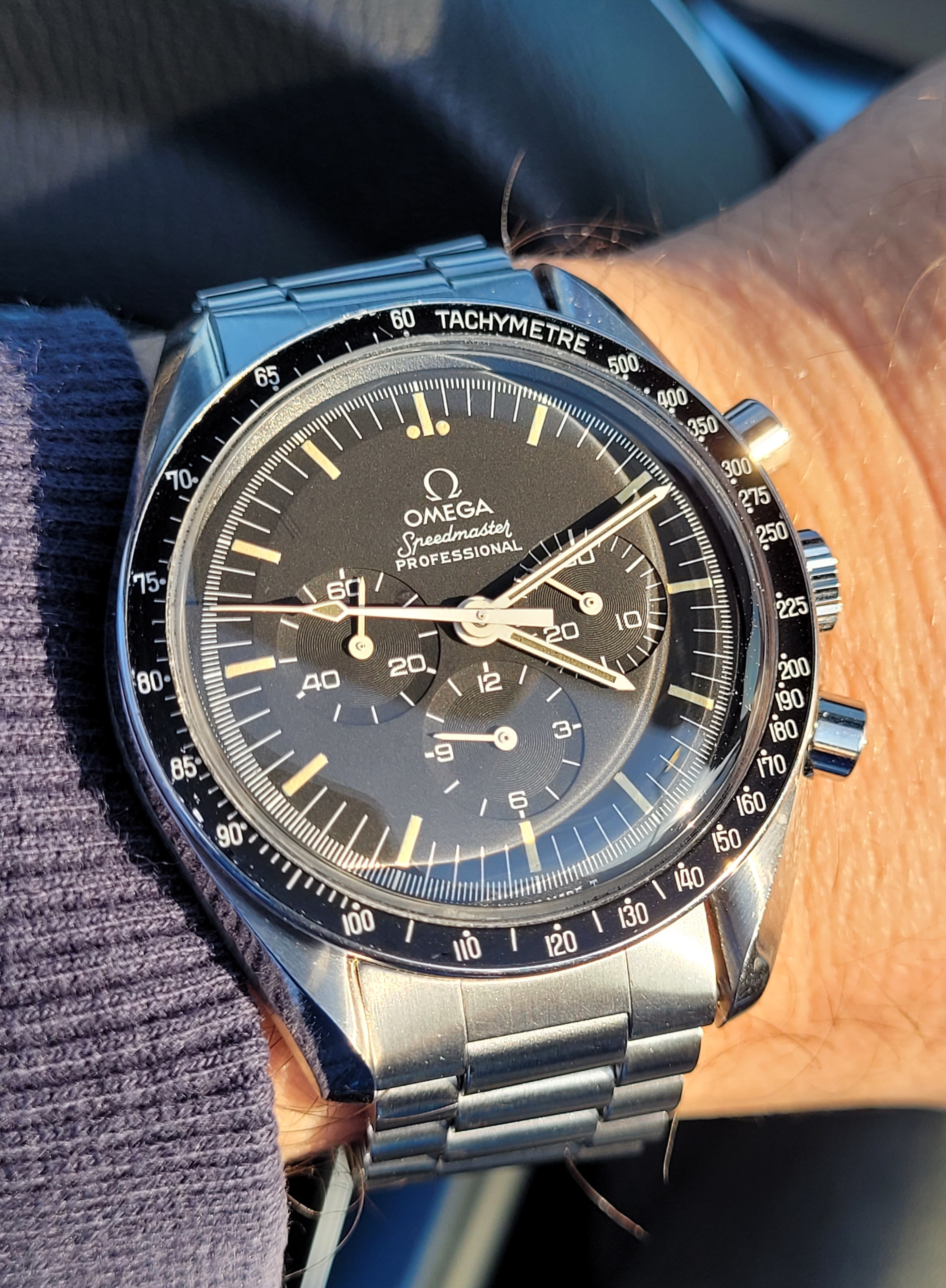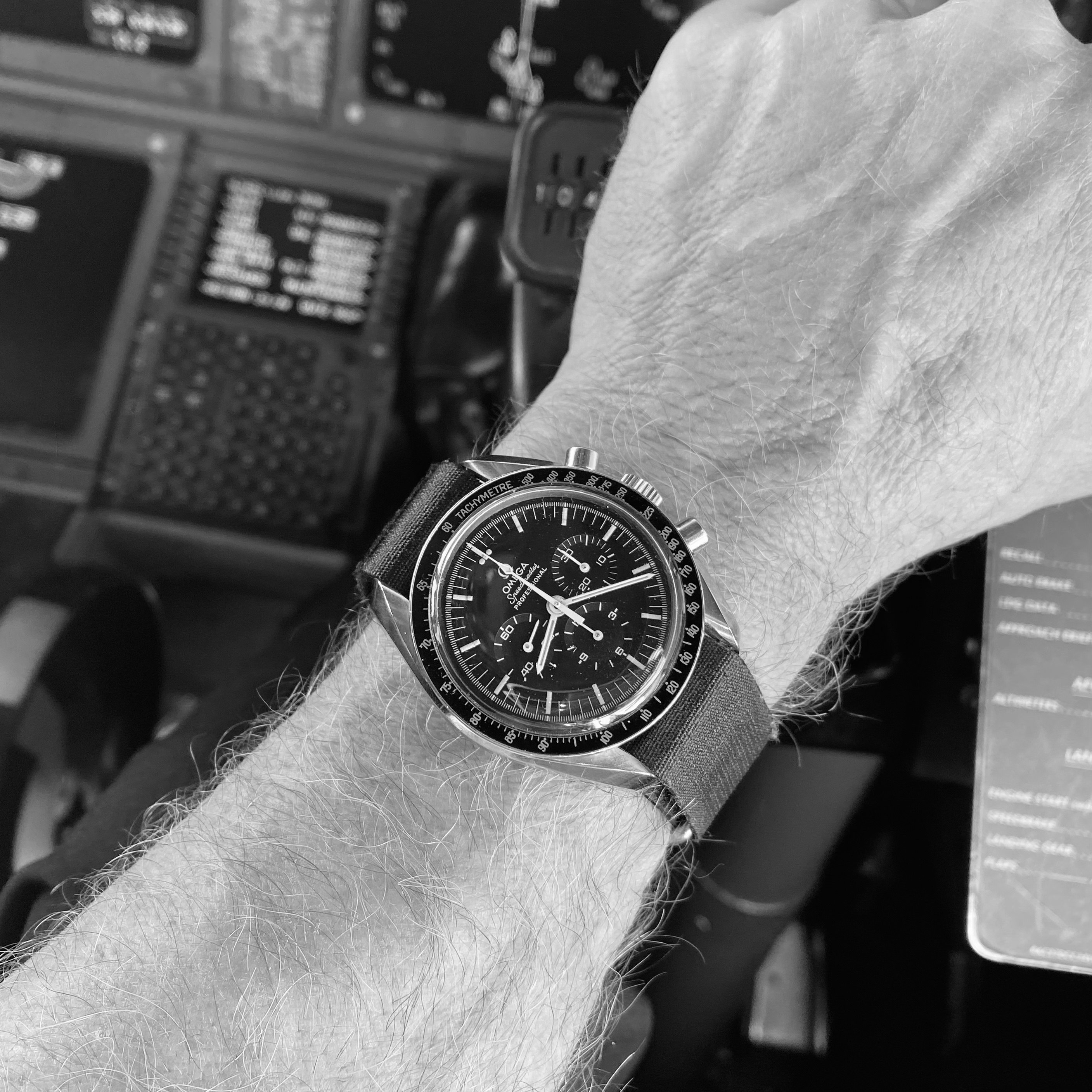 Speedy Tuesday from the pointy end…145.022-71 on a modern Omega NASA strap…and protected [from pointy end watch foes] via a run-of-the-mill sweat band…