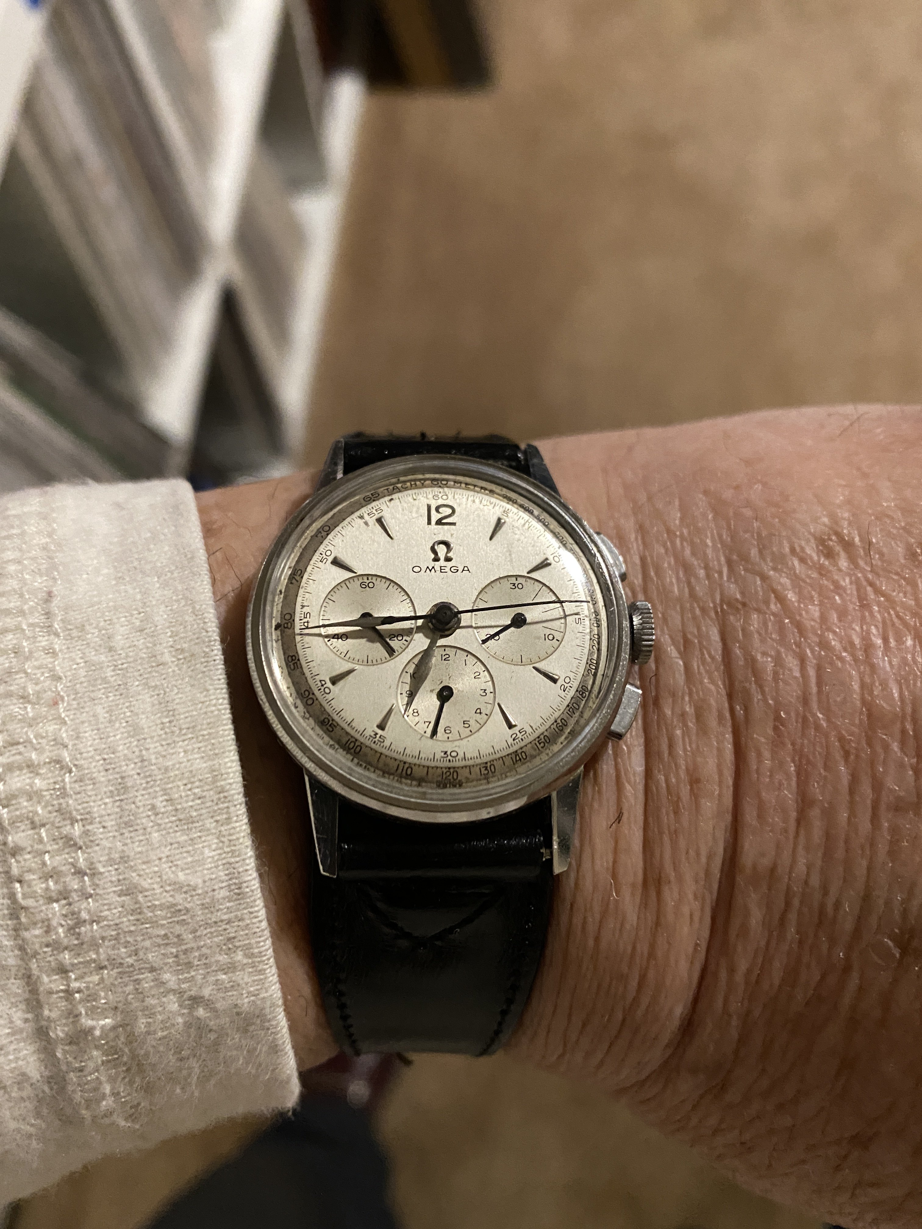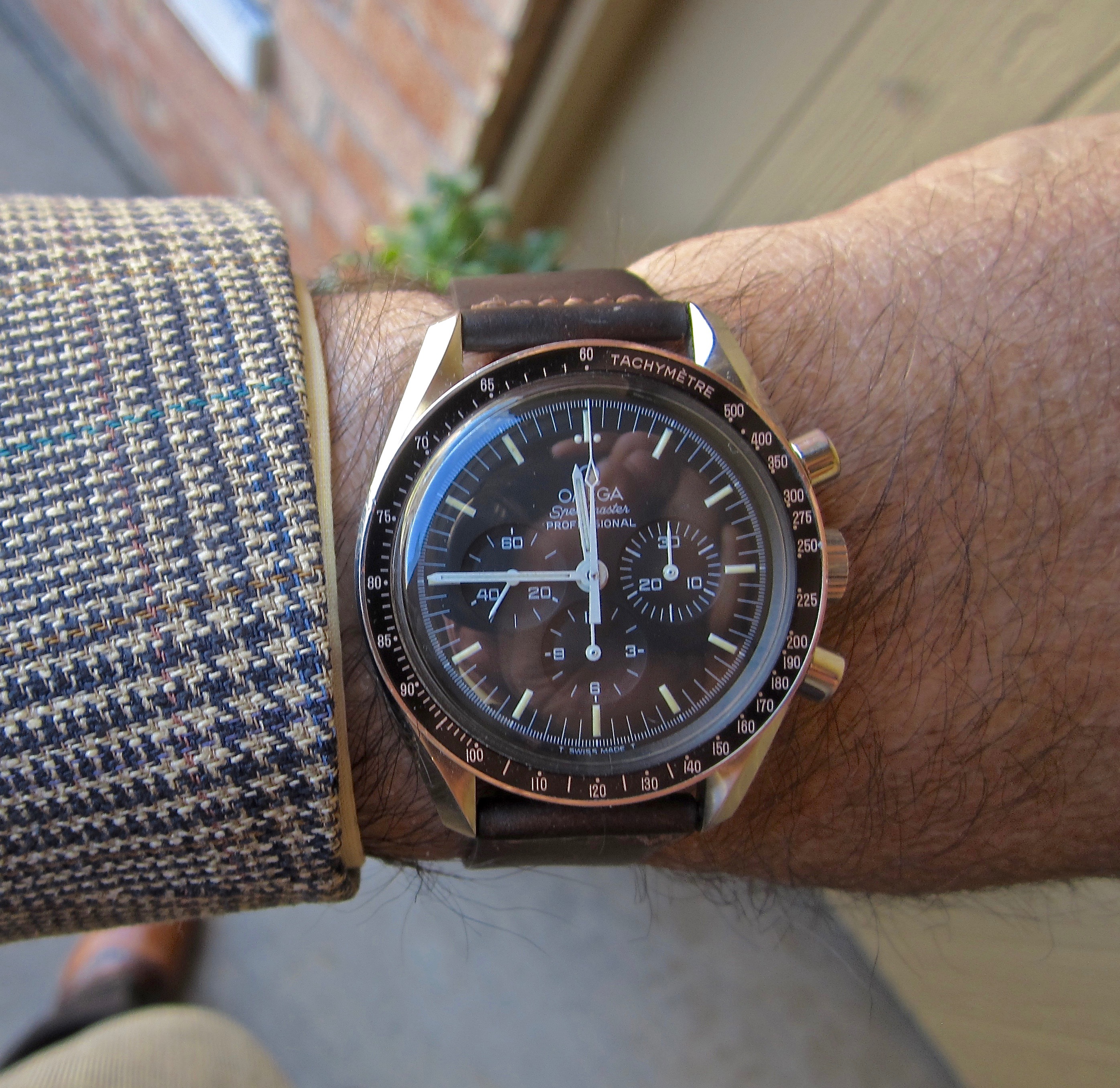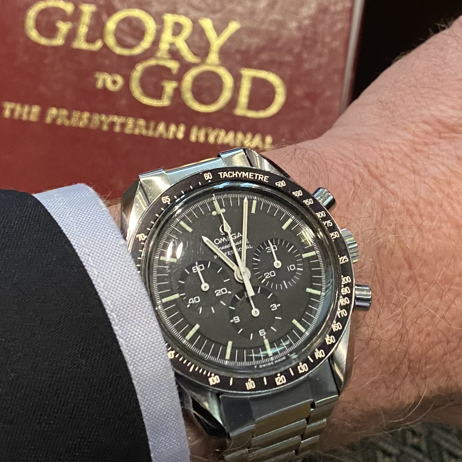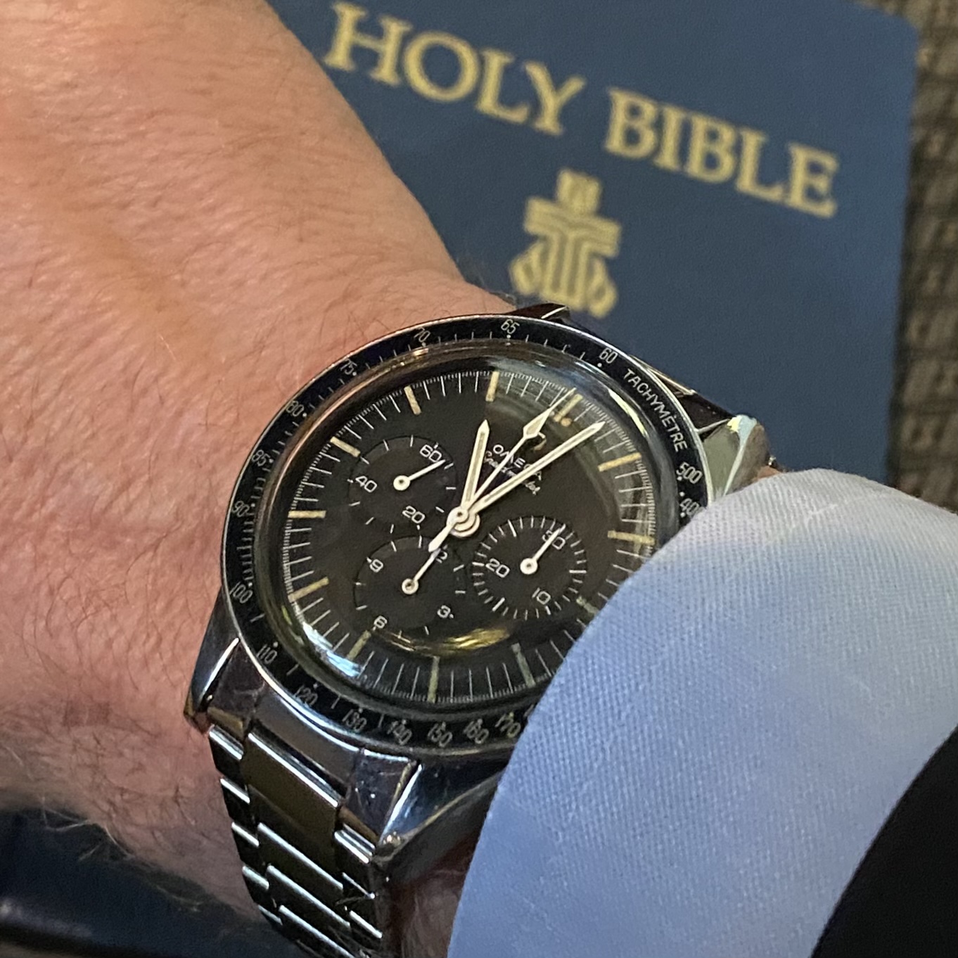Home from church. The Speedmaster isn't usually chosen for church duty, but I'm carrying on a week's test of its accuracy after its return from hospital. It's either being worn or is wound and idling on the dresser.