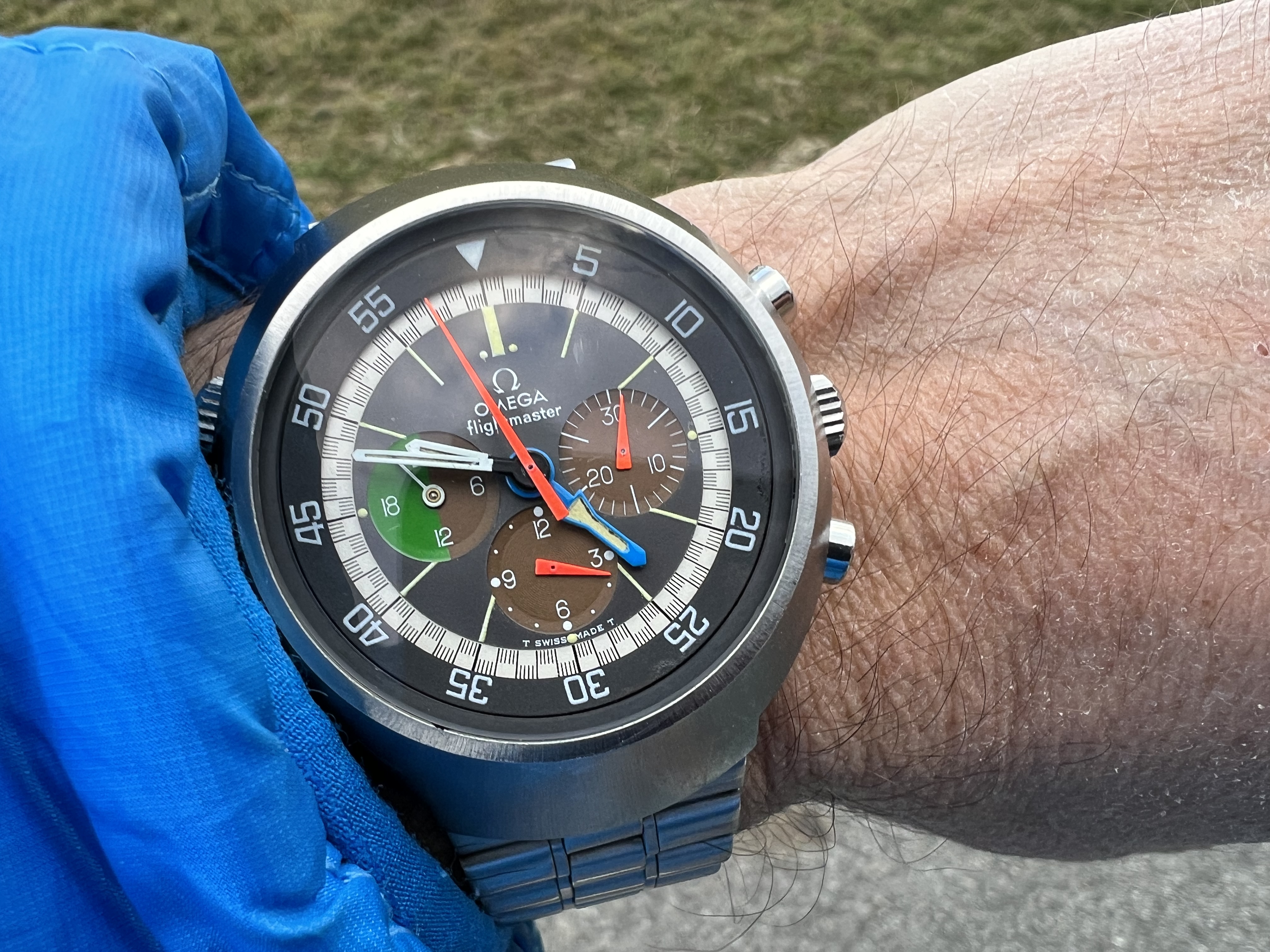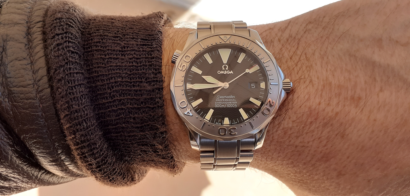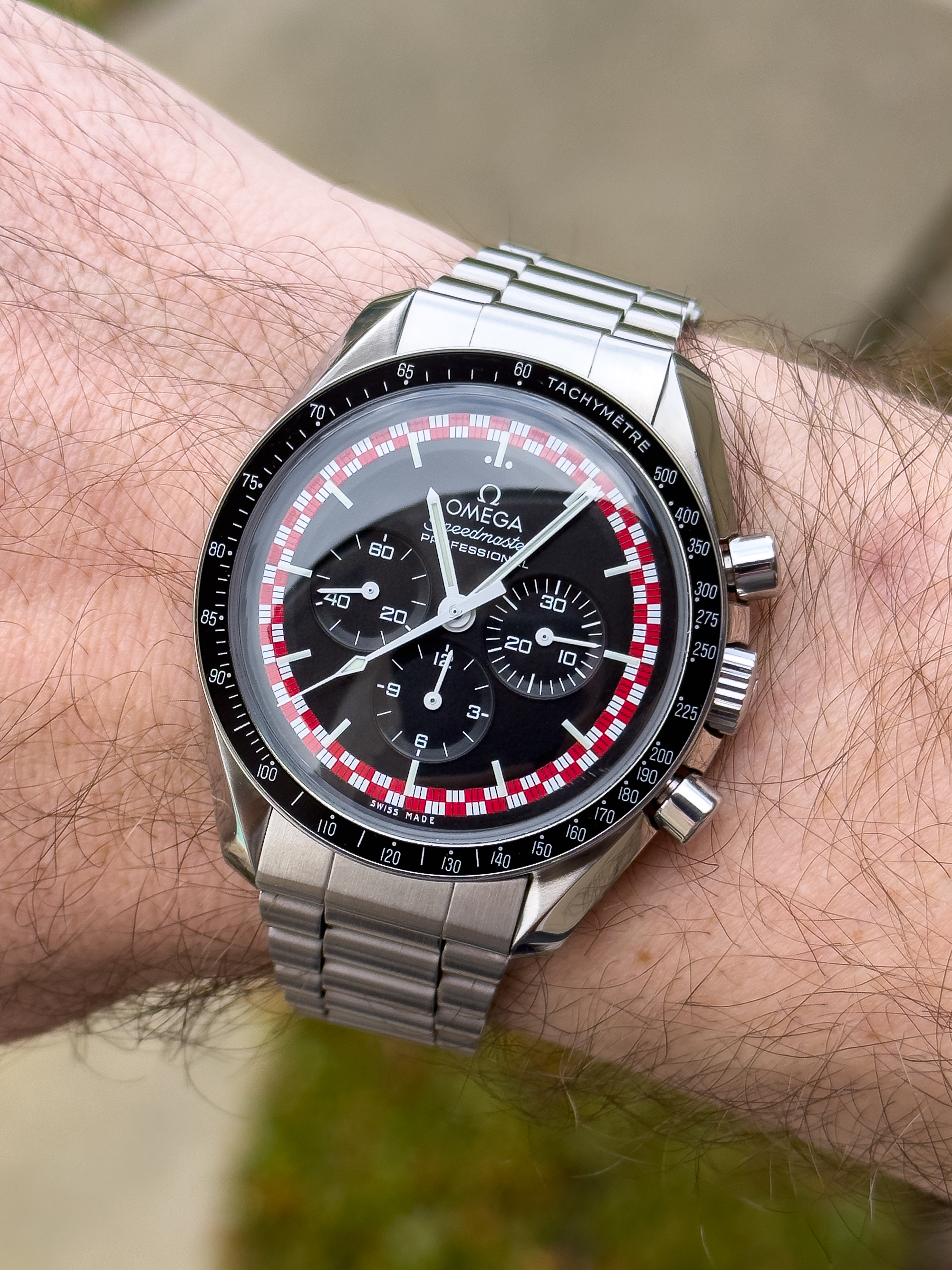 Home from church. The Speedmaster isn't usually chosen for church duty, but I'm carrying on a week's test of its accuracy after its return from hospital. It's either being worn or is wound and idling on the dresser.