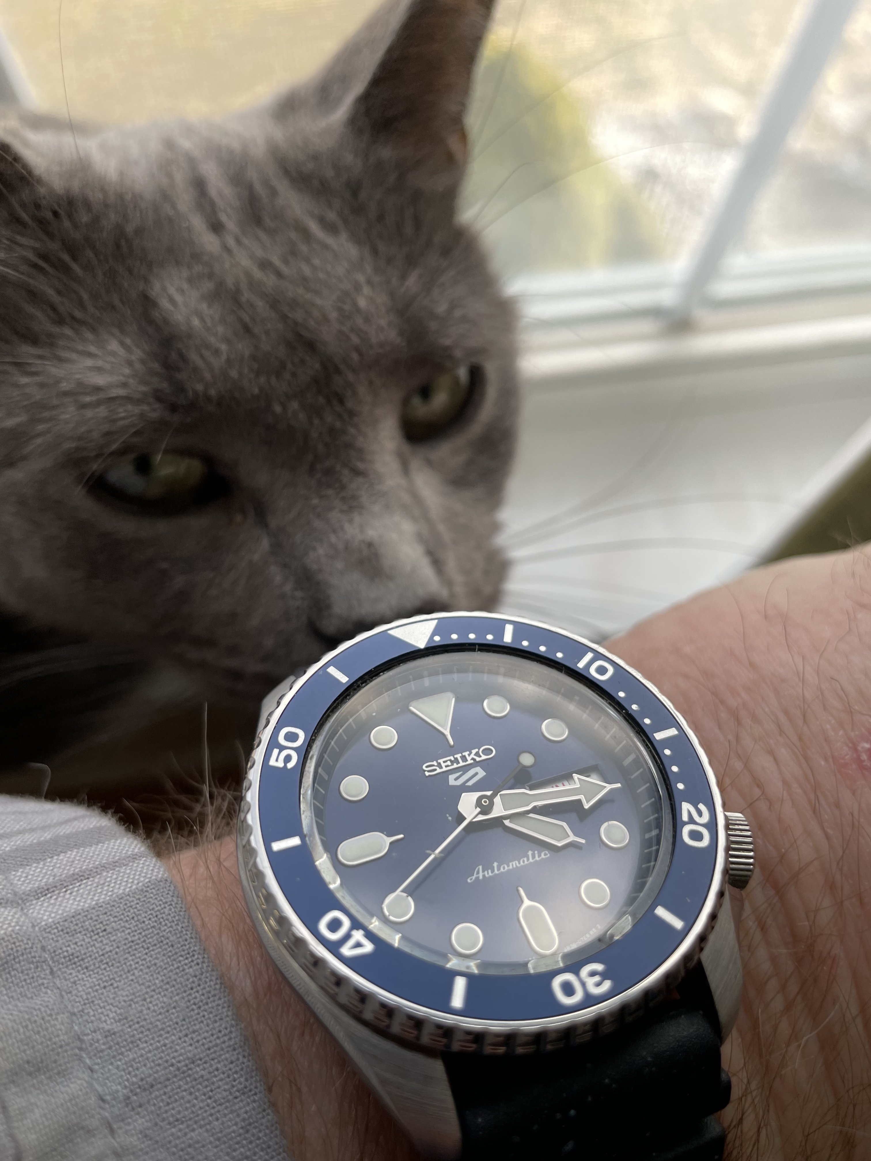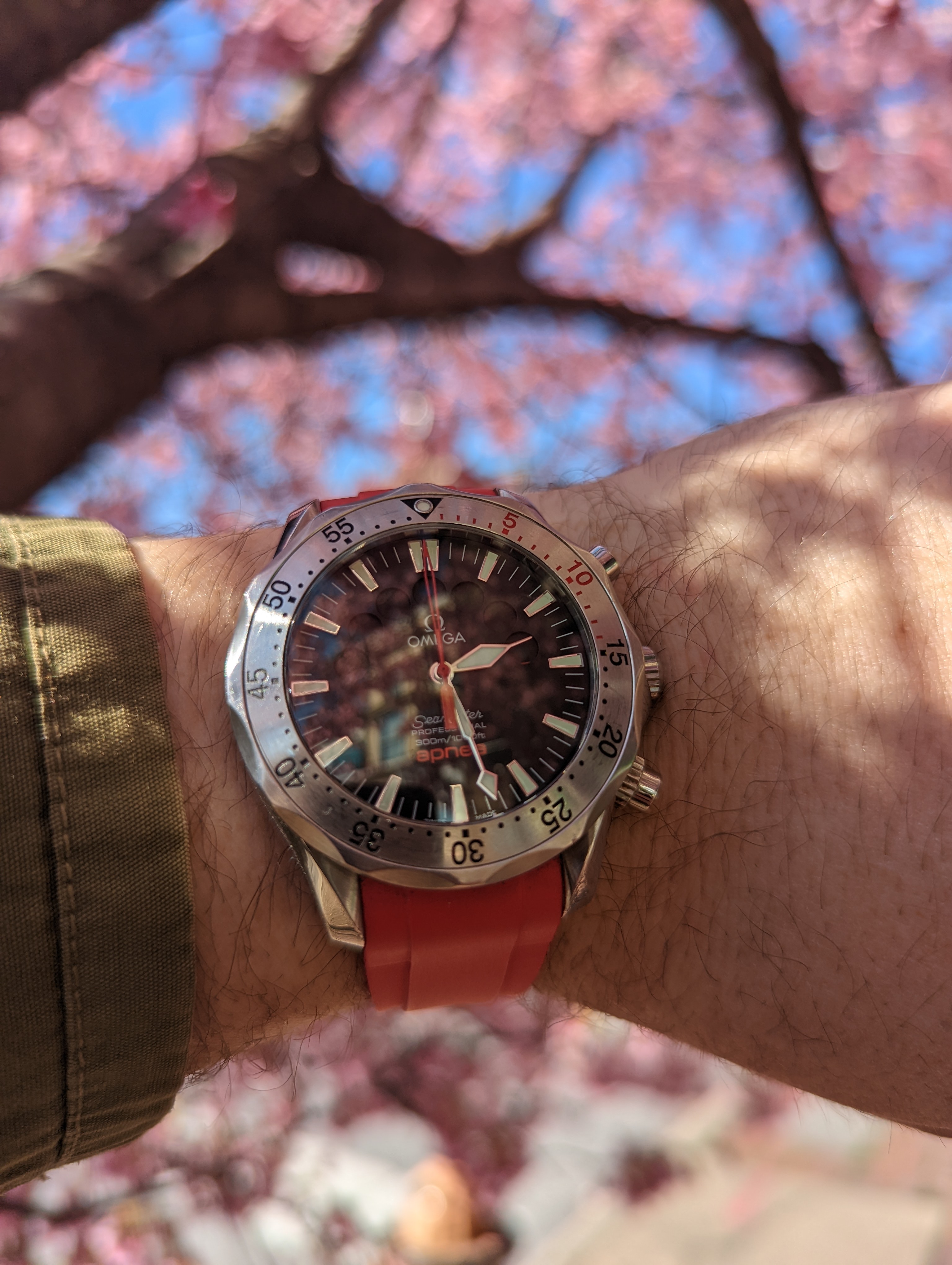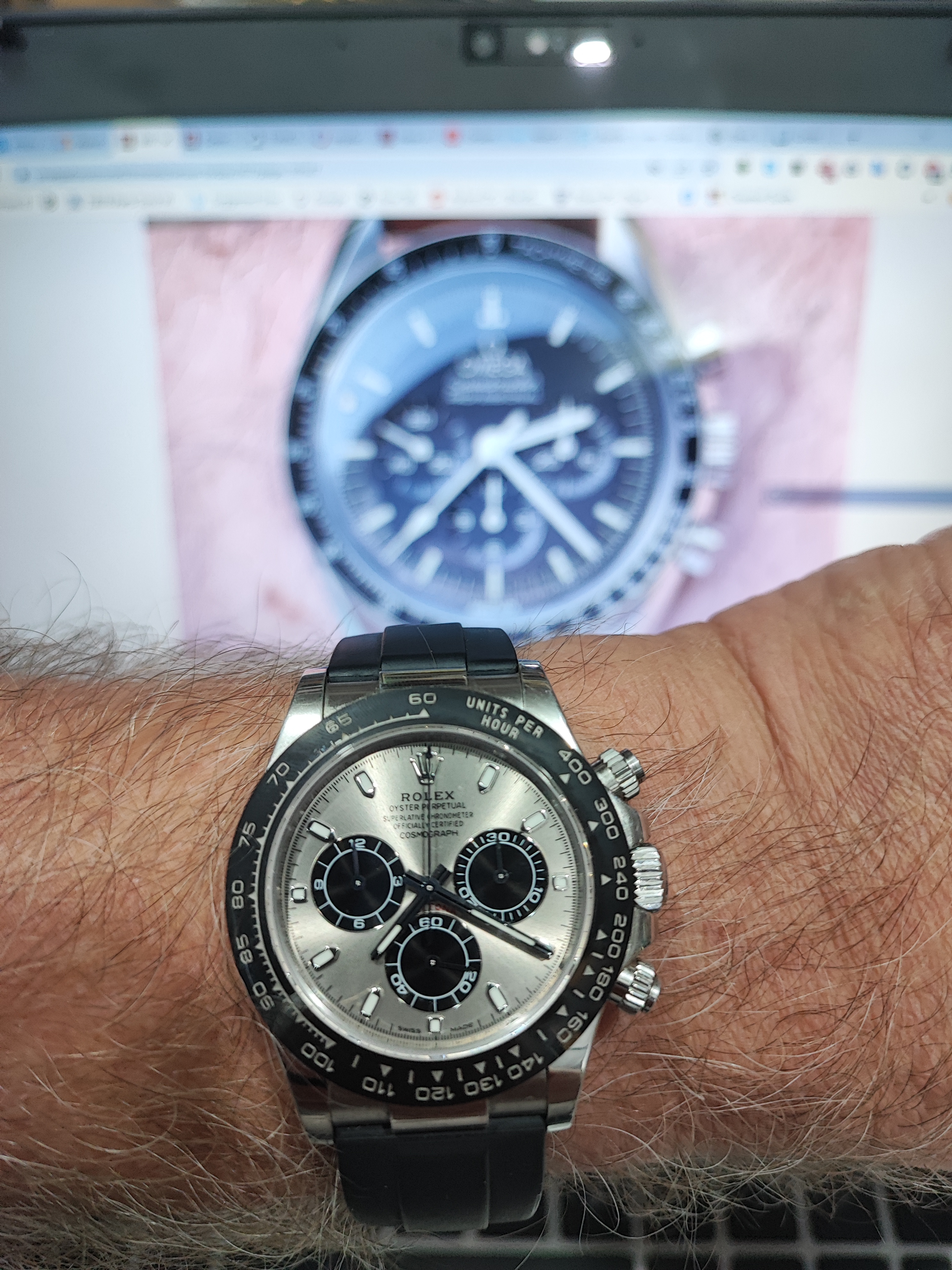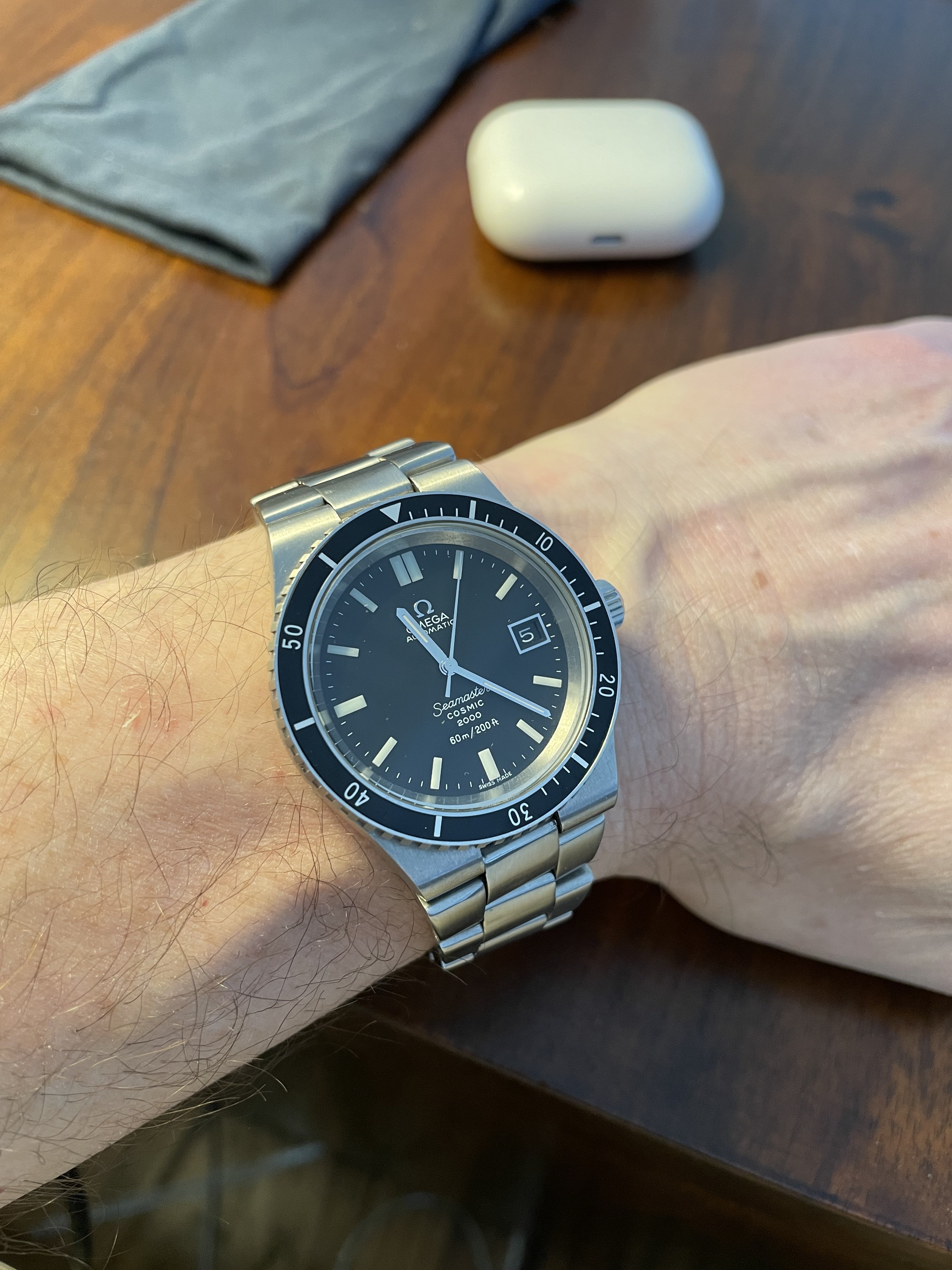 Home from church. The Speedmaster isn't usually chosen for church duty, but I'm carrying on a week's test of its accuracy after its return from hospital. It's either being worn or is wound and idling on the dresser.