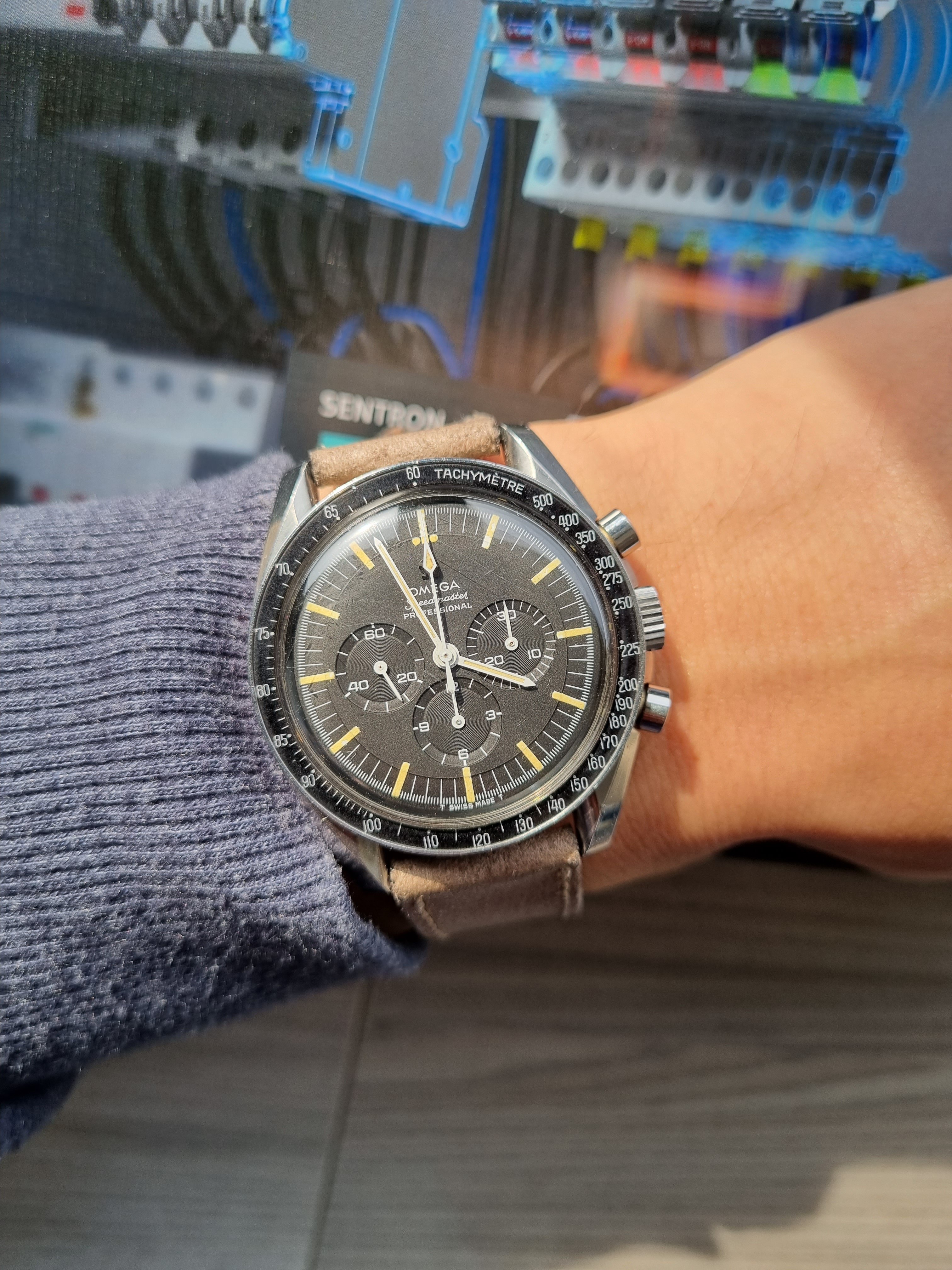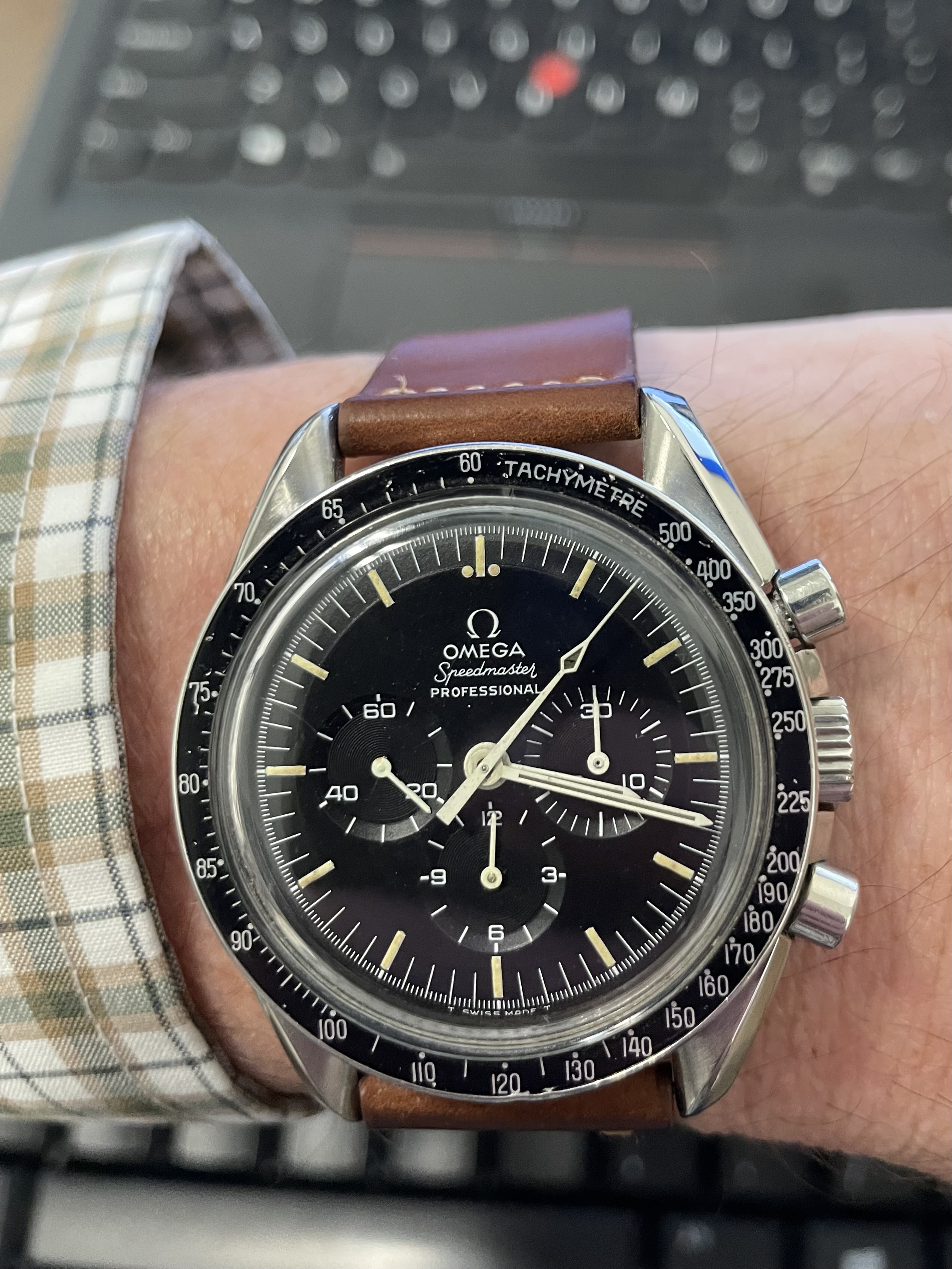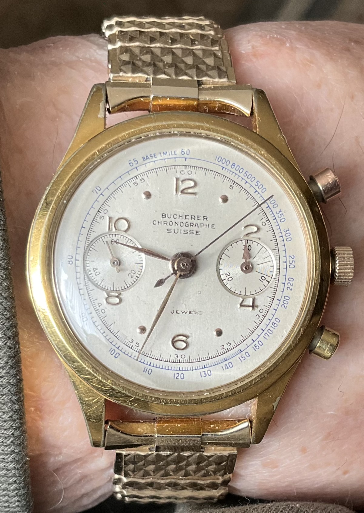 Again (still), my Bucherer two register chronograph with Landeron calibre 48 movement, circa mid to late 1950s. Gold filled “clamshell” case. I know it is blasphemy to upload any chronograph other than a Speedmaster, on Tuesday, but such is life. My Speedmasters will simply have to wait their turn.