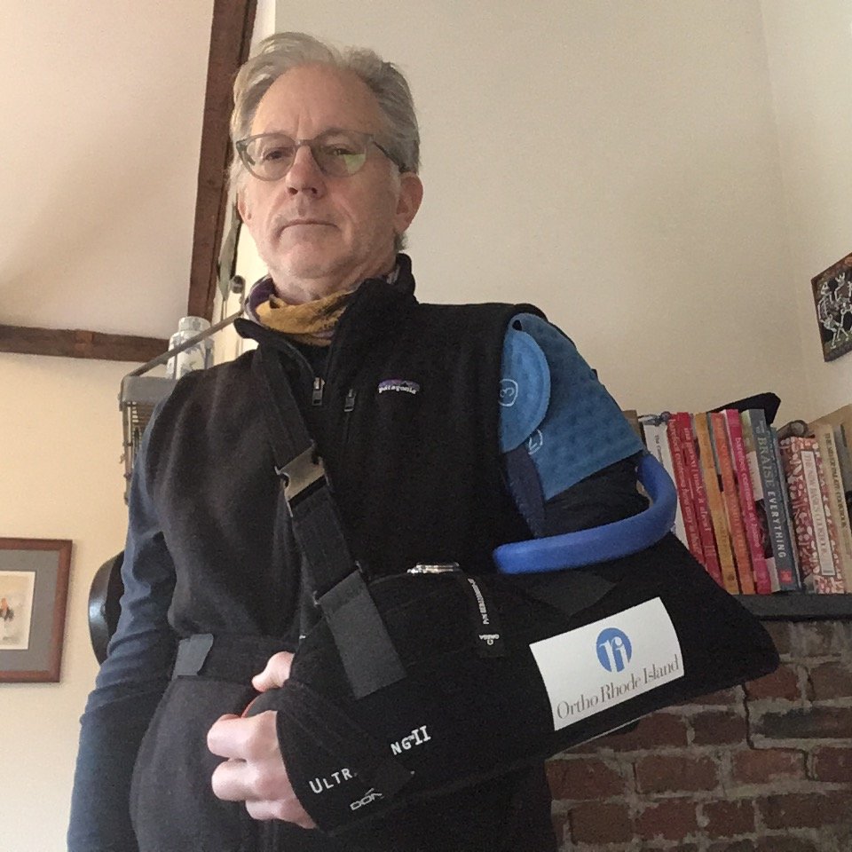 Well, it looks like I’m wearing this goddamn contraption for the next six weeks following rotator cuff and bicep tendon surgery last Friday. Sorry if I don’t look too happy.