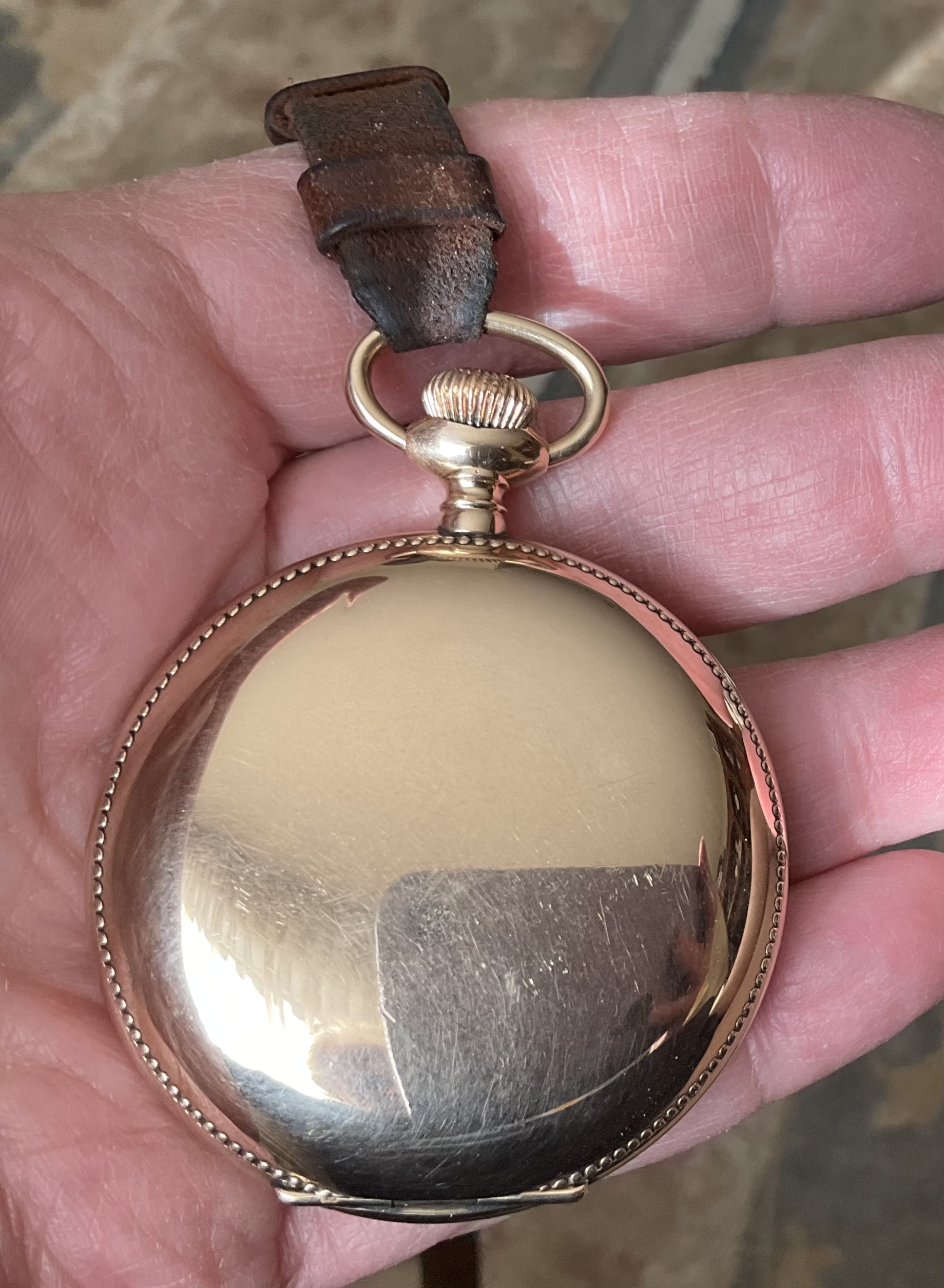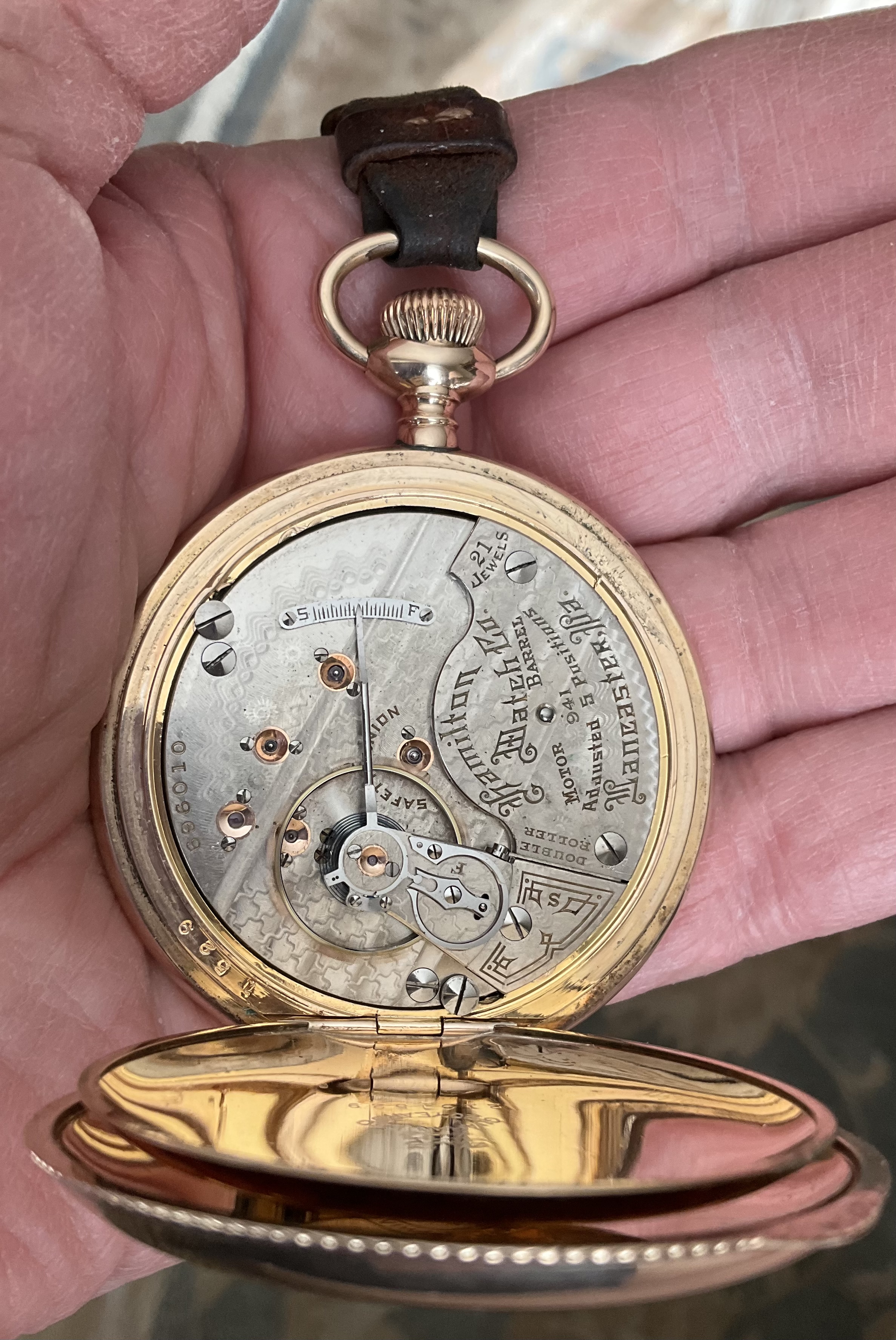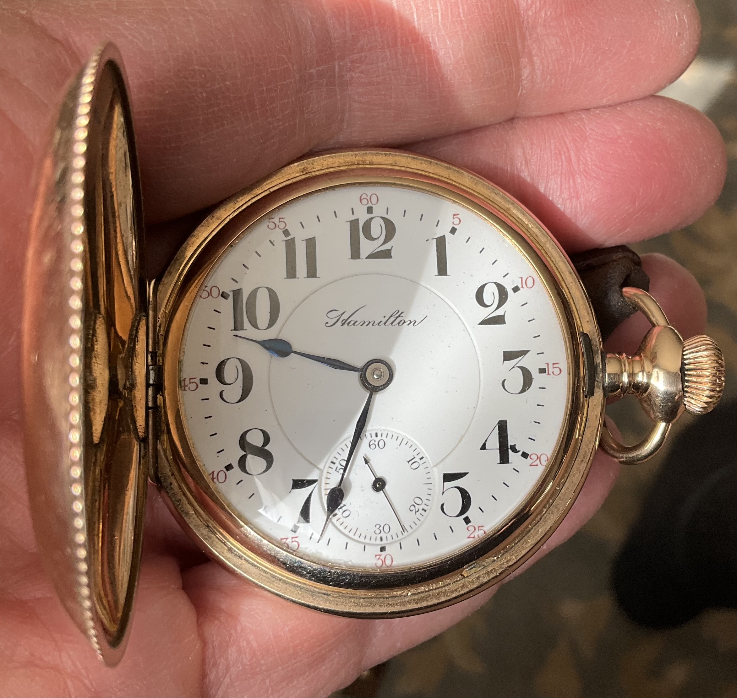 After several months of wearing my newly acquired 1877 Waltham hunter cased pocket watch, on Tuesday, I decided it was time to change to an old favourite that hasn’t seen daylight for three years. This is my 18-size, 21-jewel Hamilton, grade 941. This is the hunter cased version of the venerable Hamilton 940, one of the most popular of the 18-size Hamiltons for railroad use. Not too many of these around, I find. The 941 is railroad grade, but not railroad approved because it is in a hunter case. Case by the Philadelphia Watch Case Co. is gold filled. Shown on my Dave K miracle braid lanyard. (One of three watches I’ll wear today. The others being my Speedmaster 345.0808, and my Bucherer two-register chronograph with the Landeron calibre 48 movement.) I must get around to finding something to time!