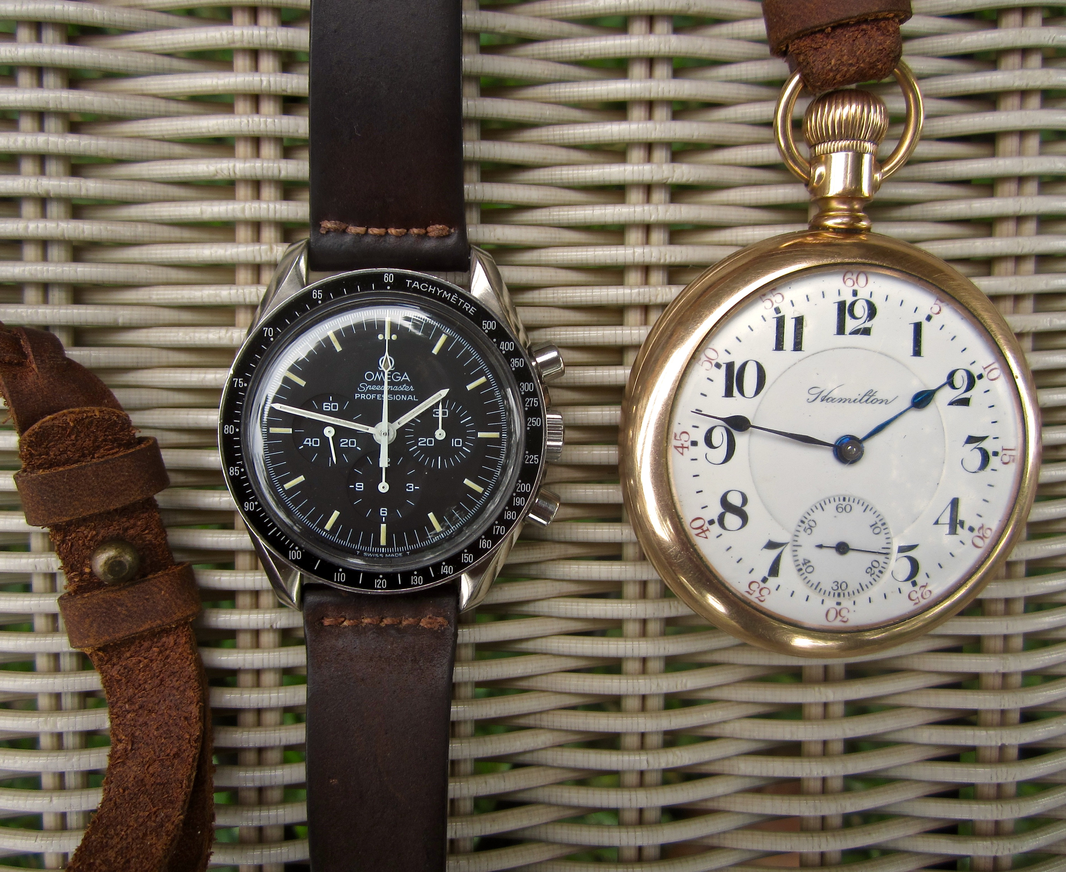 Posts 6,522 Likes 50,523 noelekal ·Apr 18, 2023·Home For Wayward Watches Speedy Tuesday watch photography. Speedmaster with a Hamilton 940 from 1911. The Hamilton's a big 'un! Neato "tire track" damaskeening on sparkling bright movement.