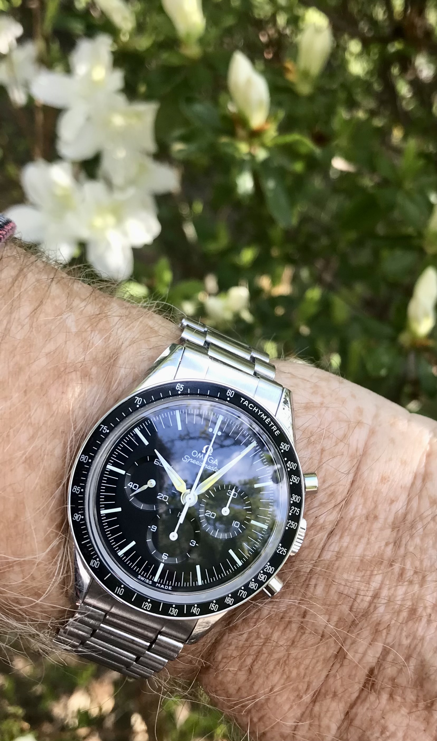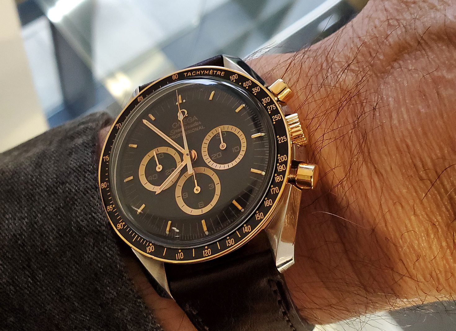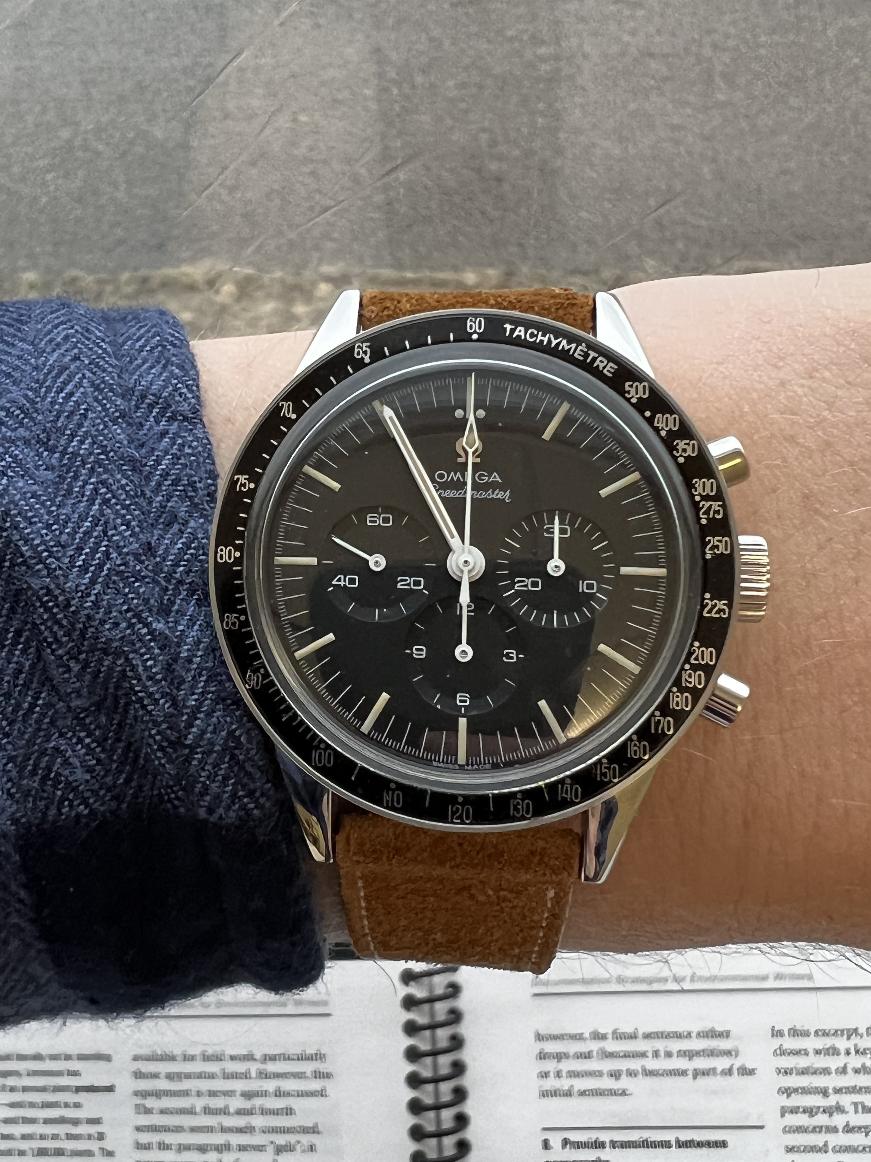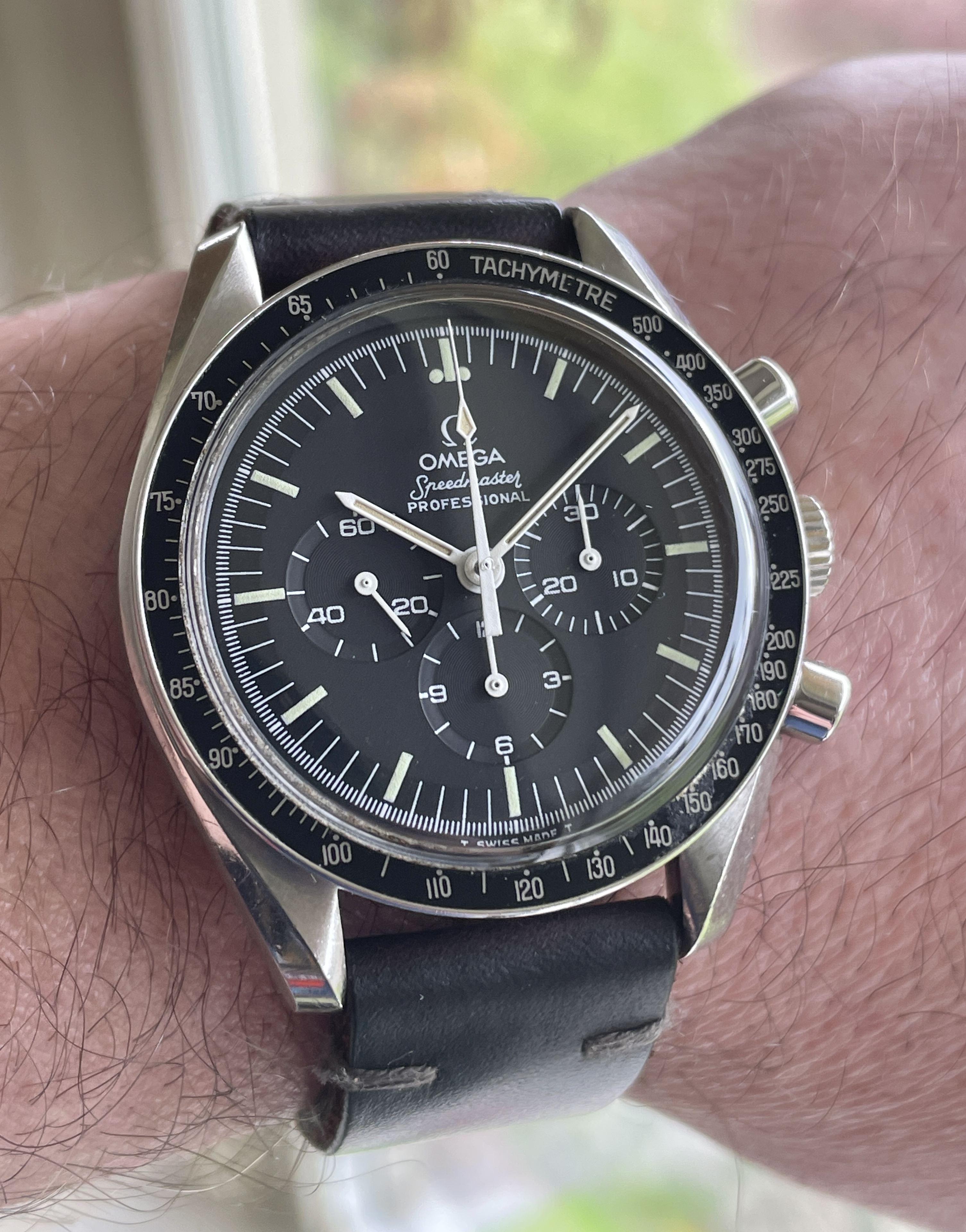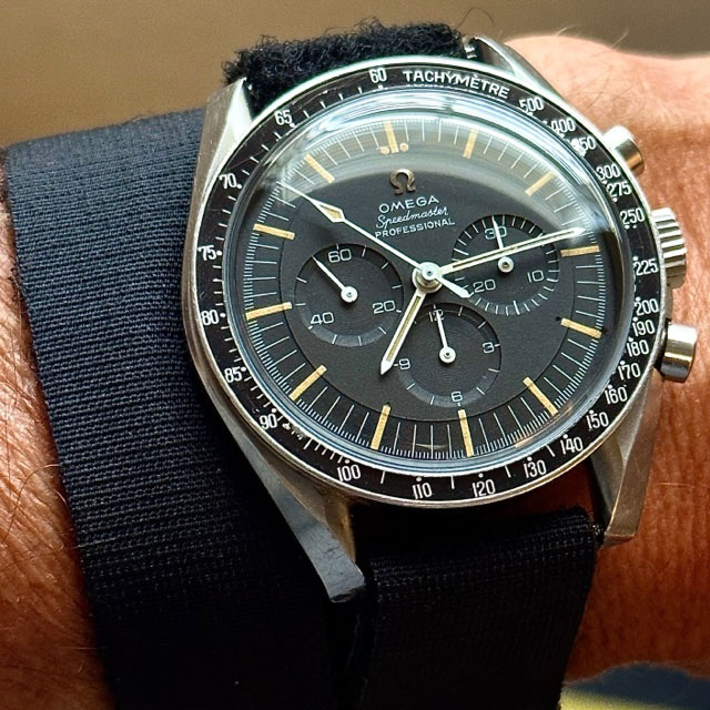 Last night I watched part of the National Geographic production "Apollo: Missions to the Moon" which apparently inspired me to go with the 'Aldrin Wrap' today, utilizing a Kizzi replica long velcro NASA strap. That film probably has more Speedmaster action per minute than any film out there, including live footage of a technician helping an astronaut don the long velcro strap over the Apollo spacesuit.