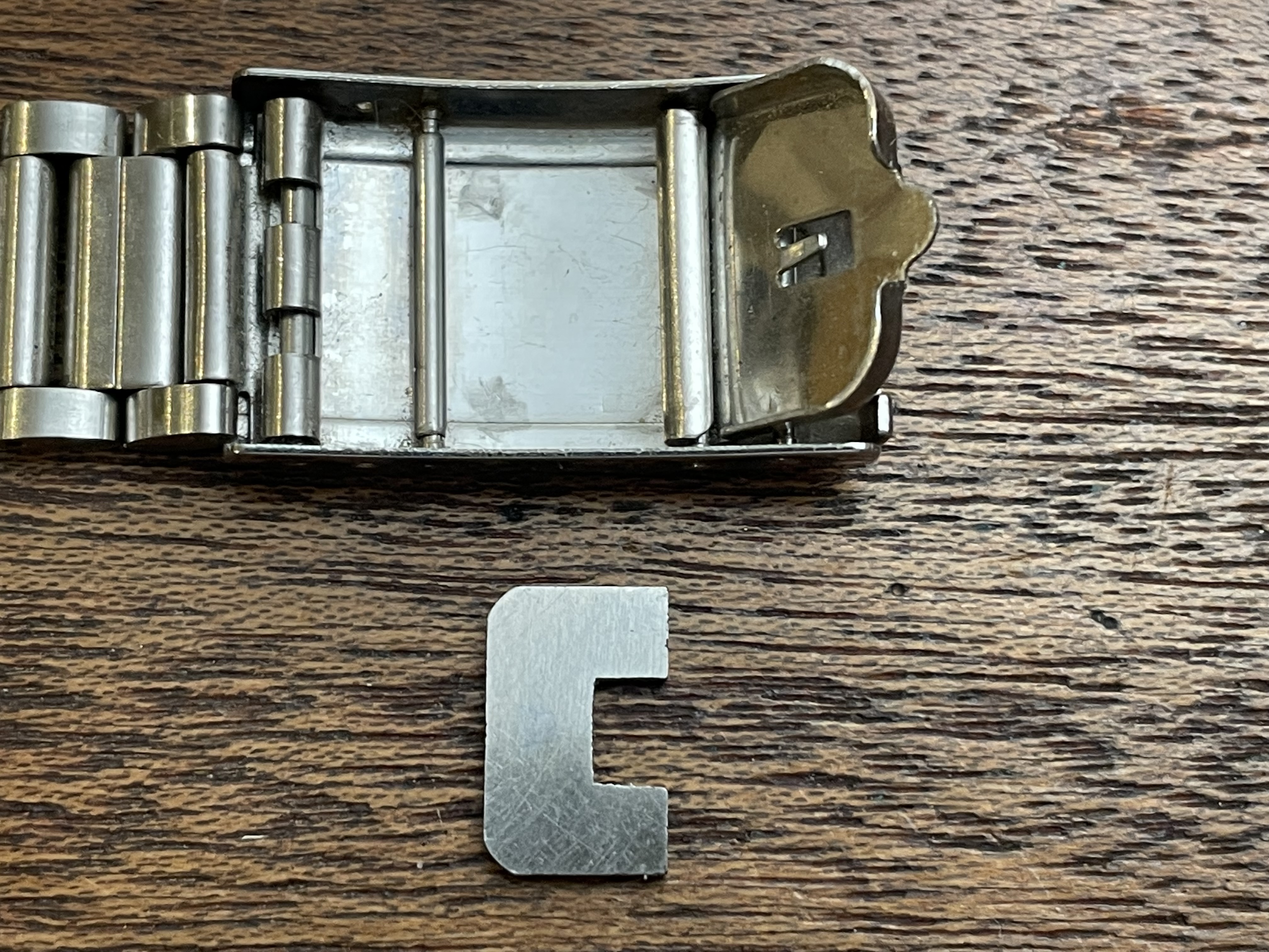 The time is set using a small horseshoe shaped magnet which is stored in a compartment in the bracelet clasp. Hours and minutes are advanced by touching the magnet to hour and minute sensors located on the case back.