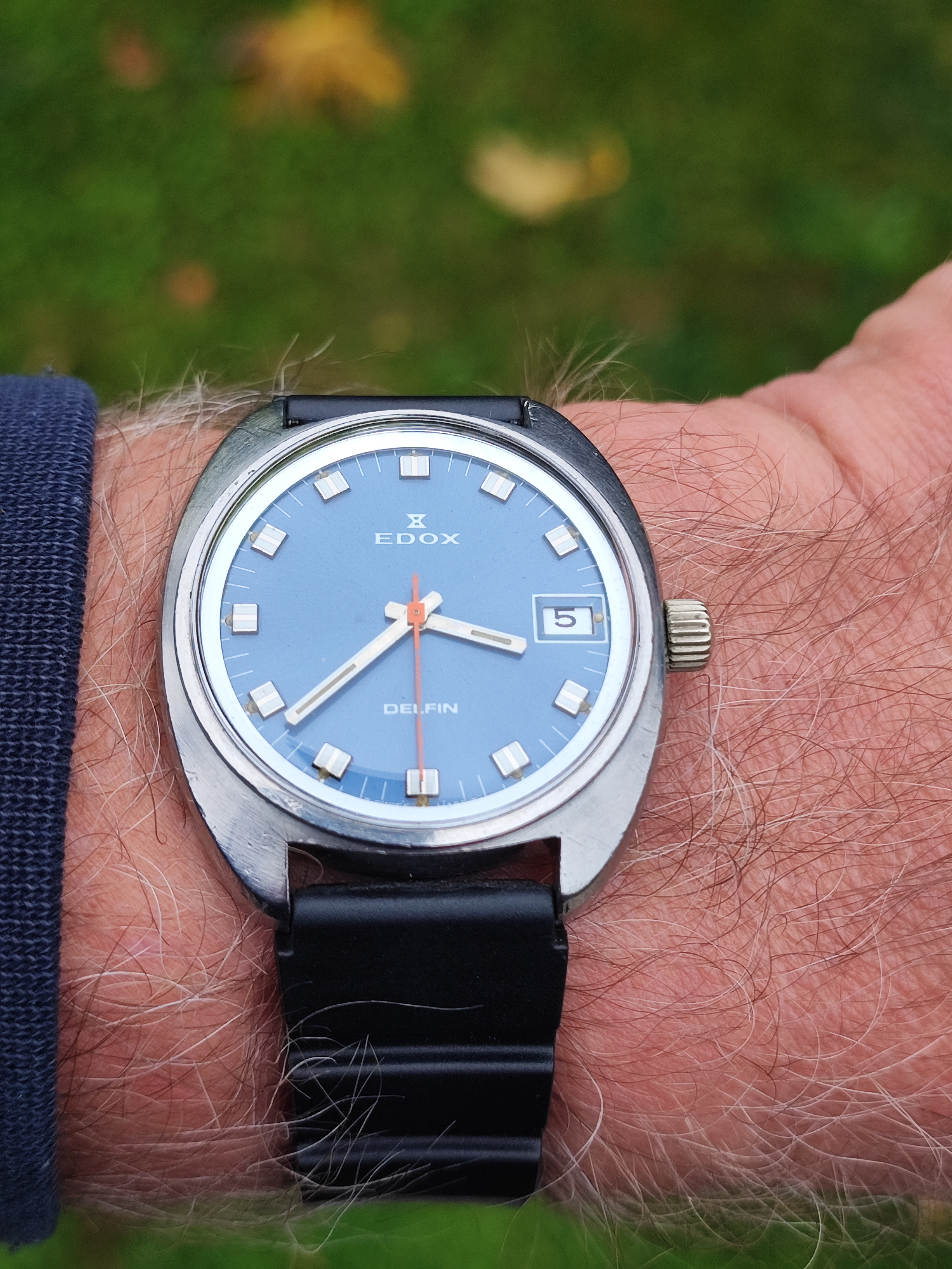 My new to me Edox Delphin ( dolphin I guess) today after a strap change to generic dive strap until I can find a more appropriate one.