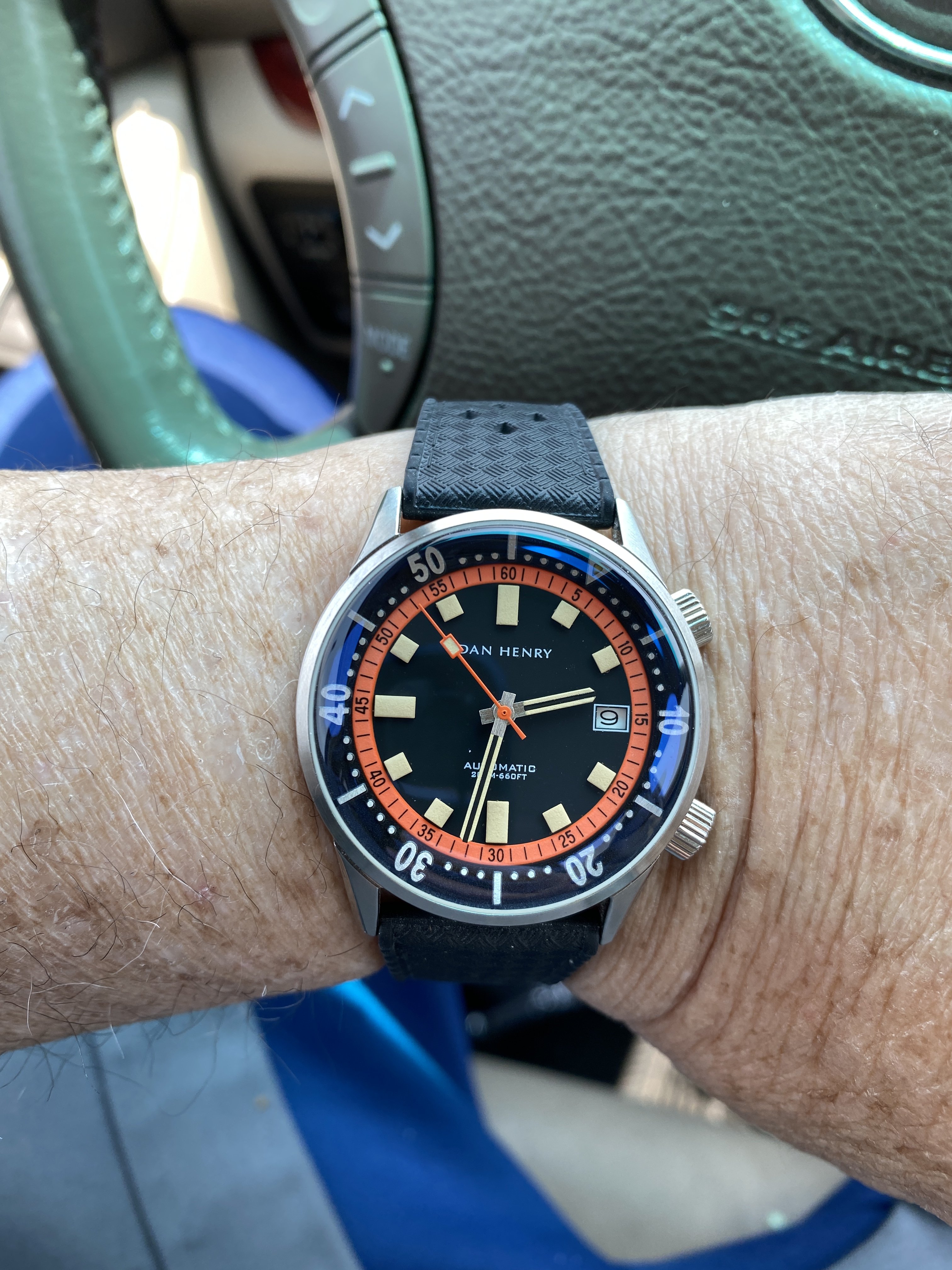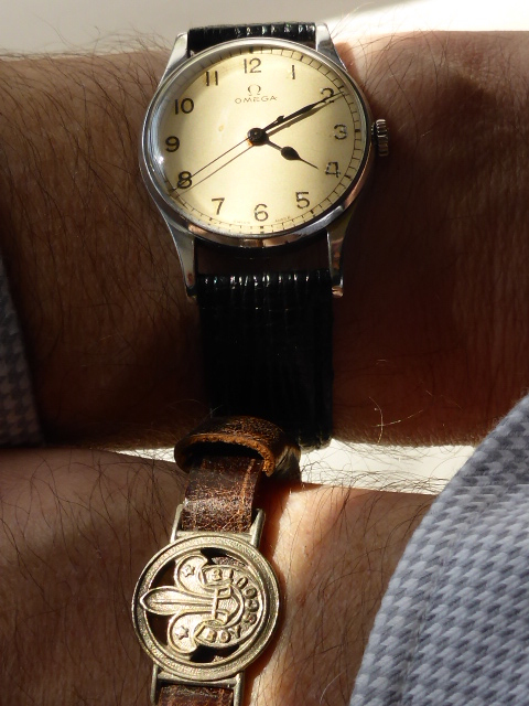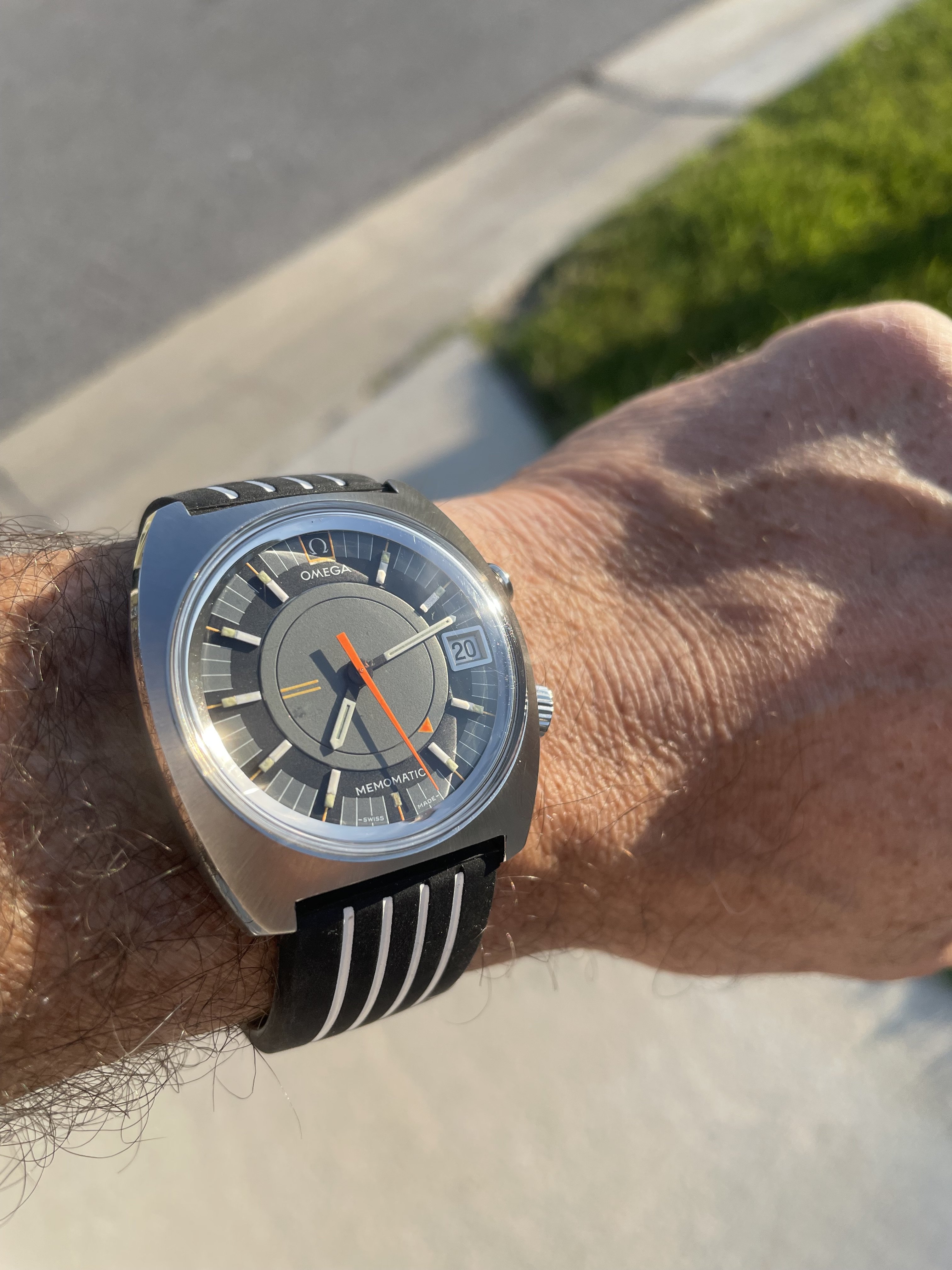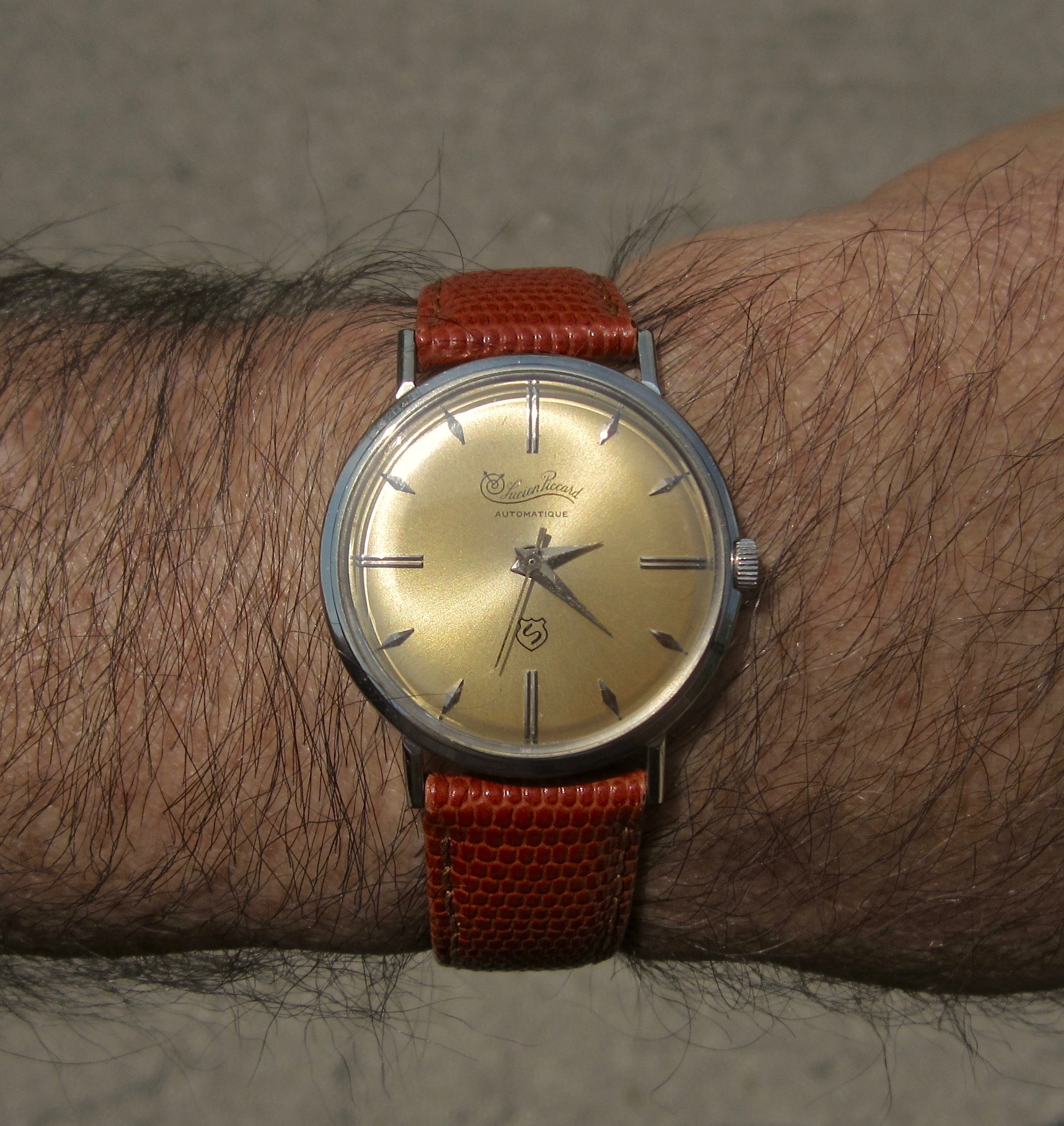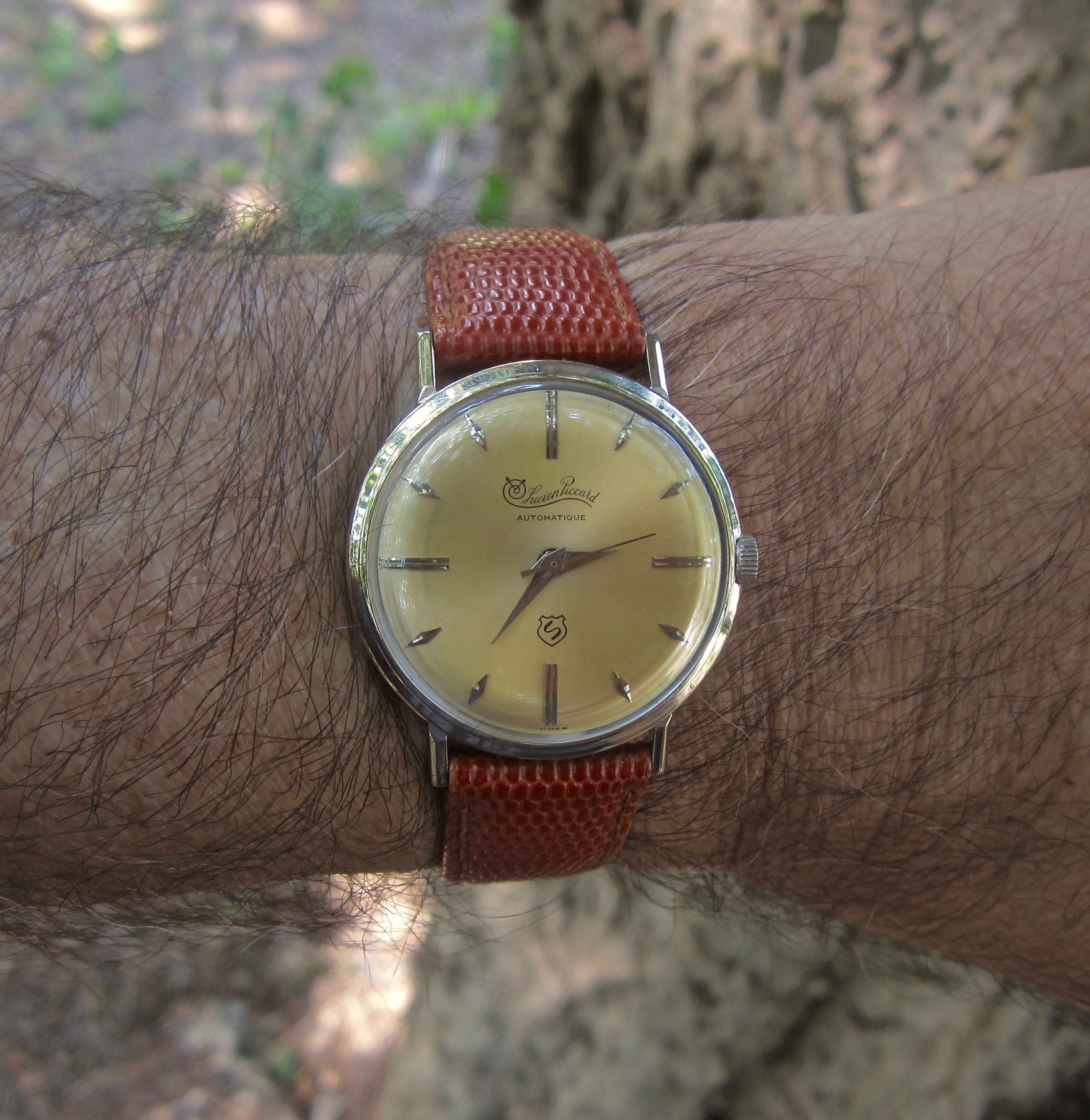 Saffron colored, very sunburst-y dial in a solid 14kt white gold case and on an orange lizard strap; Lucien Piccard was doing at least some of the Omega Seamaster Aqua Terra colors back in the late 1950s. Even vintage LP is not much respected, in an Invicta sort of way. I don't trot this one out too often though I like the white gold. It'll only do for casual wear for a few months in summer Texas heat. Ought to get a more subdued strap for it.