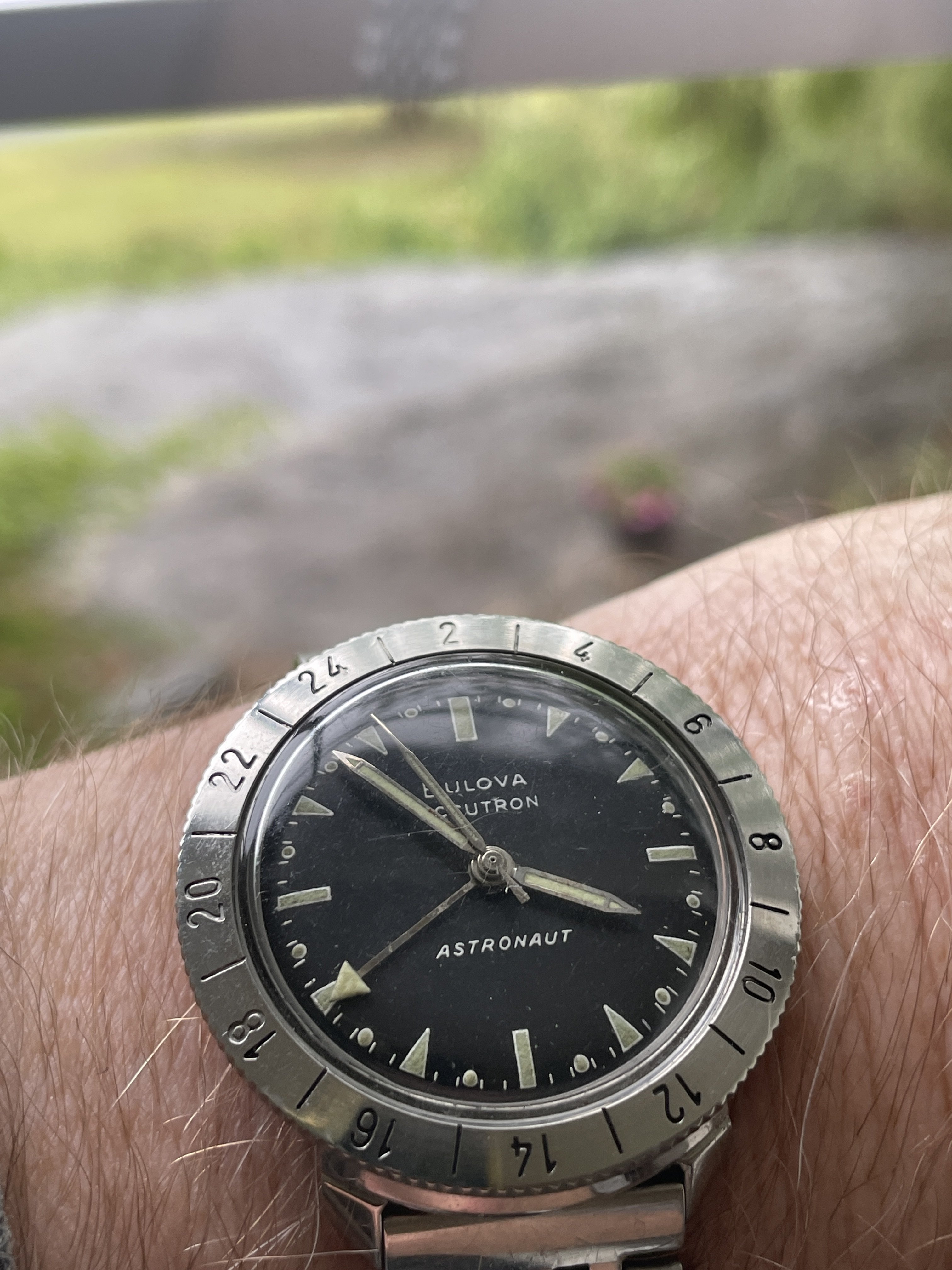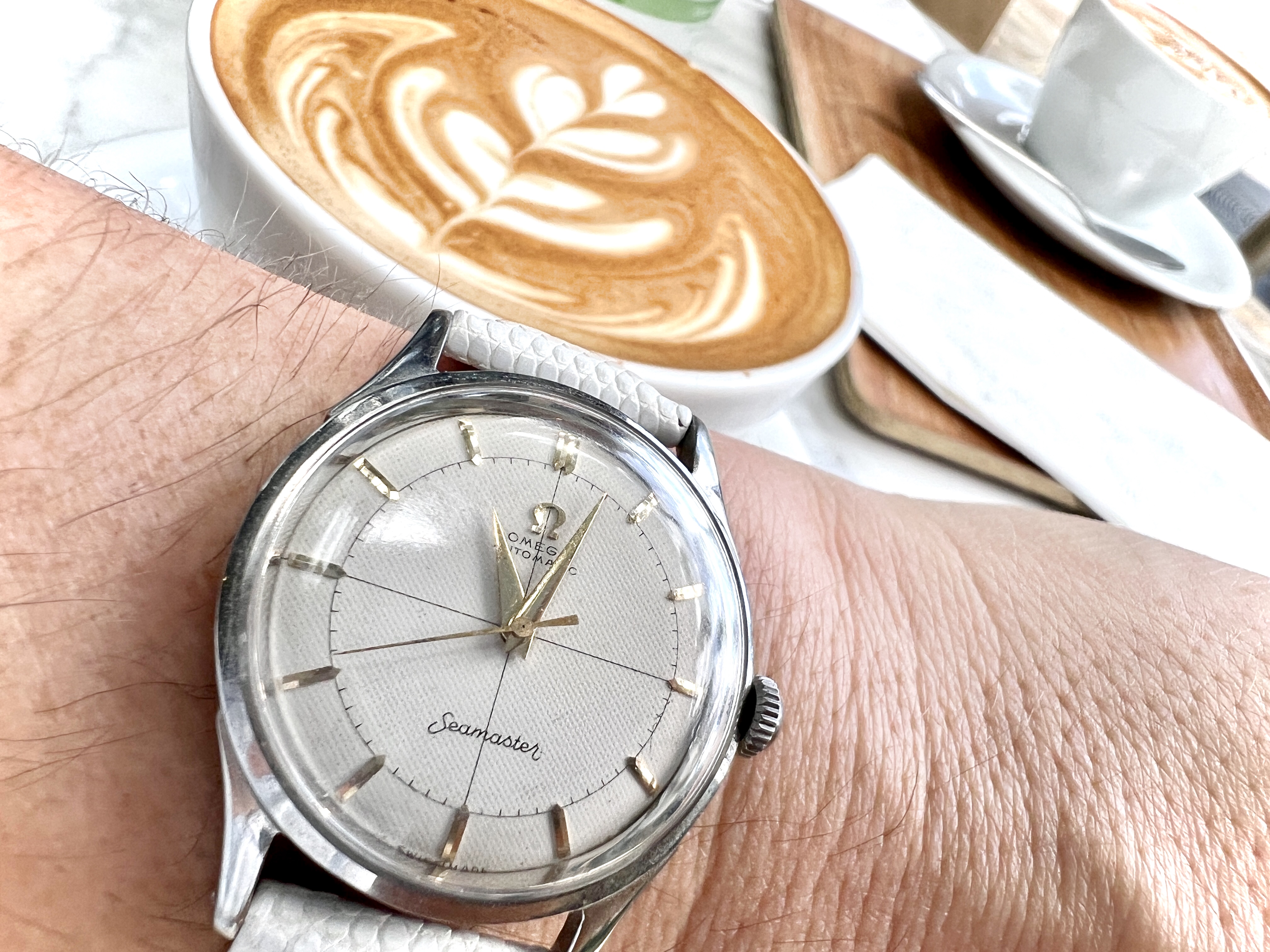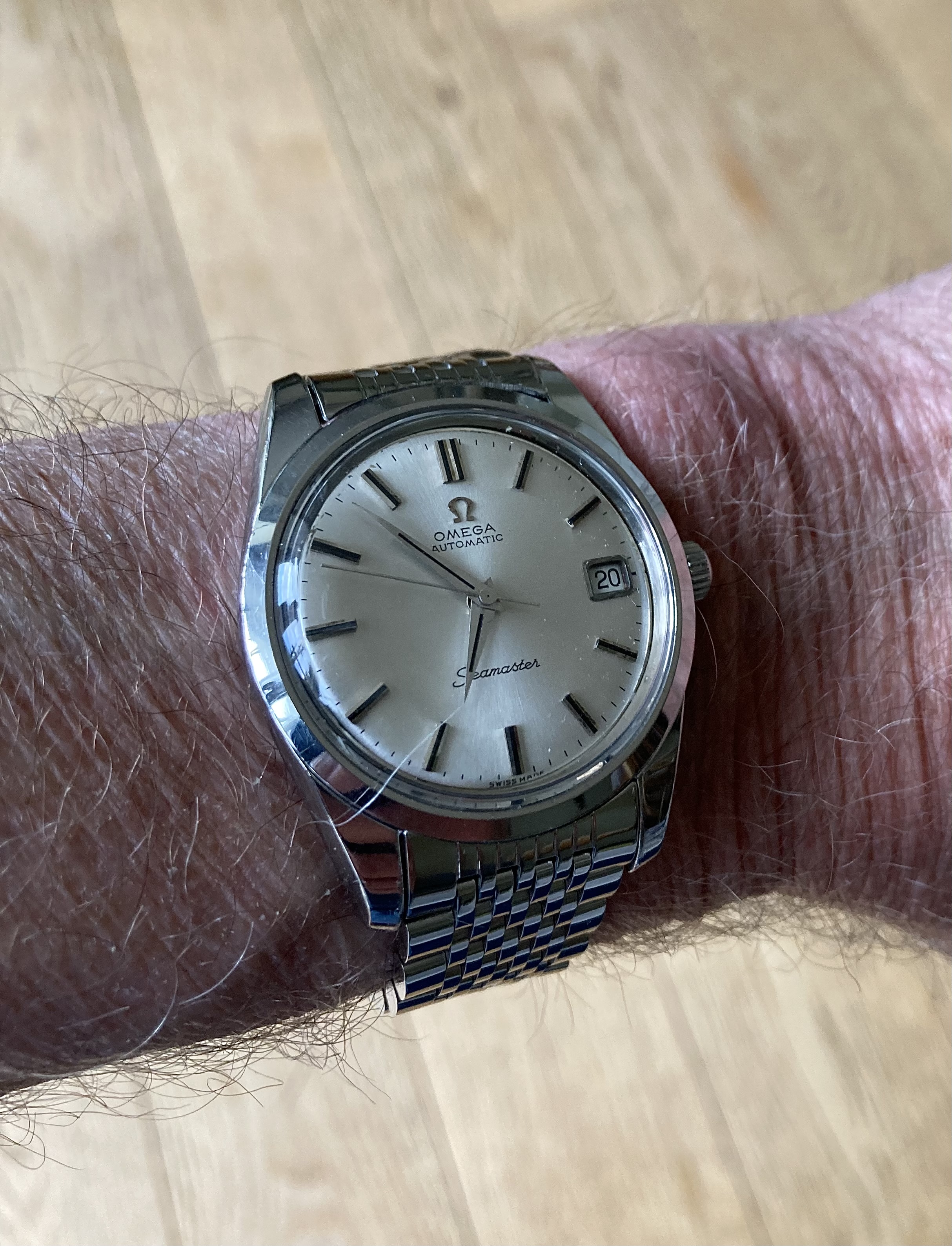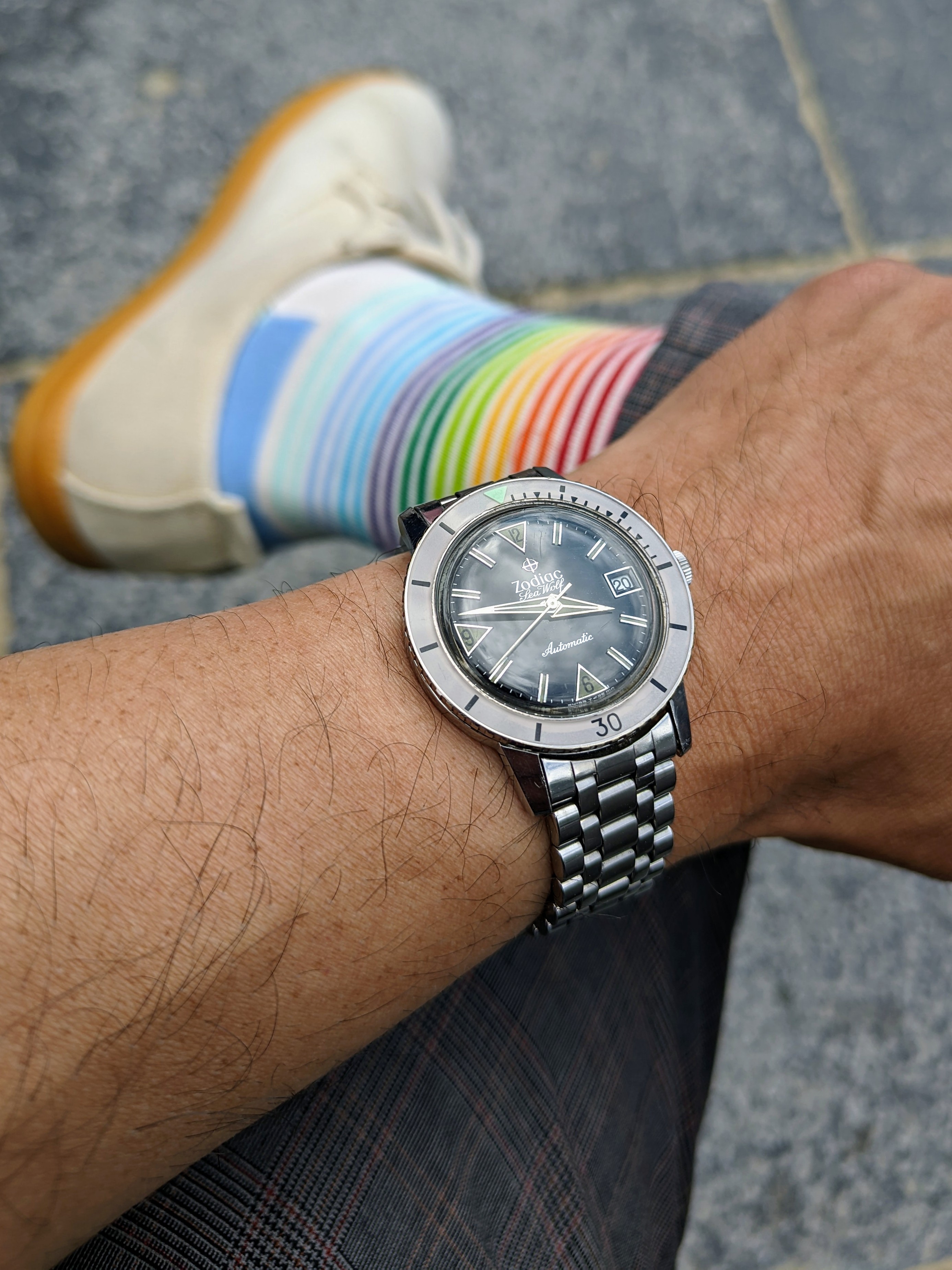 Saffron colored, very sunburst-y dial in a solid 14kt white gold case and on an orange lizard strap; Lucien Piccard was doing at least some of the Omega Seamaster Aqua Terra colors back in the late 1950s. Even vintage LP is not much respected, in an Invicta sort of way. I don't trot this one out too often though I like the white gold. It'll only do for casual wear for a few months in summer Texas heat. Ought to get a more subdued strap for it.