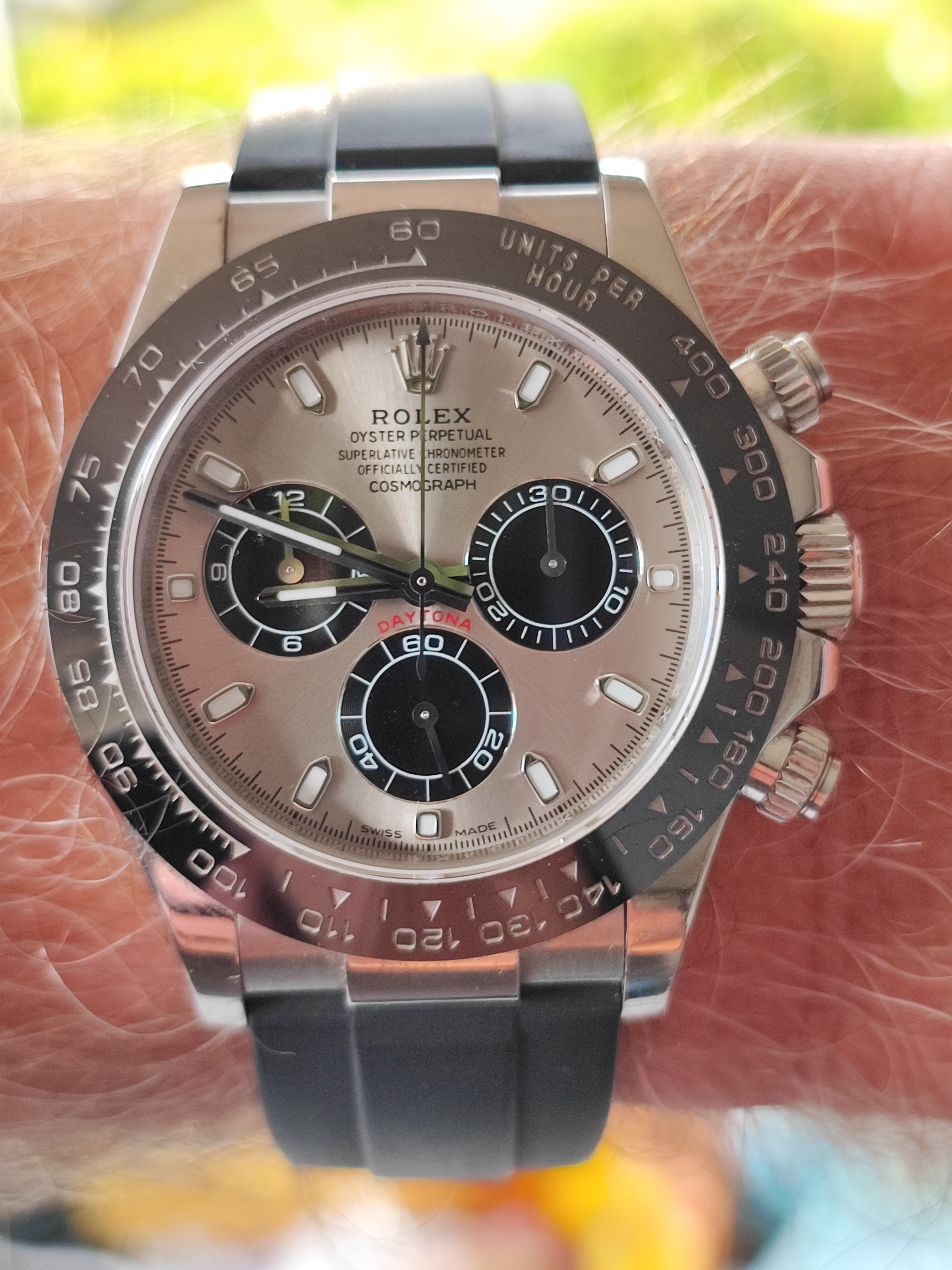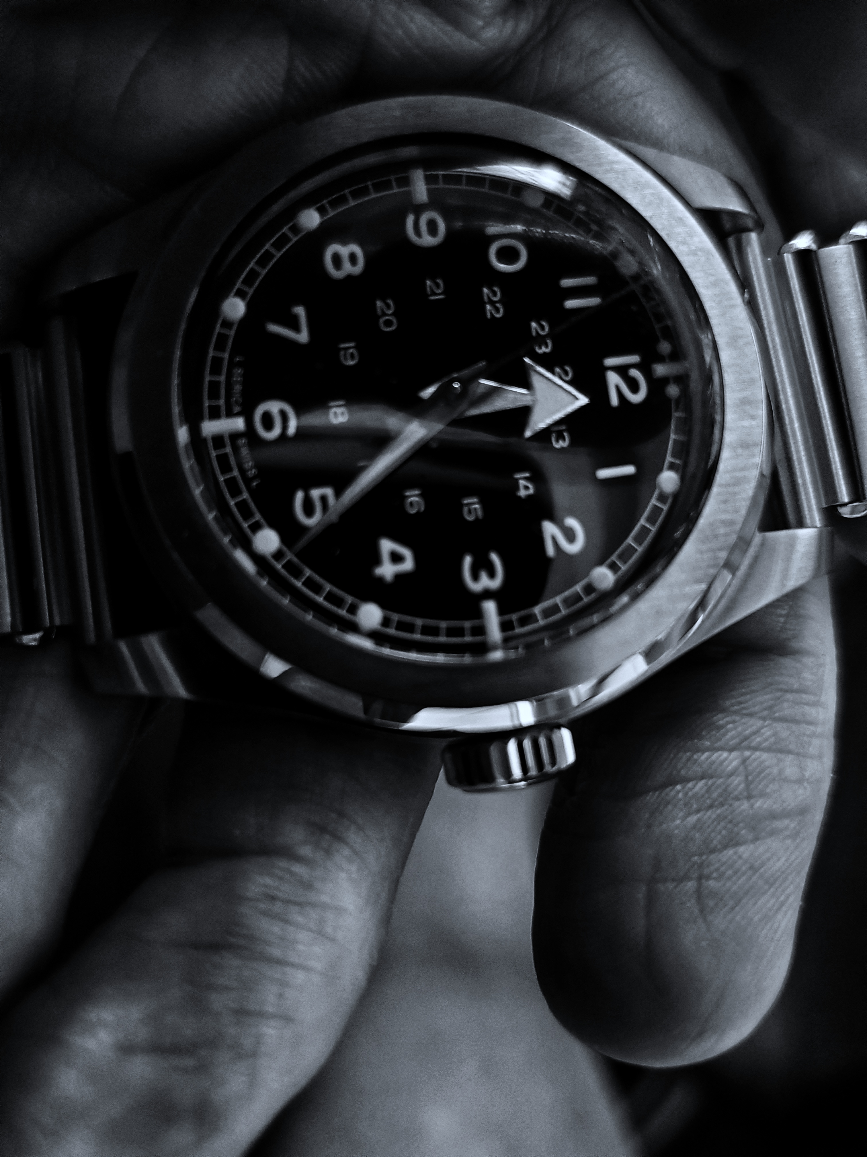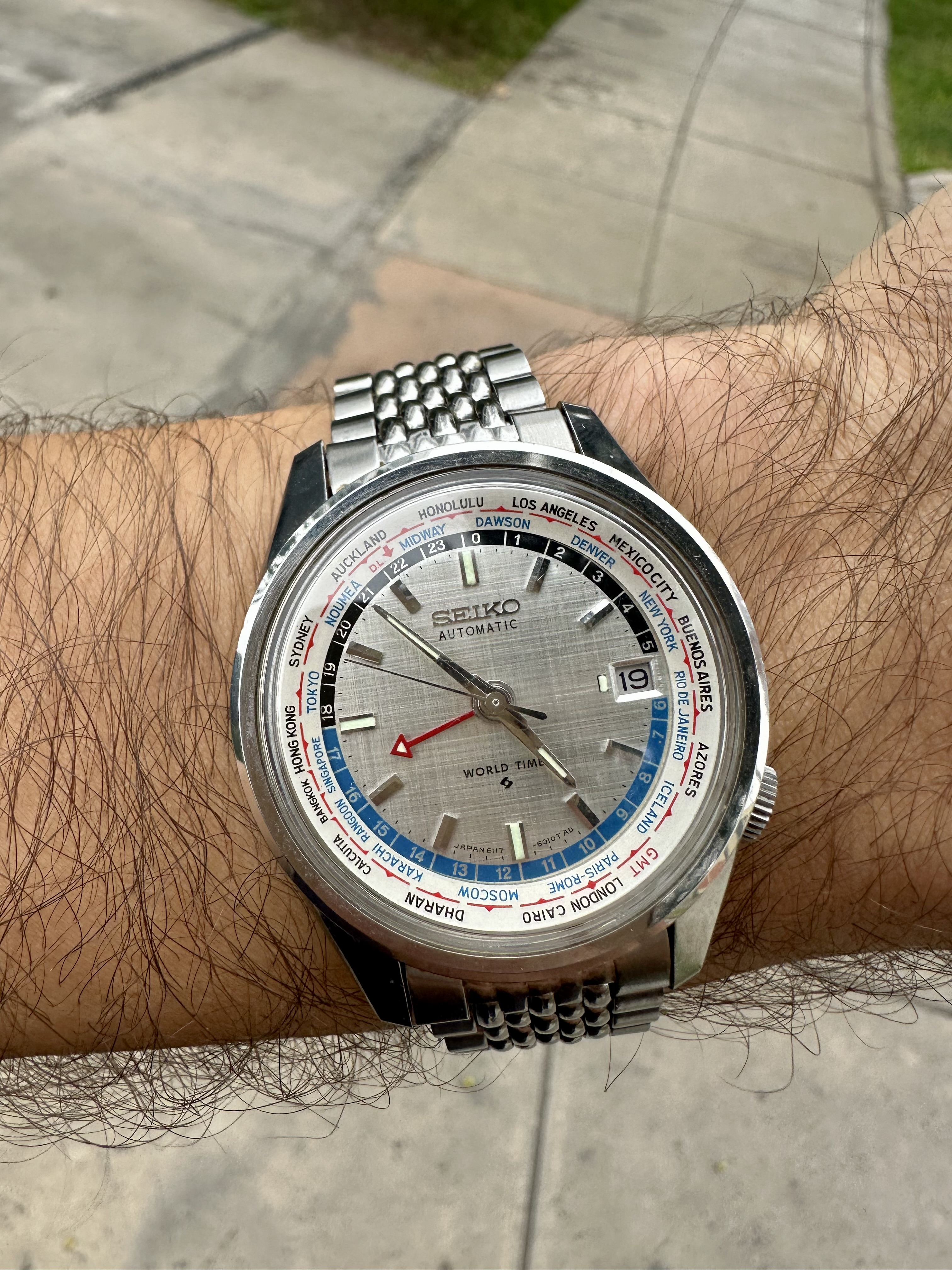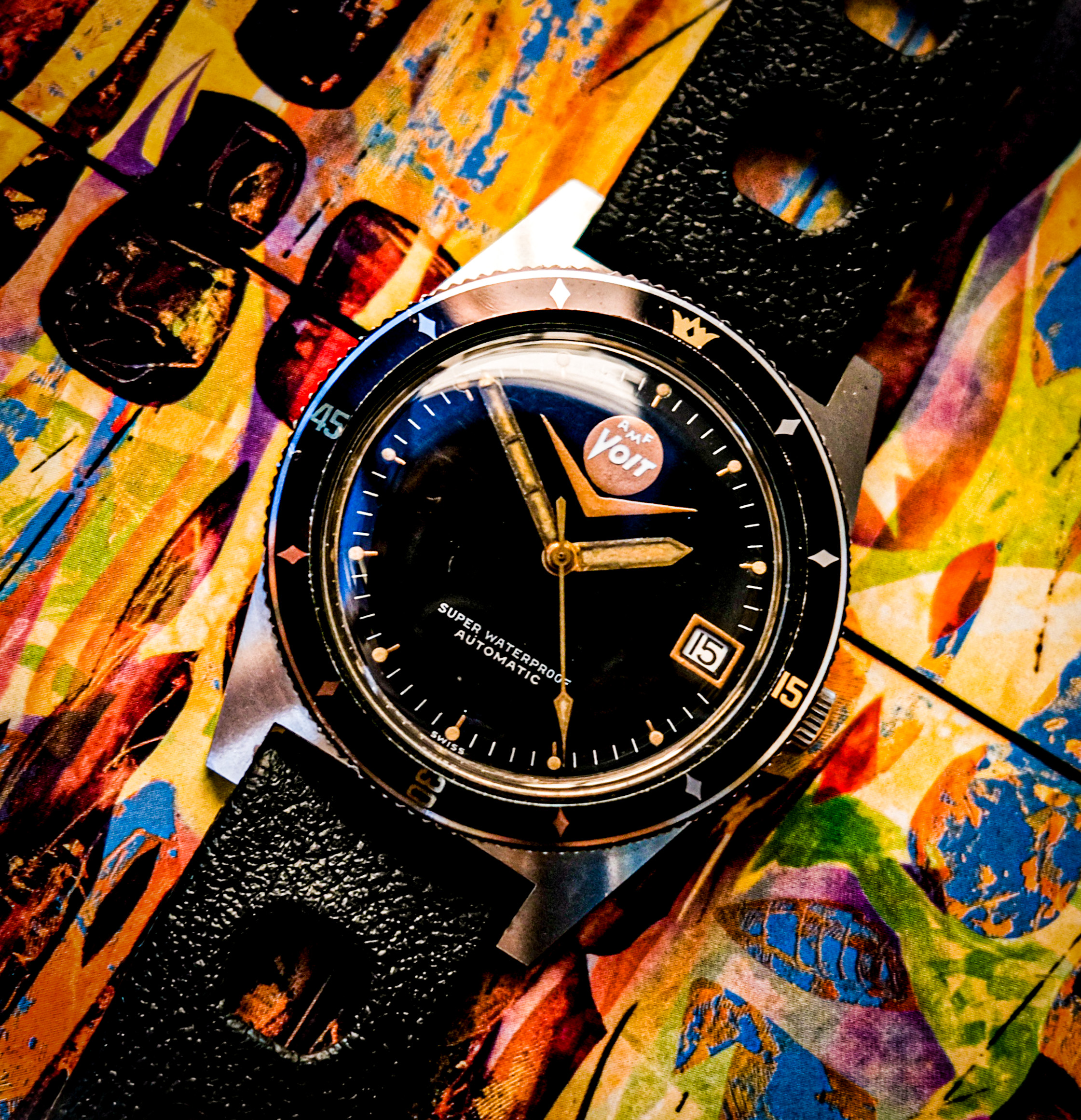 Saffron colored, very sunburst-y dial in a solid 14kt white gold case and on an orange lizard strap; Lucien Piccard was doing at least some of the Omega Seamaster Aqua Terra colors back in the late 1950s. Even vintage LP is not much respected, in an Invicta sort of way. I don't trot this one out too often though I like the white gold. It'll only do for casual wear for a few months in summer Texas heat. Ought to get a more subdued strap for it.