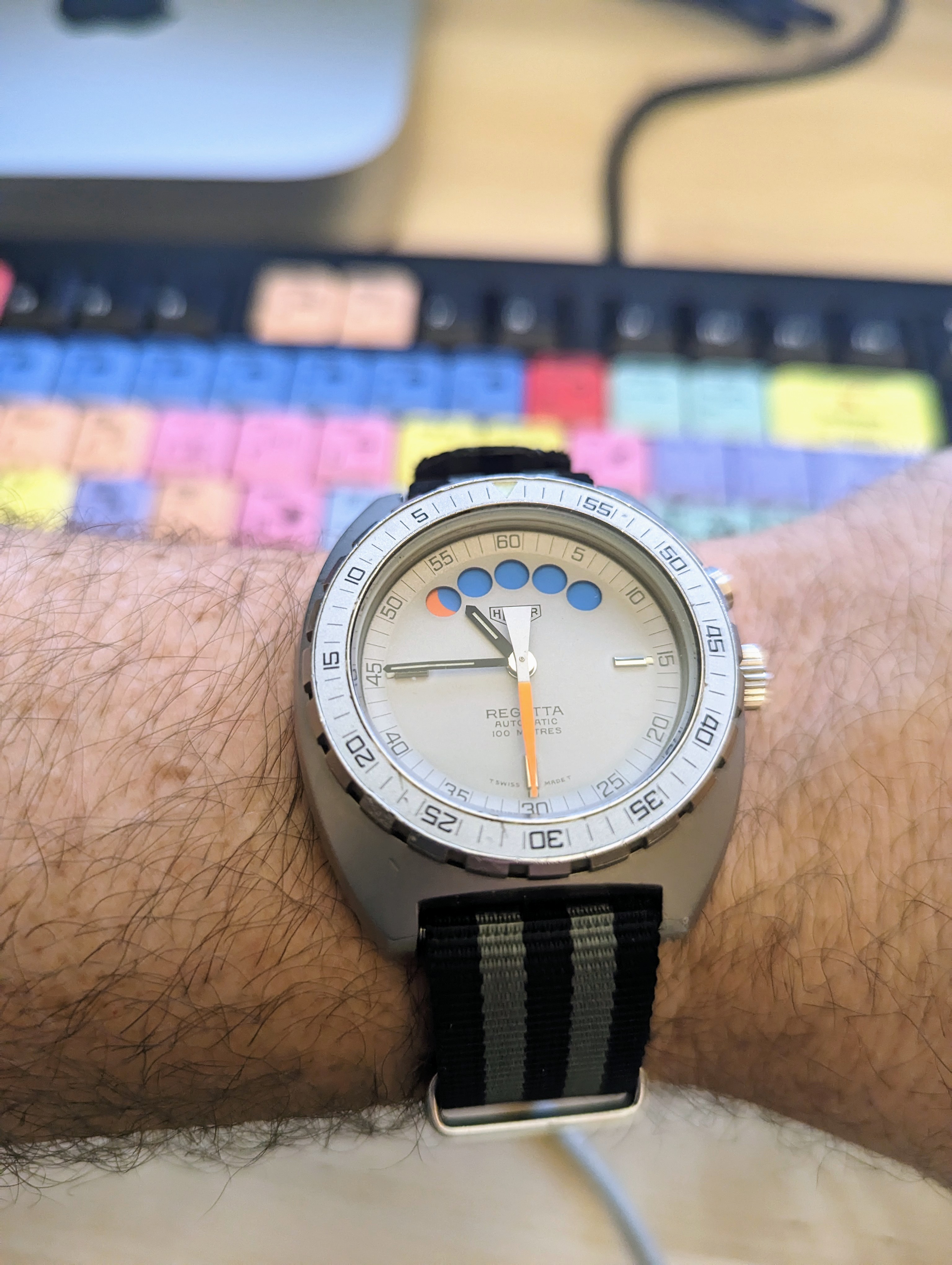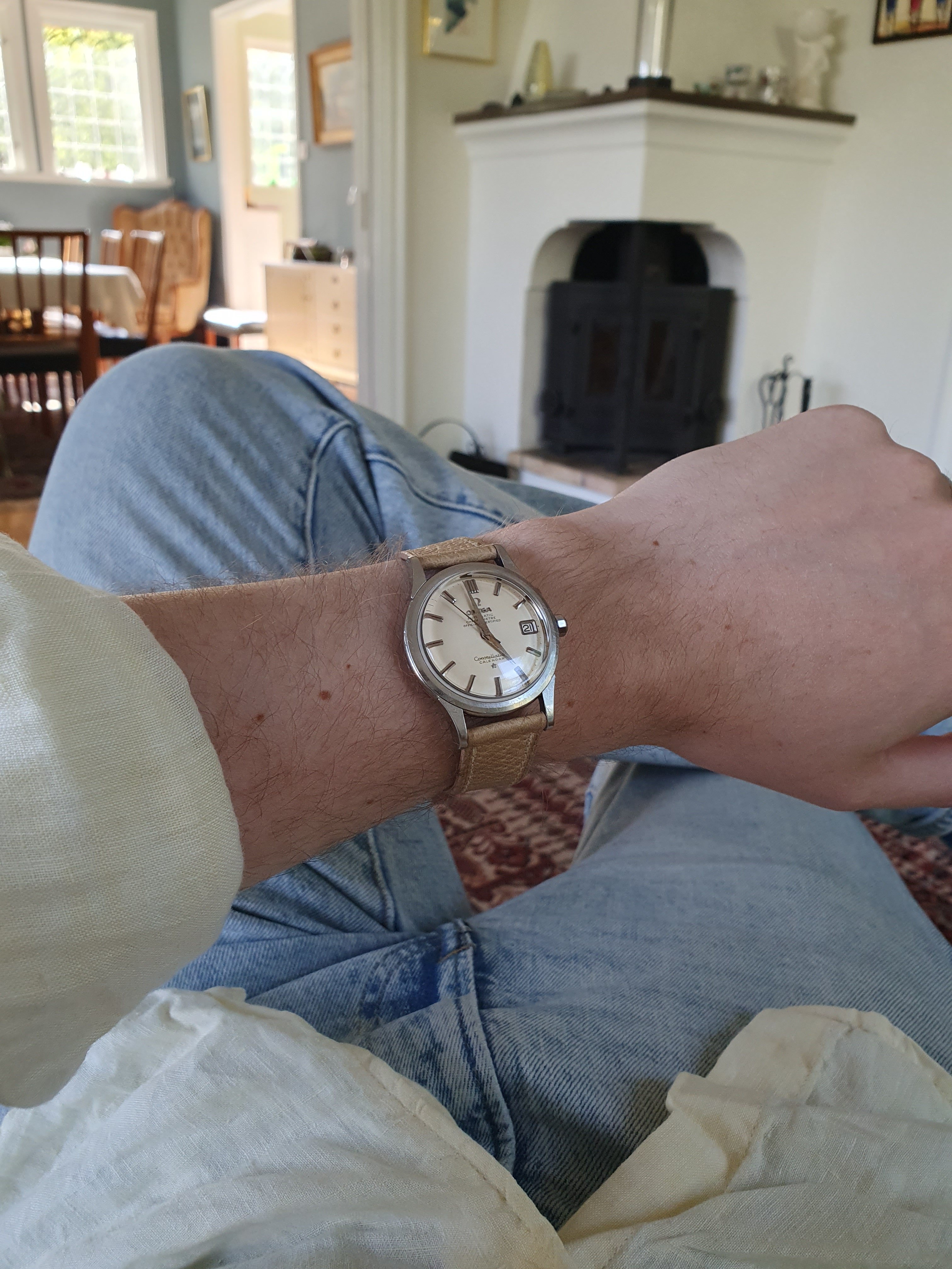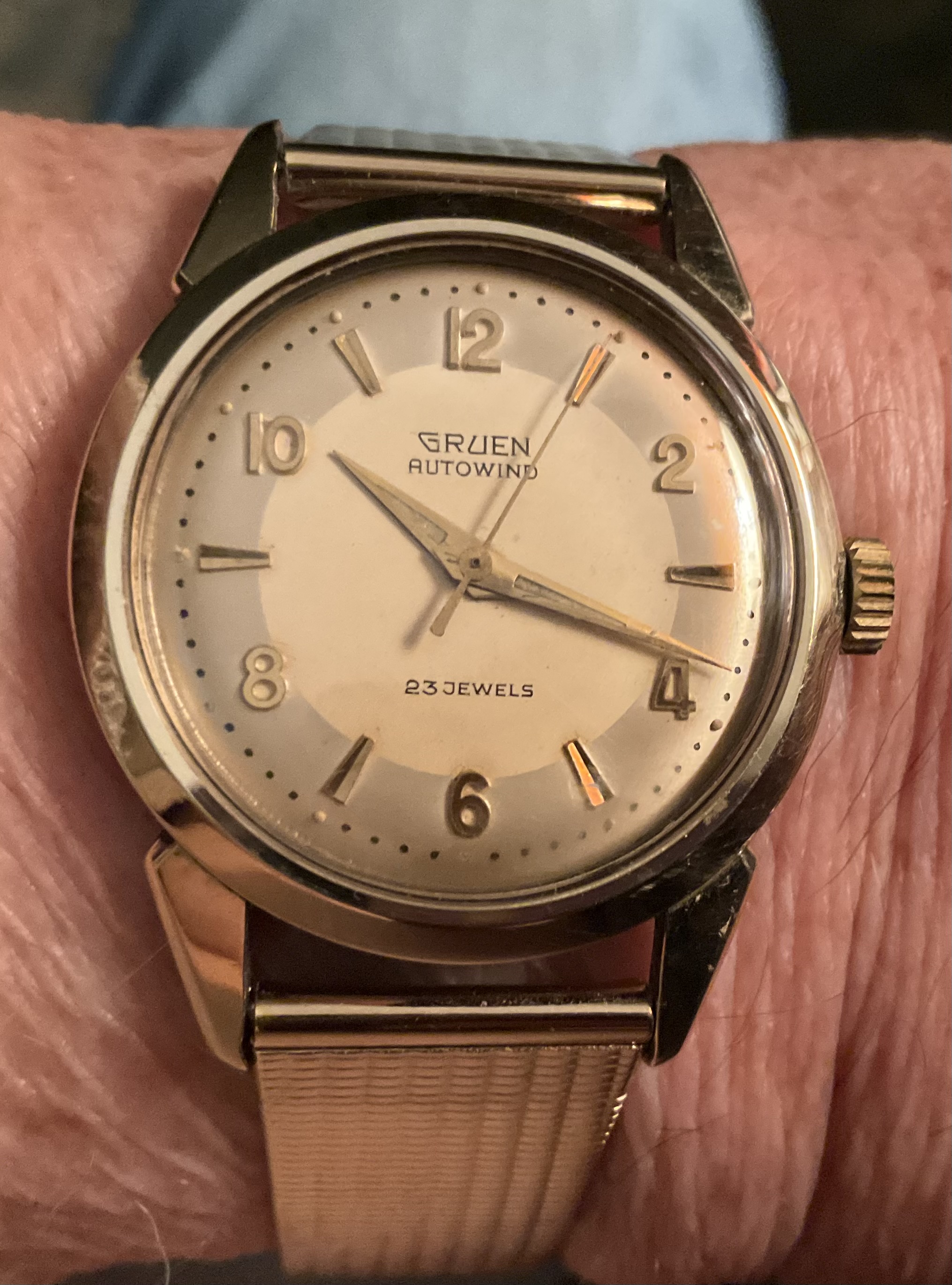 Recently, I showed my Speedmaster 345.0808, and mentioned I was planning on parking it for a week because of an impending camping trip. I only have one beater watch, a Seiko I got for free. But the cell is dead, and besides, it was time for a change to something that hadn鈥檛 seen the light of day for a while. So for the next week, my Gruen 23-jewel automatic is it. This one has a German-made Durowe movement in it. Only one I鈥檝e ever seen. This one is probably from the late 1950s, and it was a quality watch in it鈥檚 day. The case is gold shell over stainless steel.