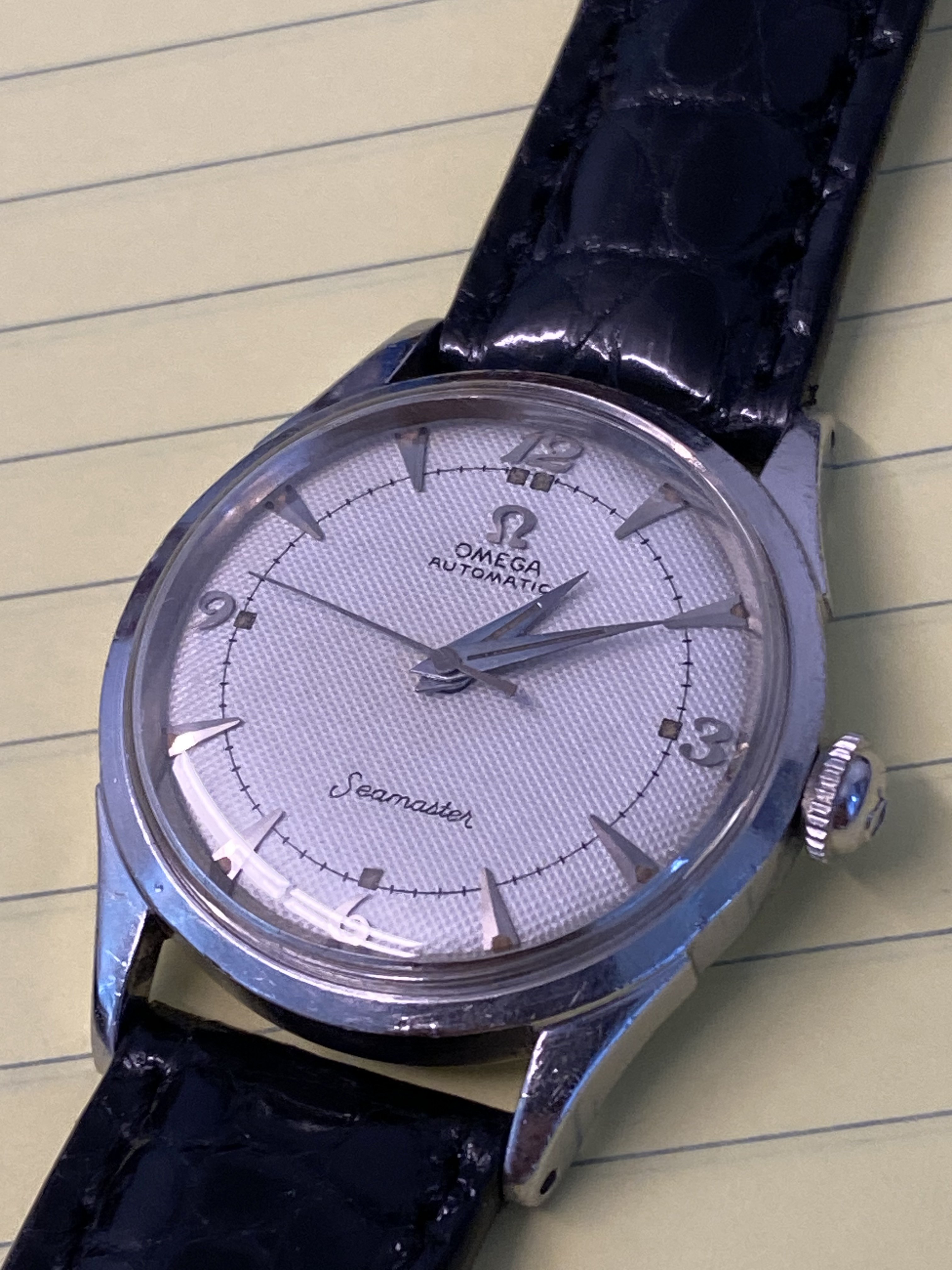 Not actually wearing this one today, but just received it back from my watchmaker, so I thought that I would share it. 1952 Seamaster 2635 with a rail track honeycomb dial AND Breguet numerals too! 354 bumper. Unpolished case. Sometimes trolling eBay pays off.
