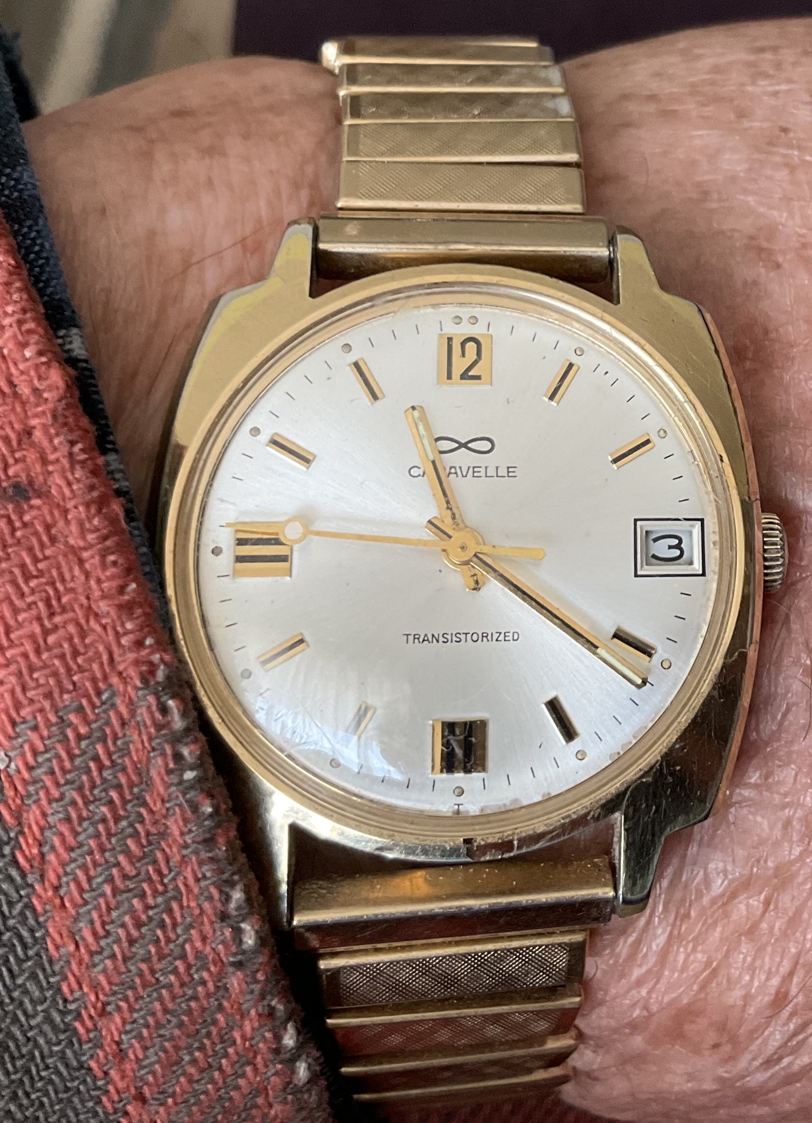 We are headed away camping for a few days next week. Time to swap my Accutron Spaceview for another victim er watch. This time it is my 55 year old vintage Caravelle transistorized date model. Movement made in Japan. This watch was offered at a time when Hamilton was still trying to flog the electro-mechanical Hamilton Electric at 3 times the price of this Caravelle. The Caravelle was a vastly superior watch!