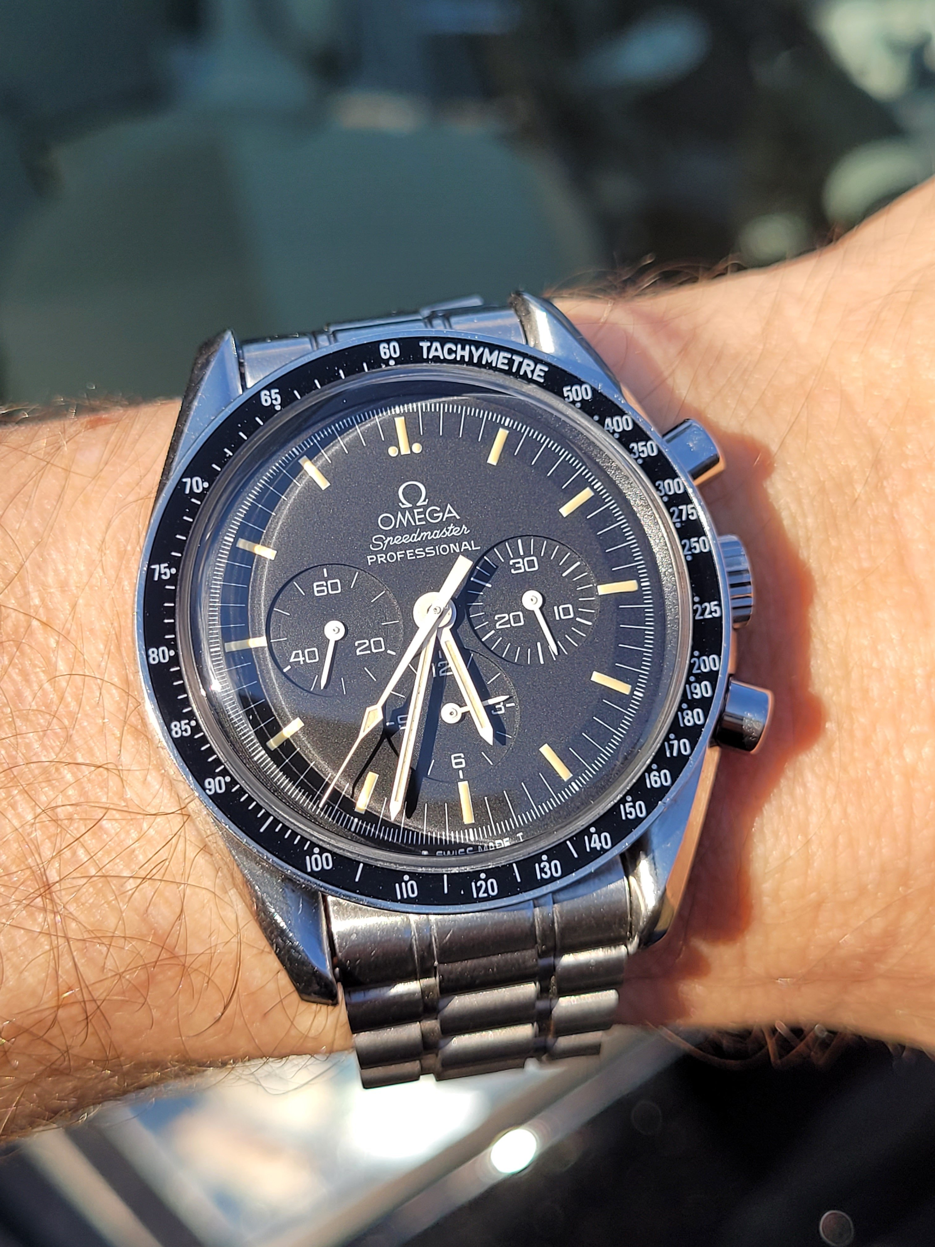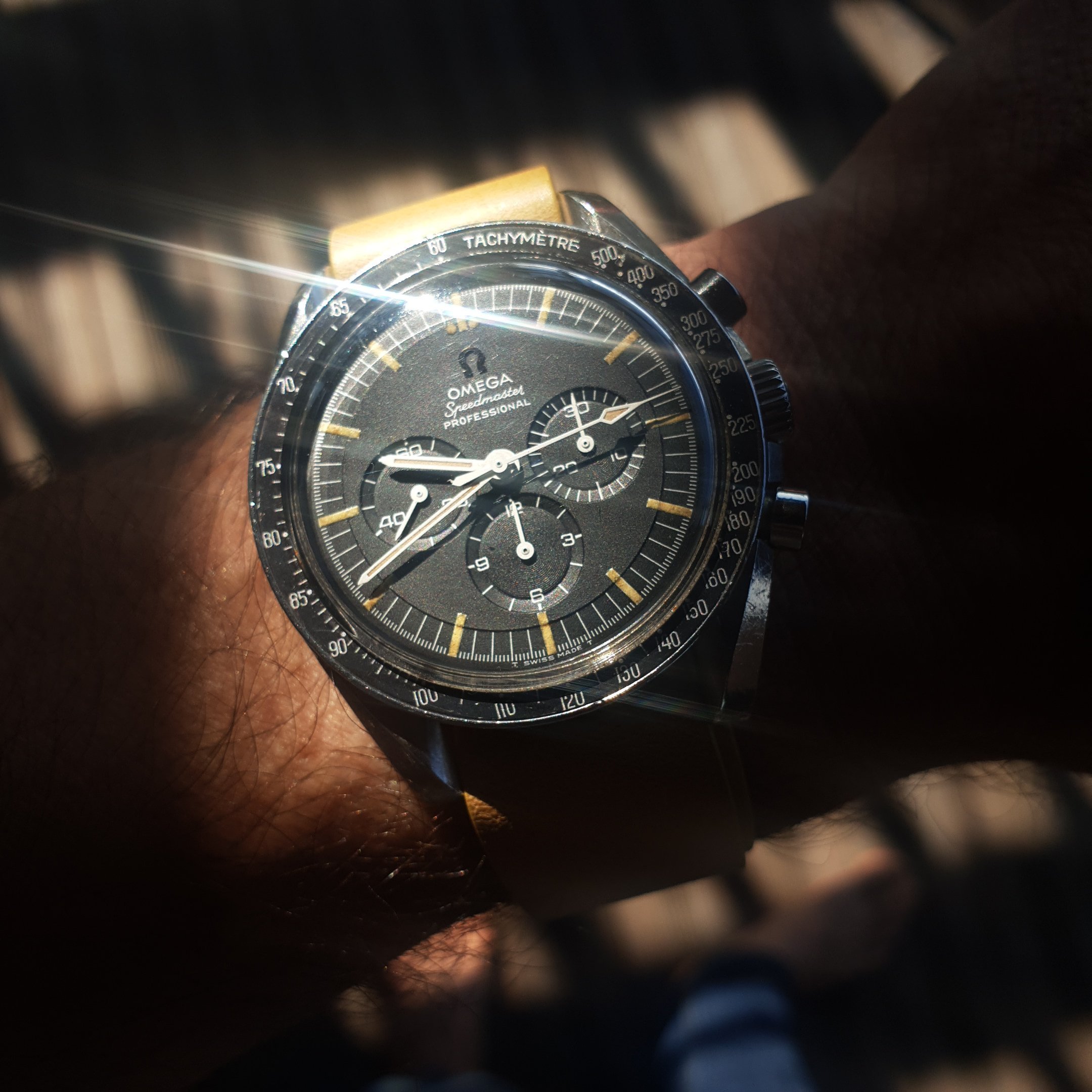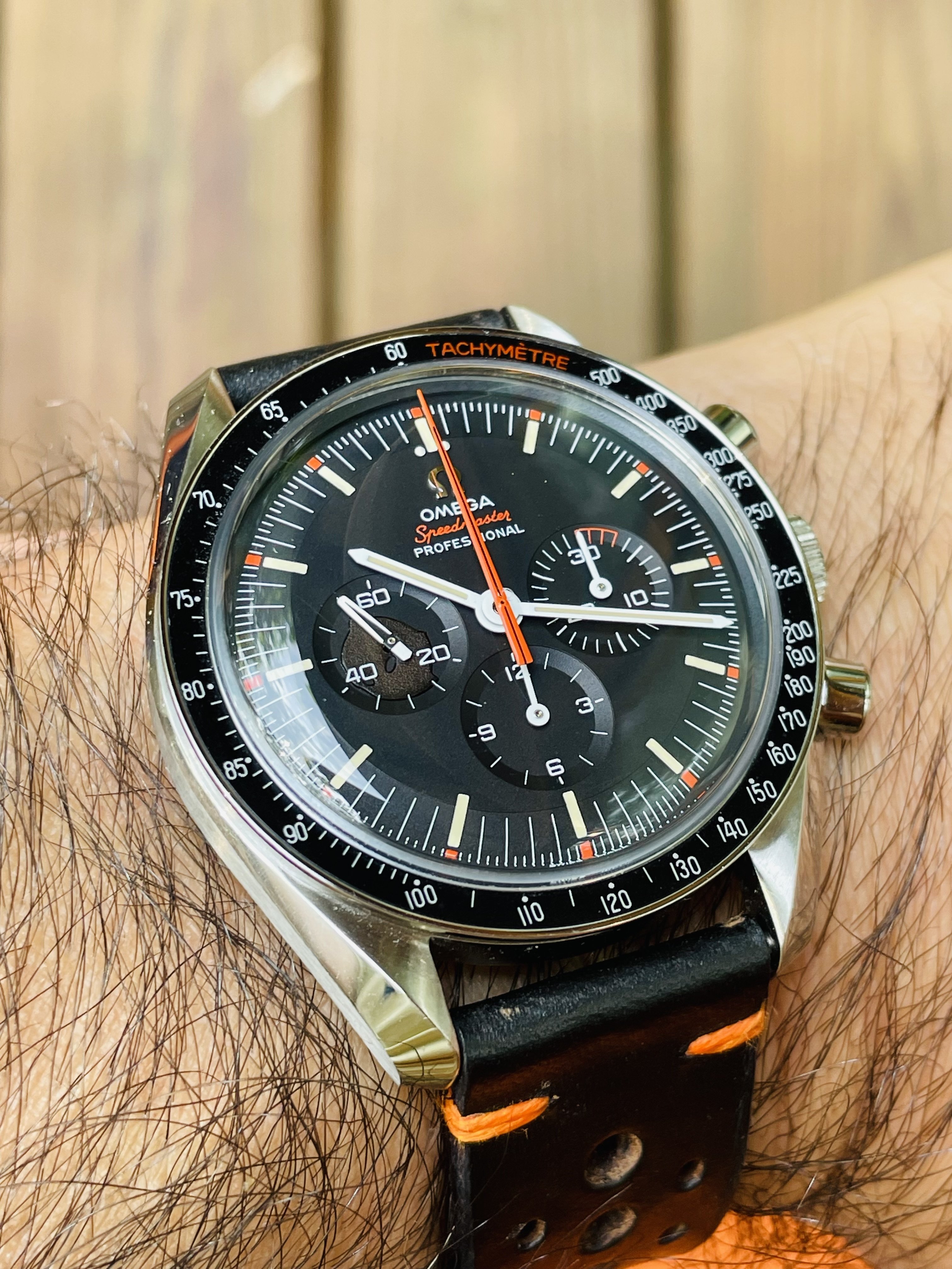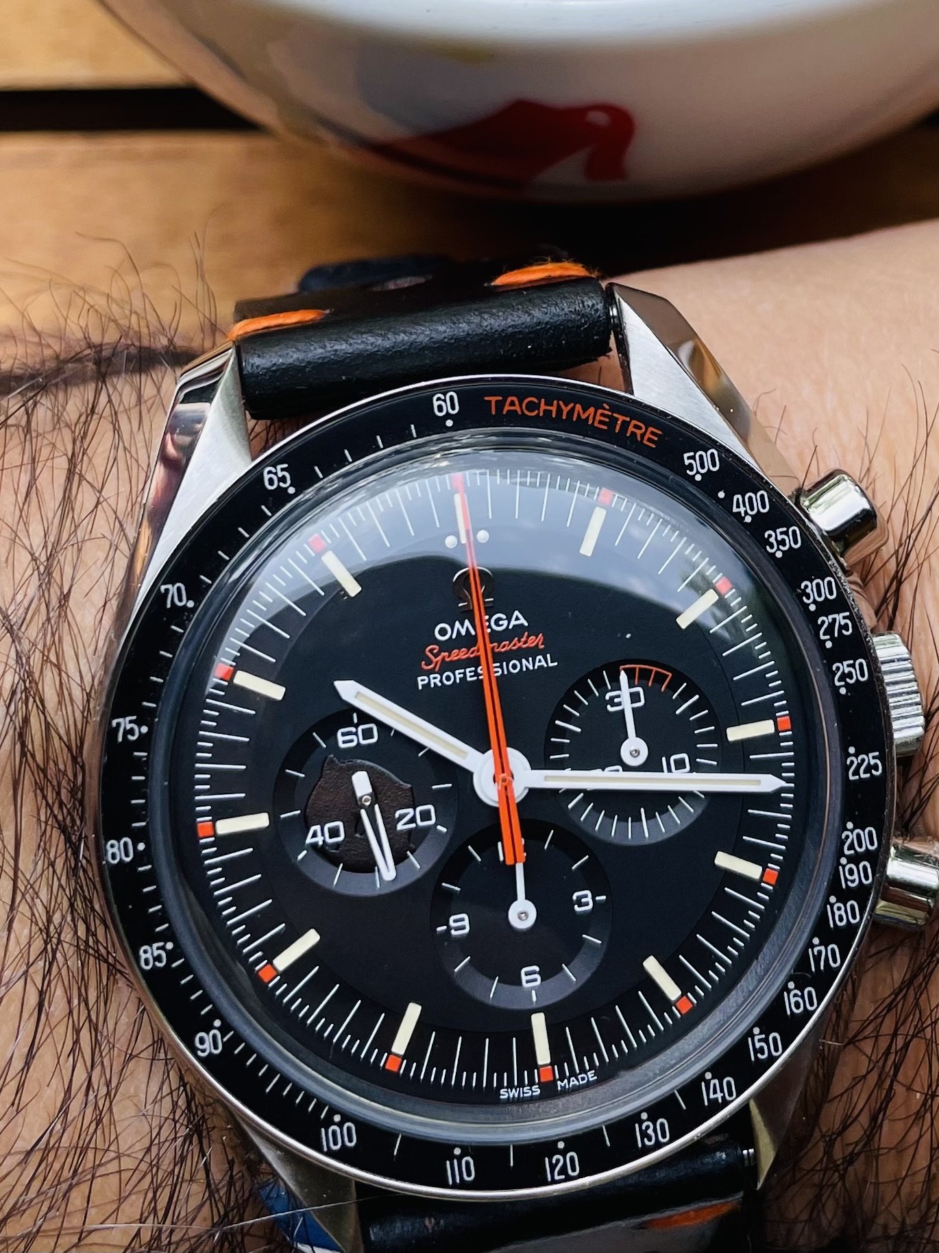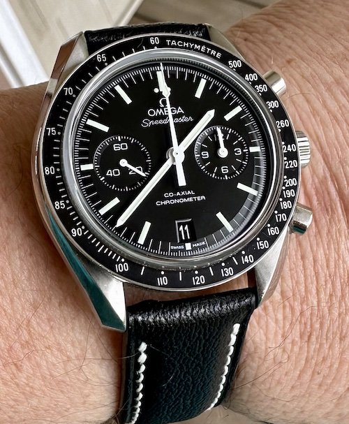 Mid-day swaparoo to the Speedmaster Co-Axial Moonwatch, 44.25mm. Replacement strap as the original was looking a bit tatty. I like the white stitching on this one better than the original leather with crocodile embossing.