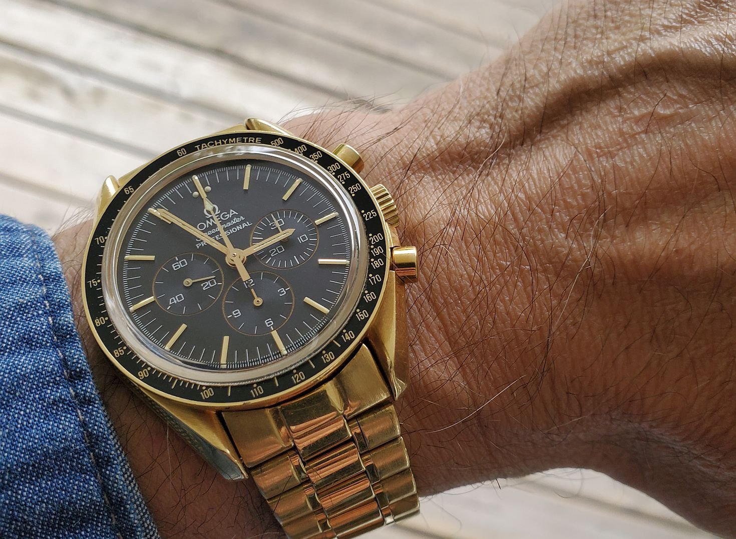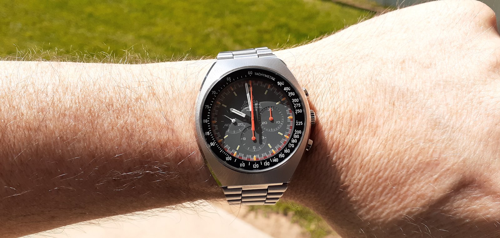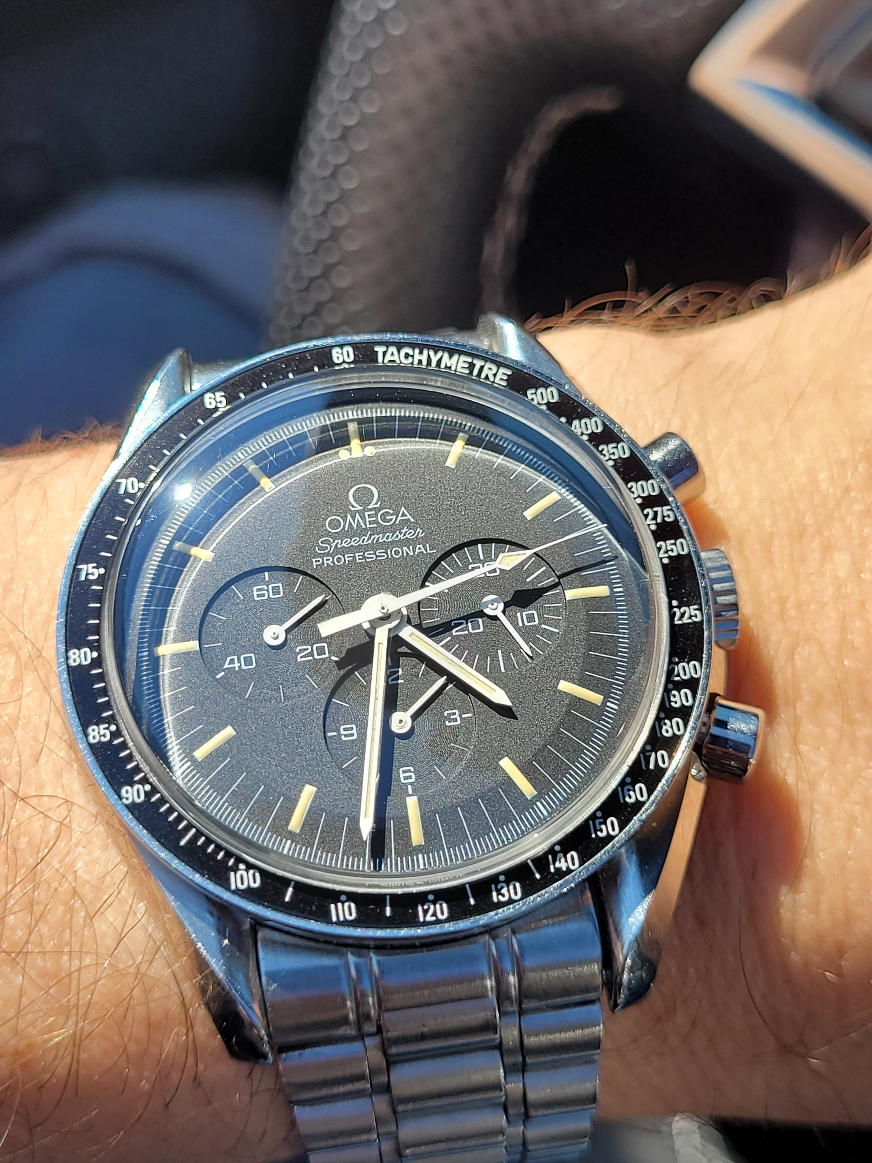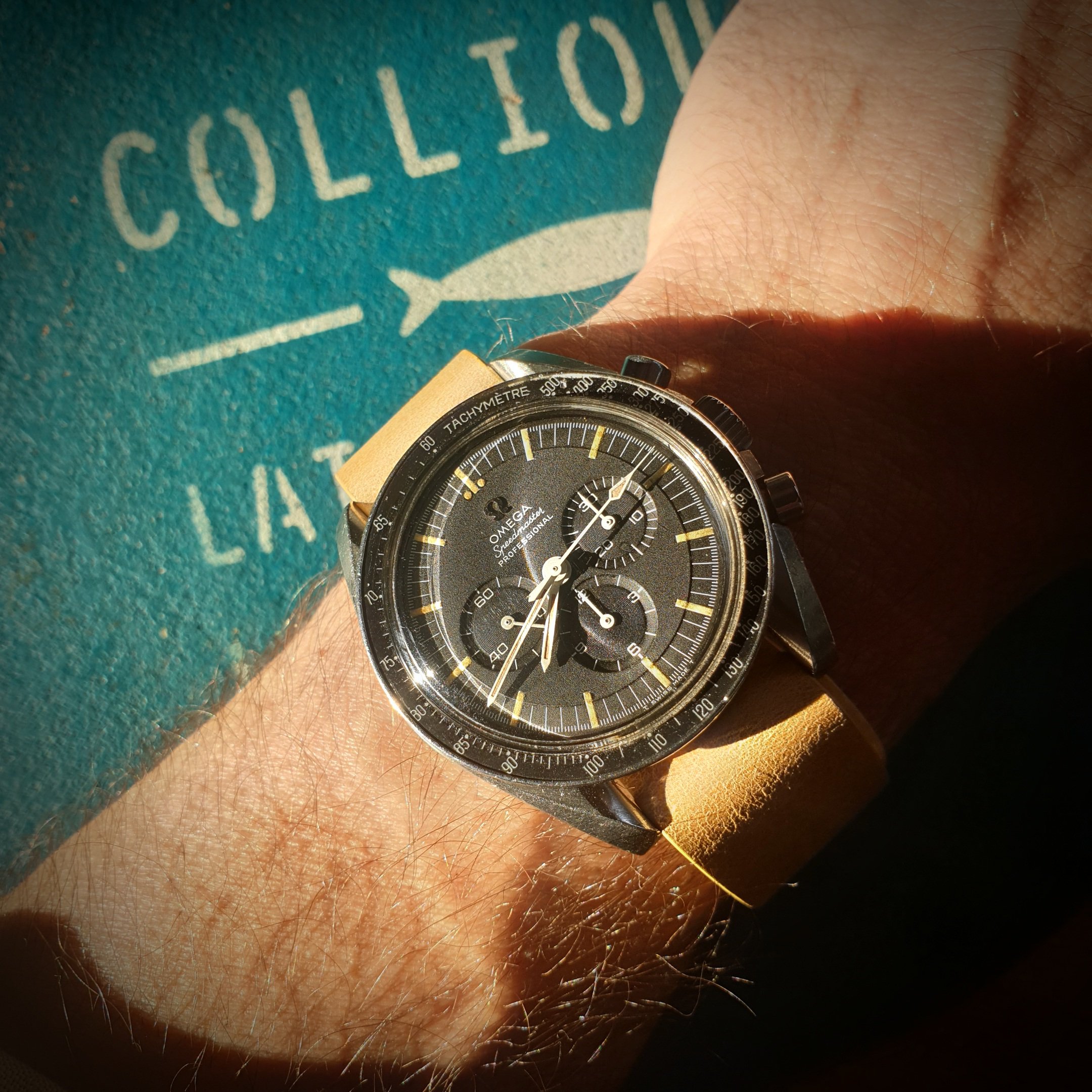 Mid-day swaparoo to the Speedmaster Co-Axial Moonwatch, 44.25mm. Replacement strap as the original was looking a bit tatty. I like the white stitching on this one better than the original leather with crocodile embossing.
