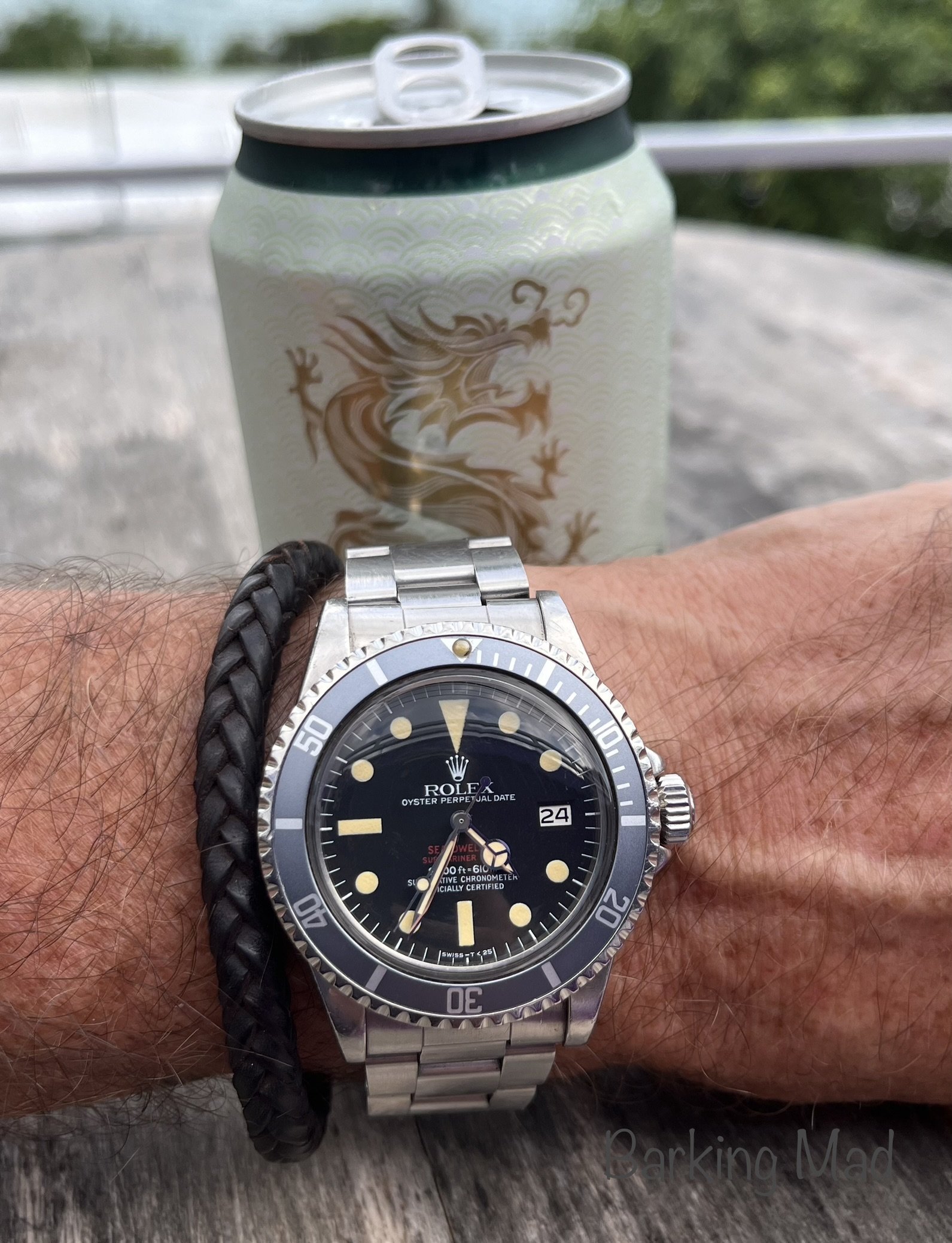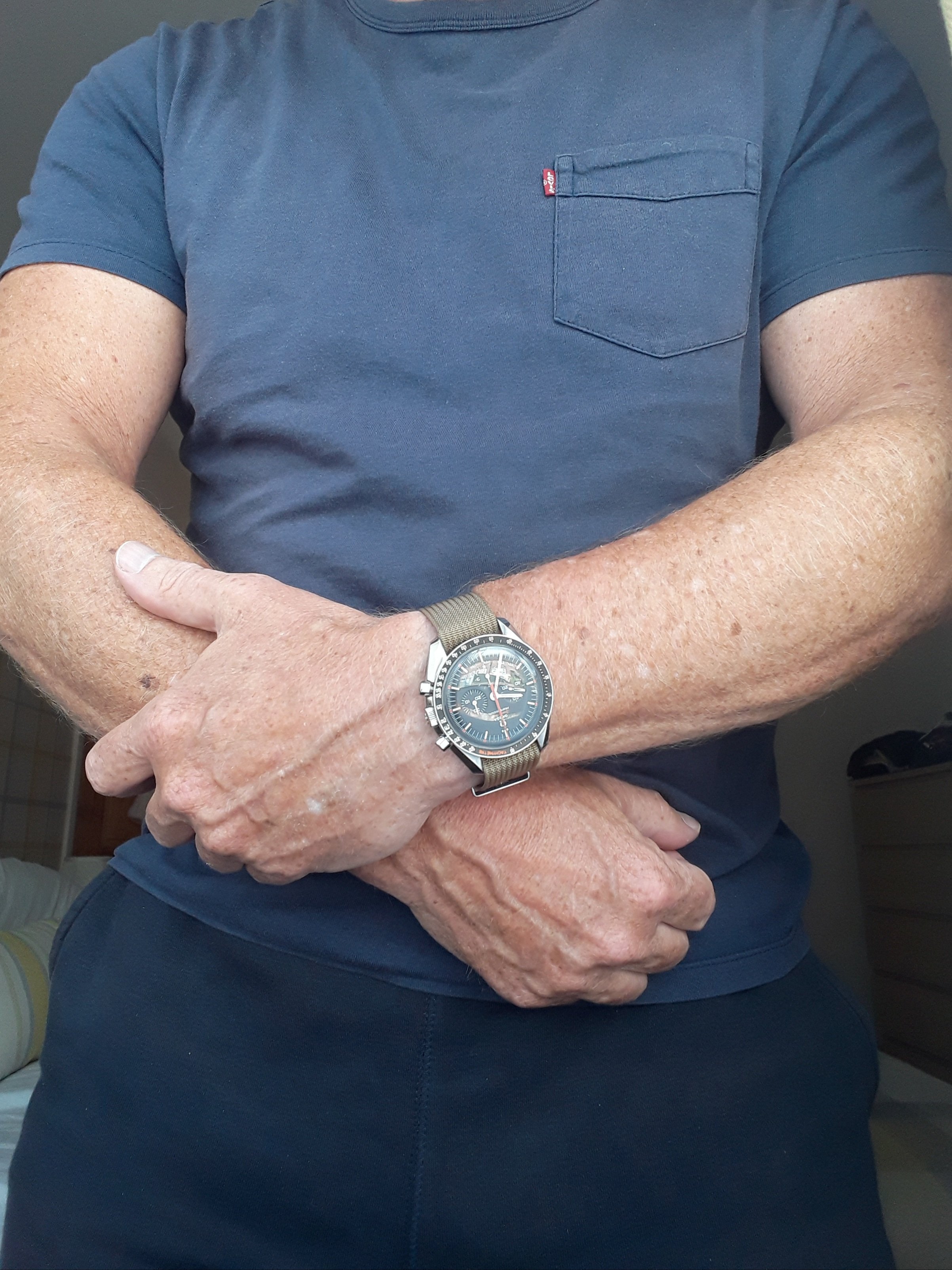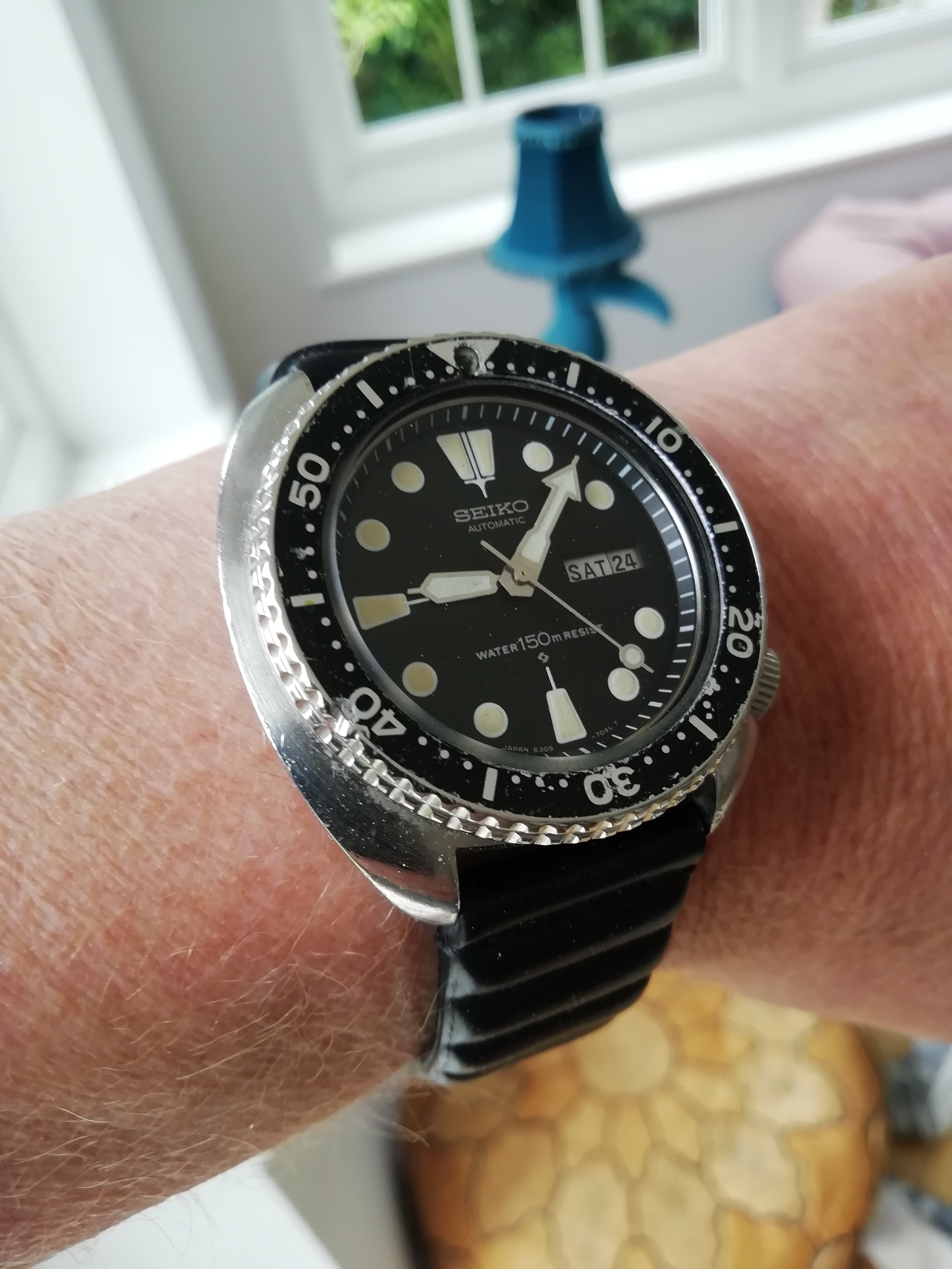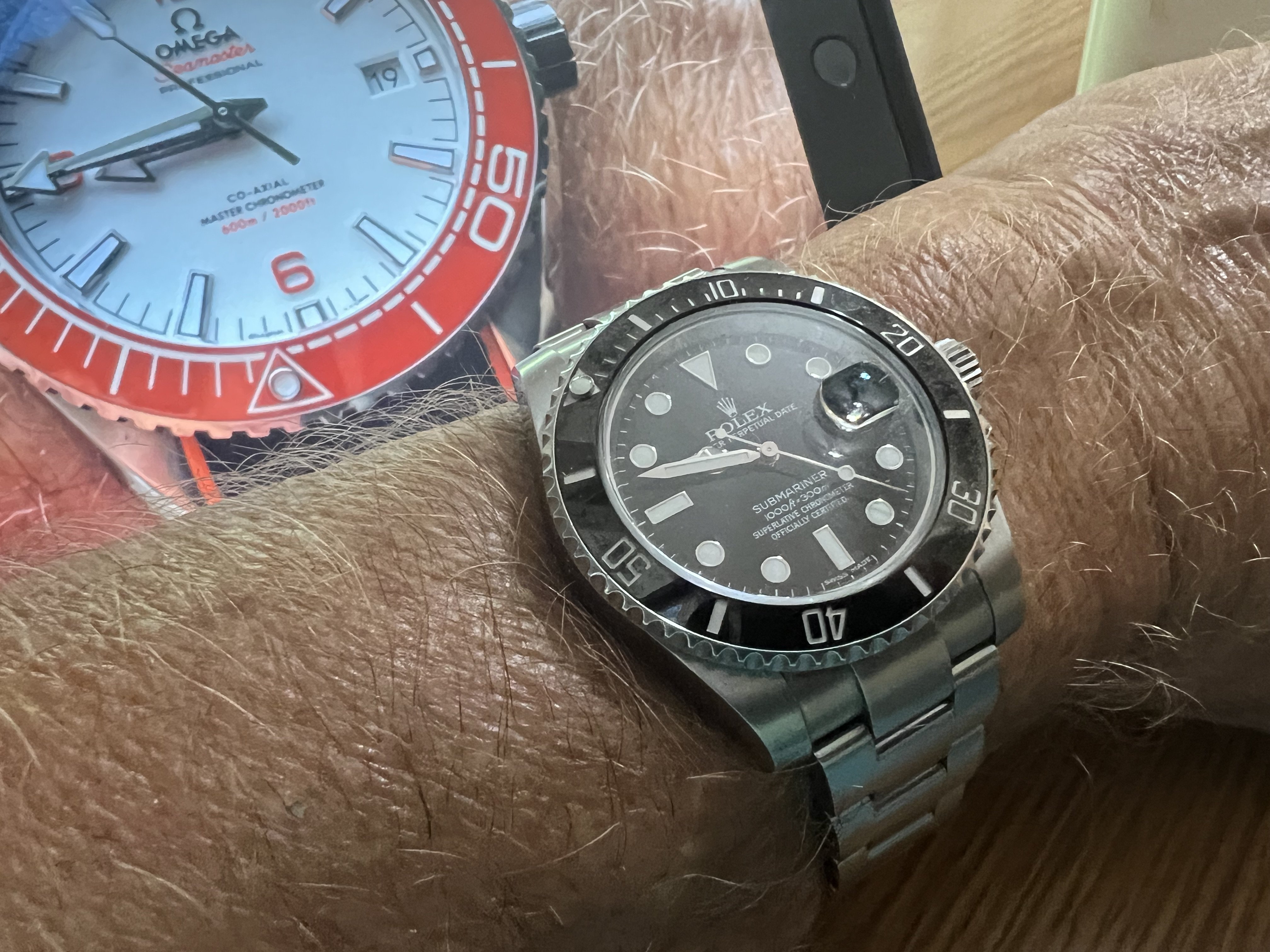 Back to my Rolex Date-Just. One owner (me) for the past 34 years. The bandage is the result of a mis-step while working on a carpentry project. Concrete floors are very hard,