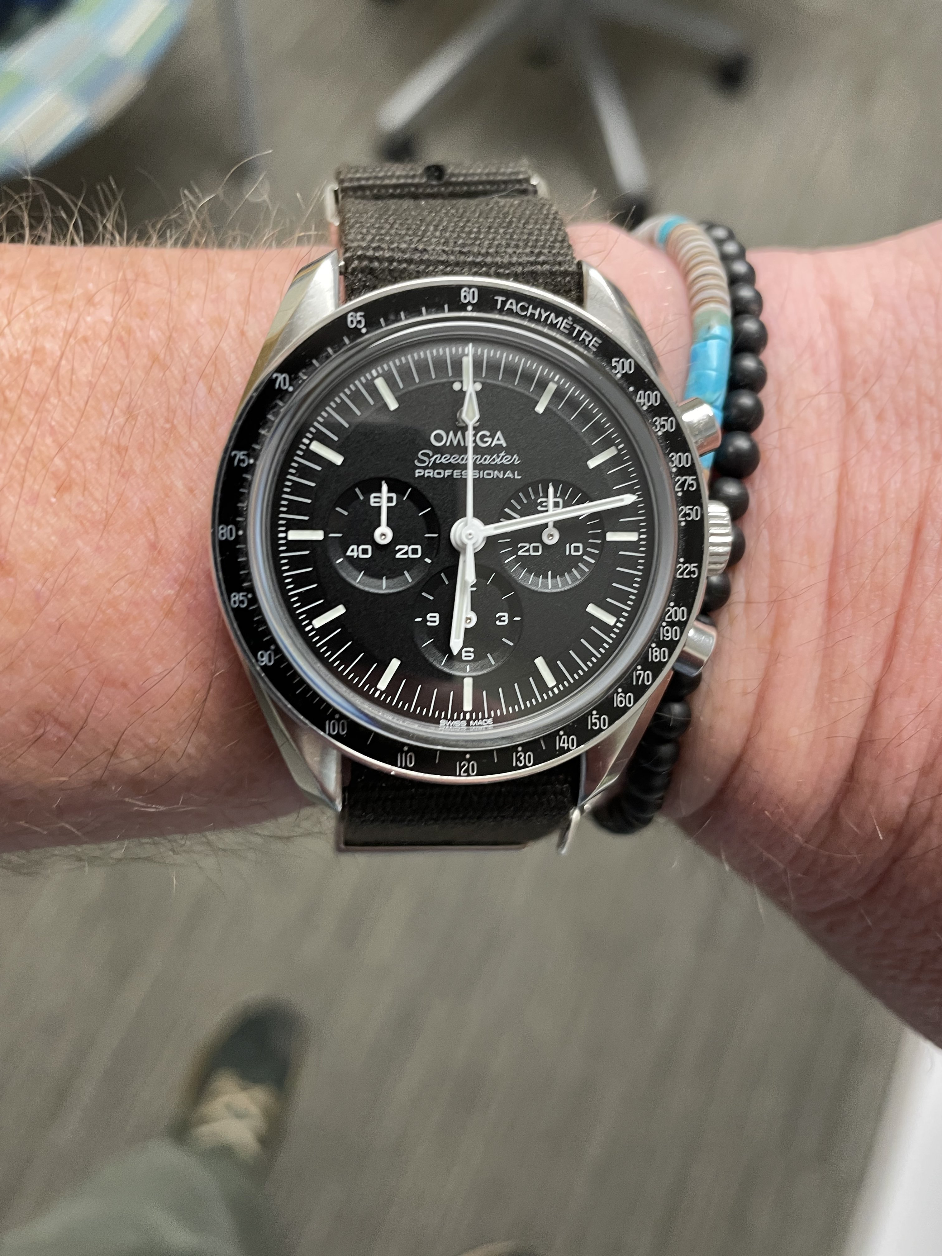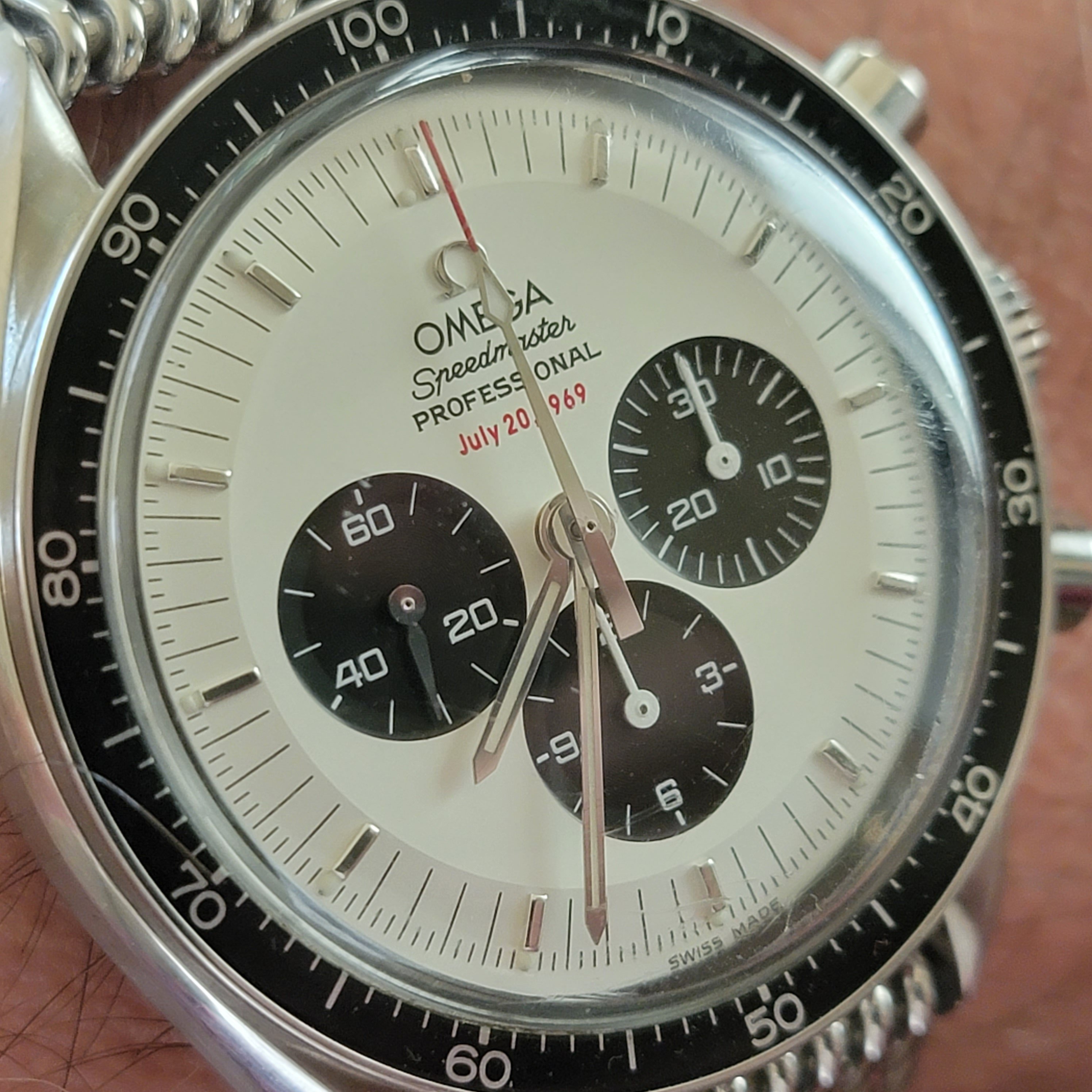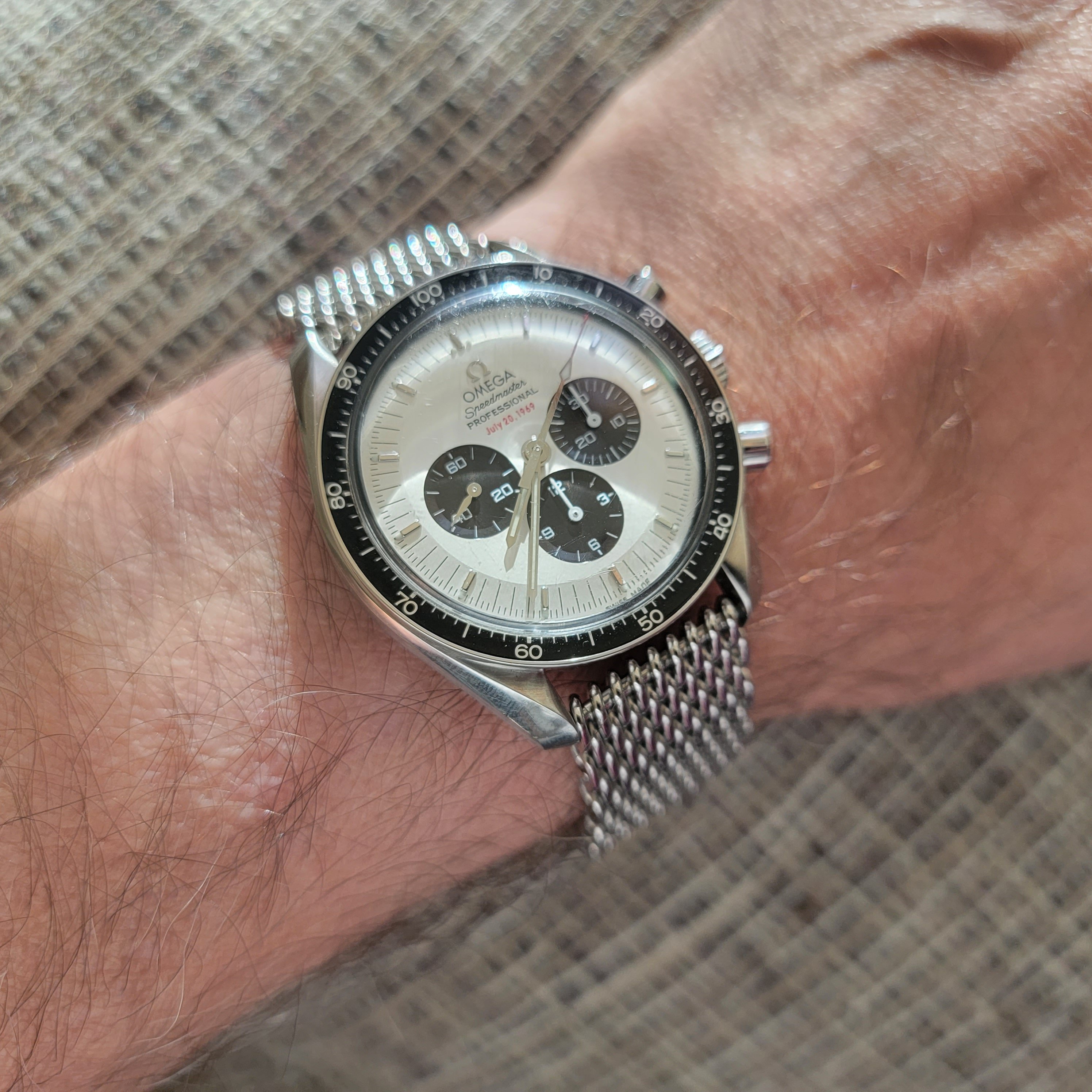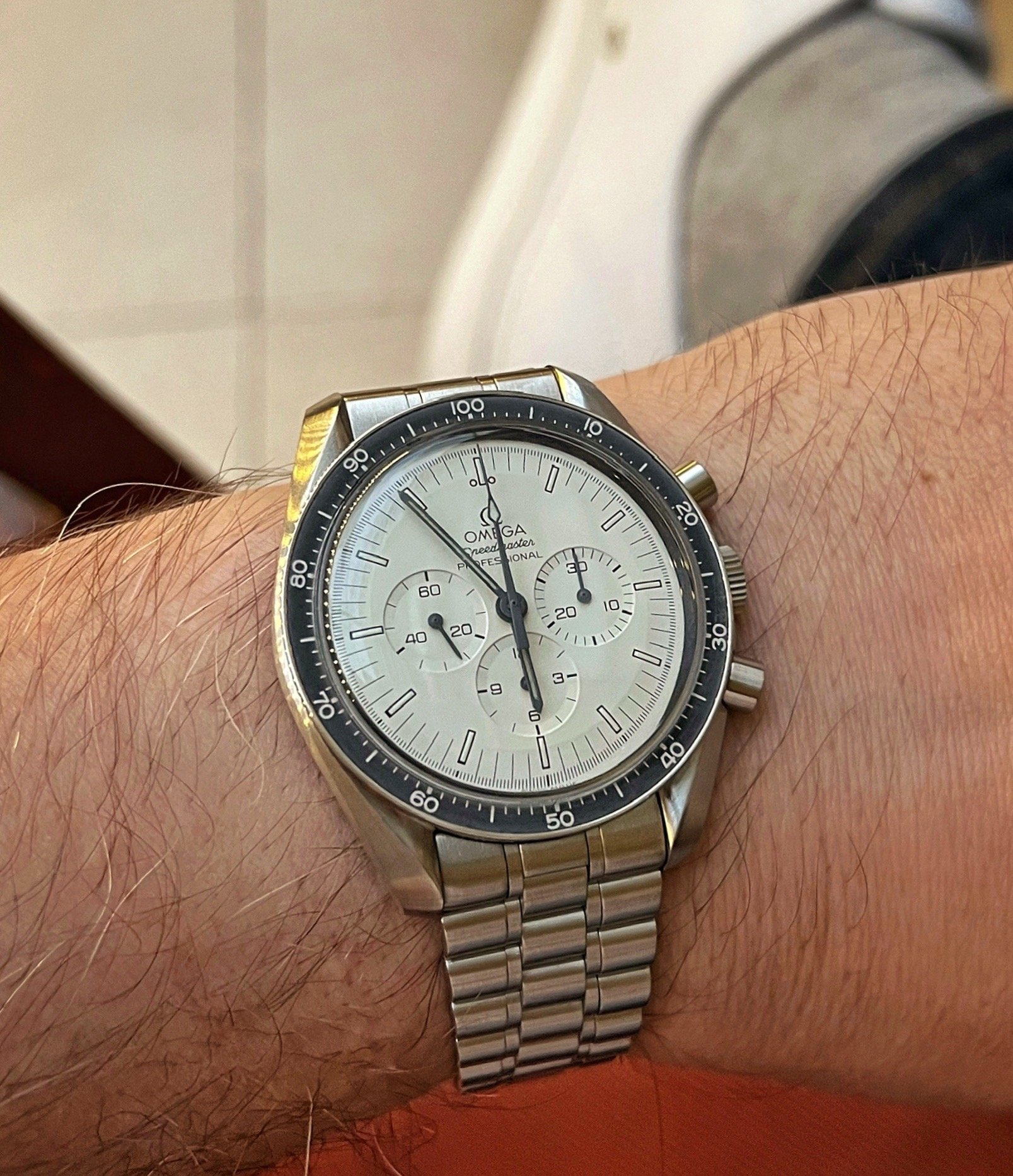 Im wearing my Italian dial Speedy a lot this summer. It鈥檚 a mod with a fully satin-brushed case with pushers and crown a la ST1, paired with the brushed bracelet from the new hesalite Speedmaster 3861, and a color-matched anthracite grey decimal bezel.