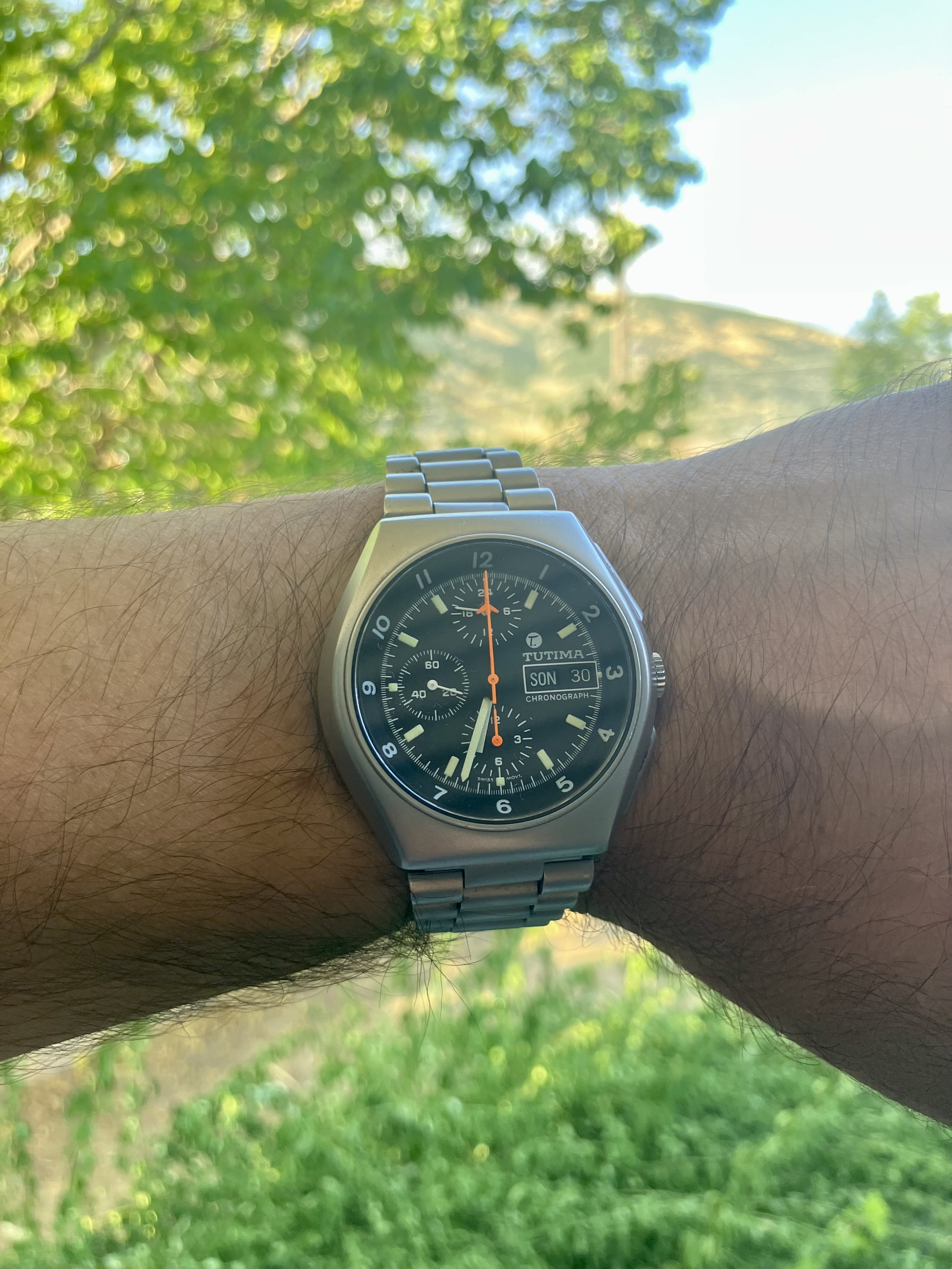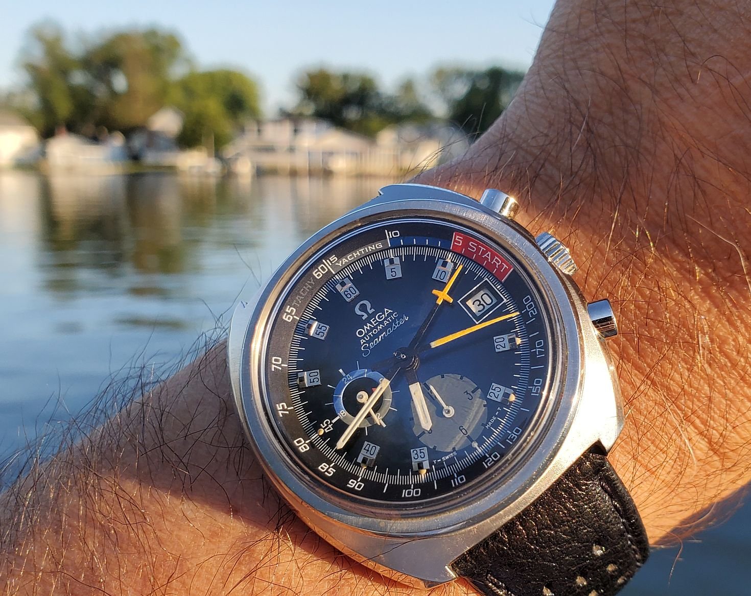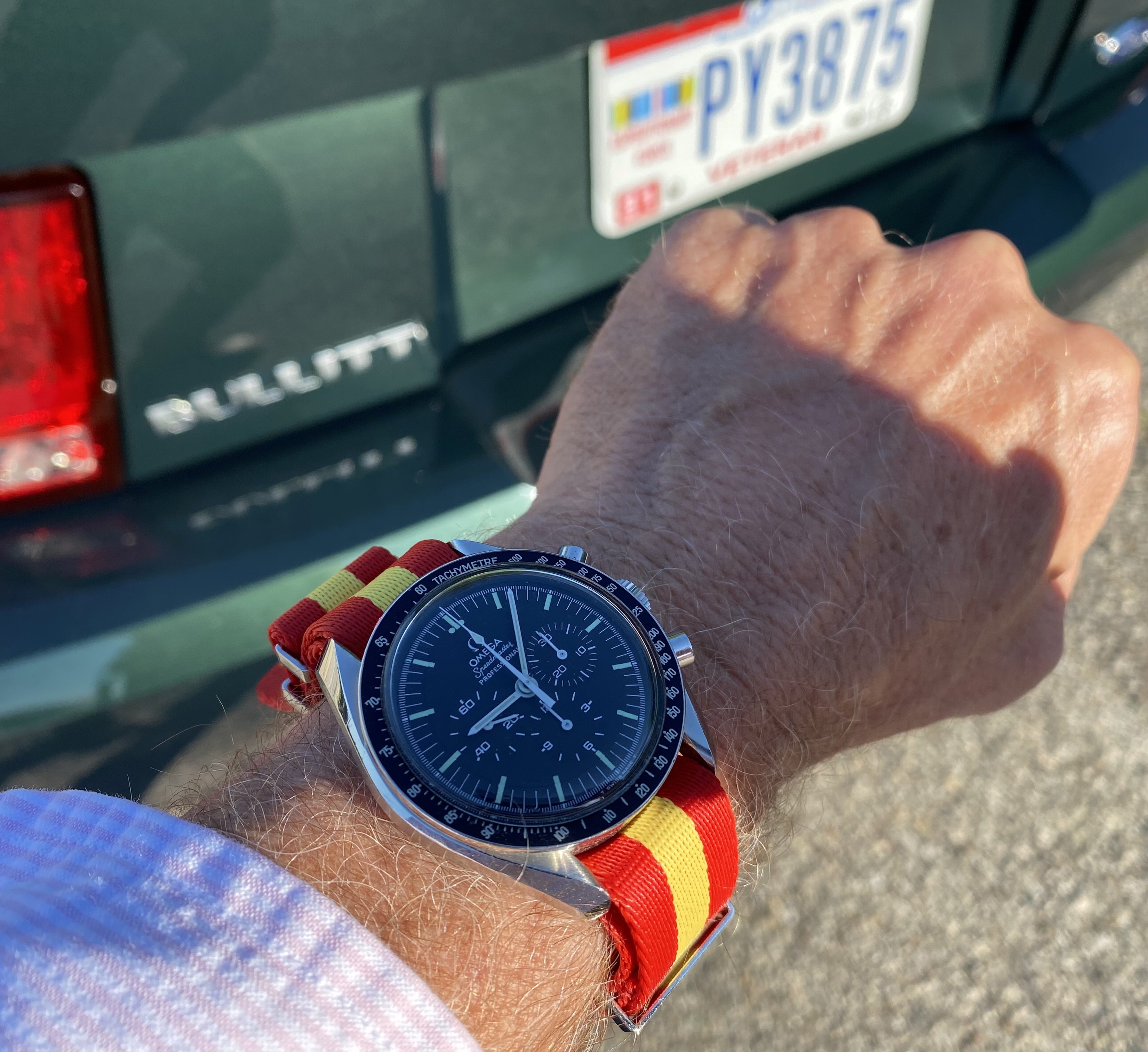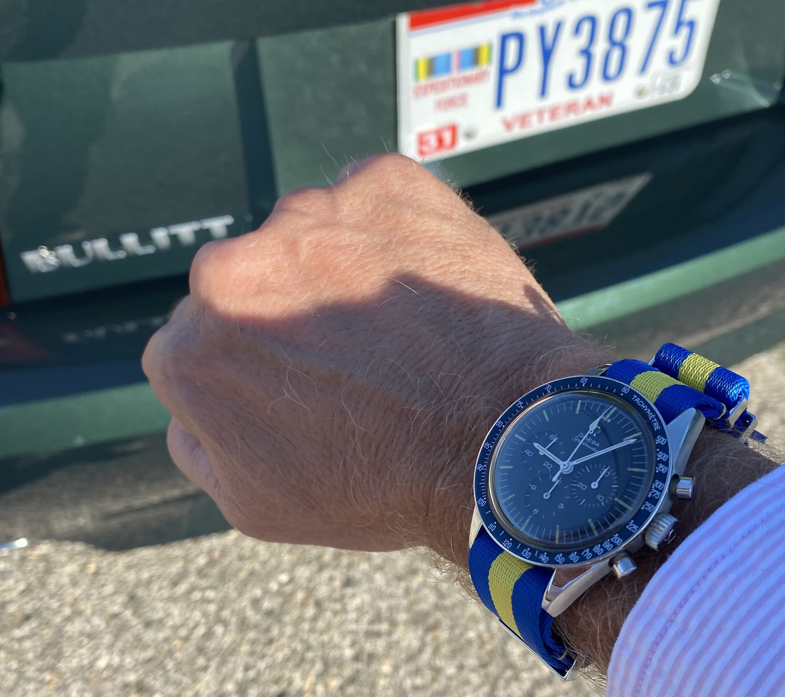 Double dog vintage Speedmasters for a local car cruise prior to church today…got my church clothes on already…got busted last week by our preacher lady because I blew off church to stay at the local car cruise [long story]…the plan today is to go directly to church [in my 2001 Ford Mustang Bullitt GT] from the local car cruise…
