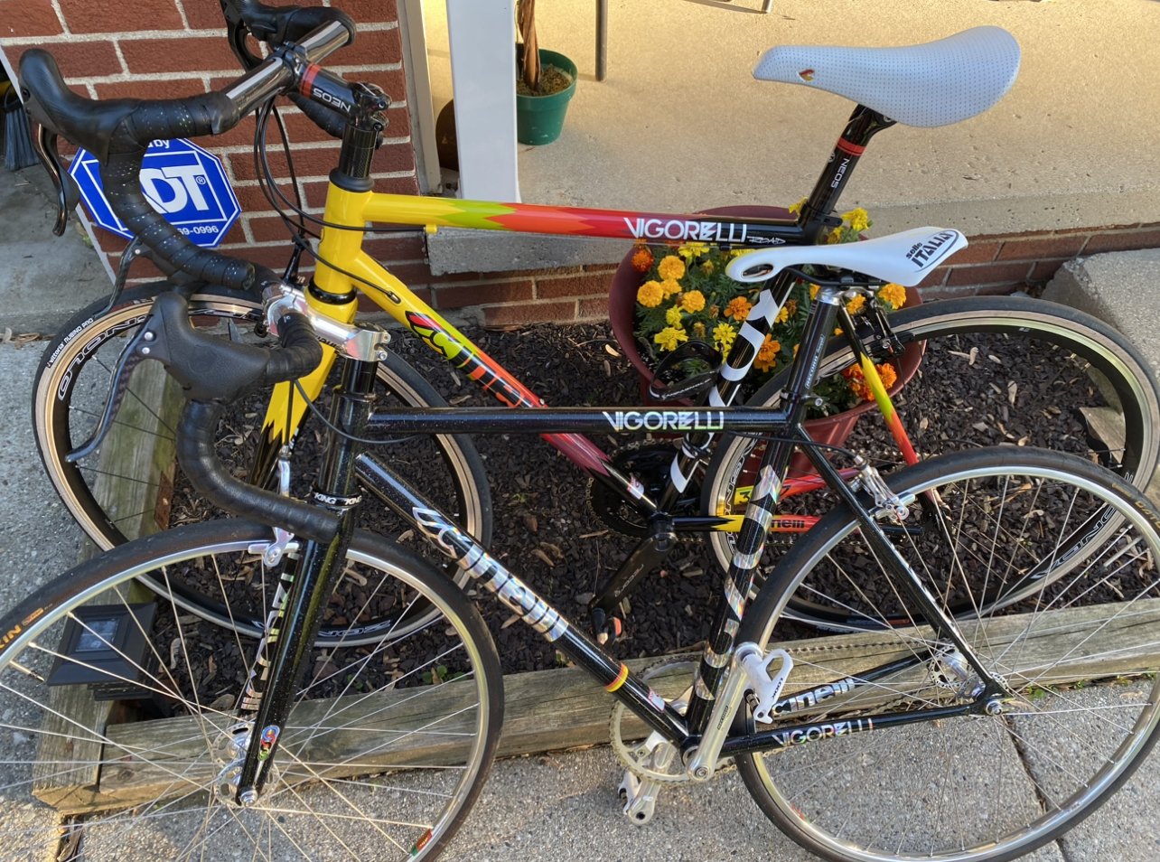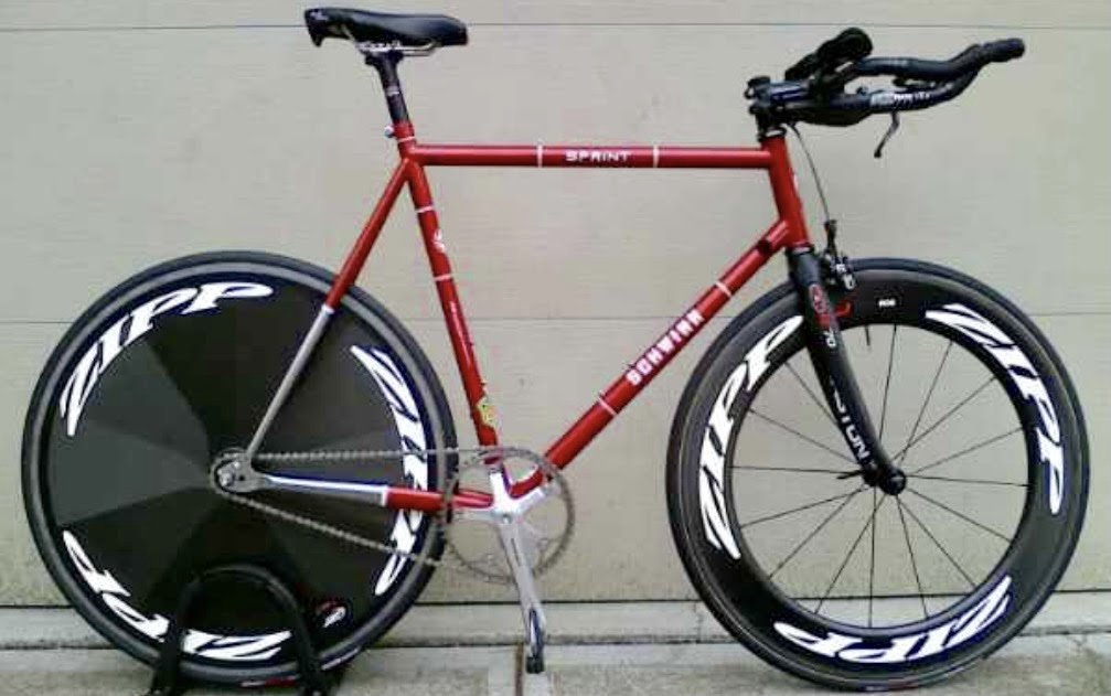 LATE ENTRY: I continue to ride my fixed gear Sprint quite often but not with the Zipp tubulars or aero bars pictured above. I will say that my fixed gear Sprint attracted quite a bit of attention when I showed up with it at road TT races since I was the only one racing a fixed gear TT bike…as well as it being the only Schwinn. I had to study the terrain prior to road TT races and make a “best guess” what the optimal gearing would be…I have the entire set of Dura-Ace track cogs [13, 14, 15, 16] and an incomplete set of Dura-Ace track chain rings from 50 to 55. Most of the time I was running a 50/14 or a 51/14 combo for longer TTs and then a 55/13 for shorter/flatter TTs. Since I’m a masher, I would try to get an average cadence of about 75-80 rpm during a TT. I currently ride it recreationally and on “spirited” group rides in a 50/15 combo with Mavic Open Pro clincher wheels laced up to high flange Dura-Ace track hubs.