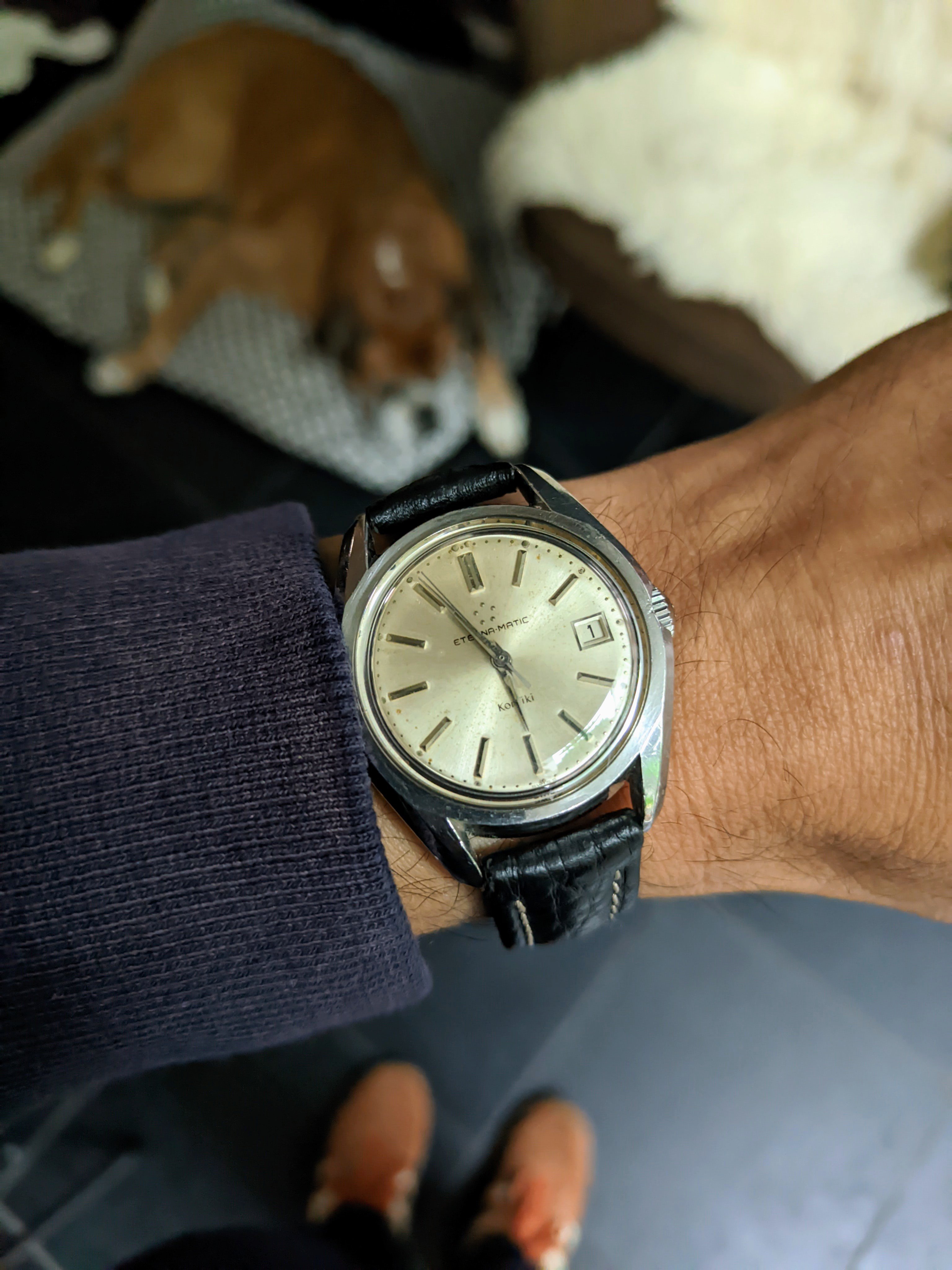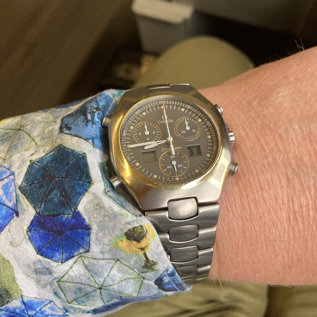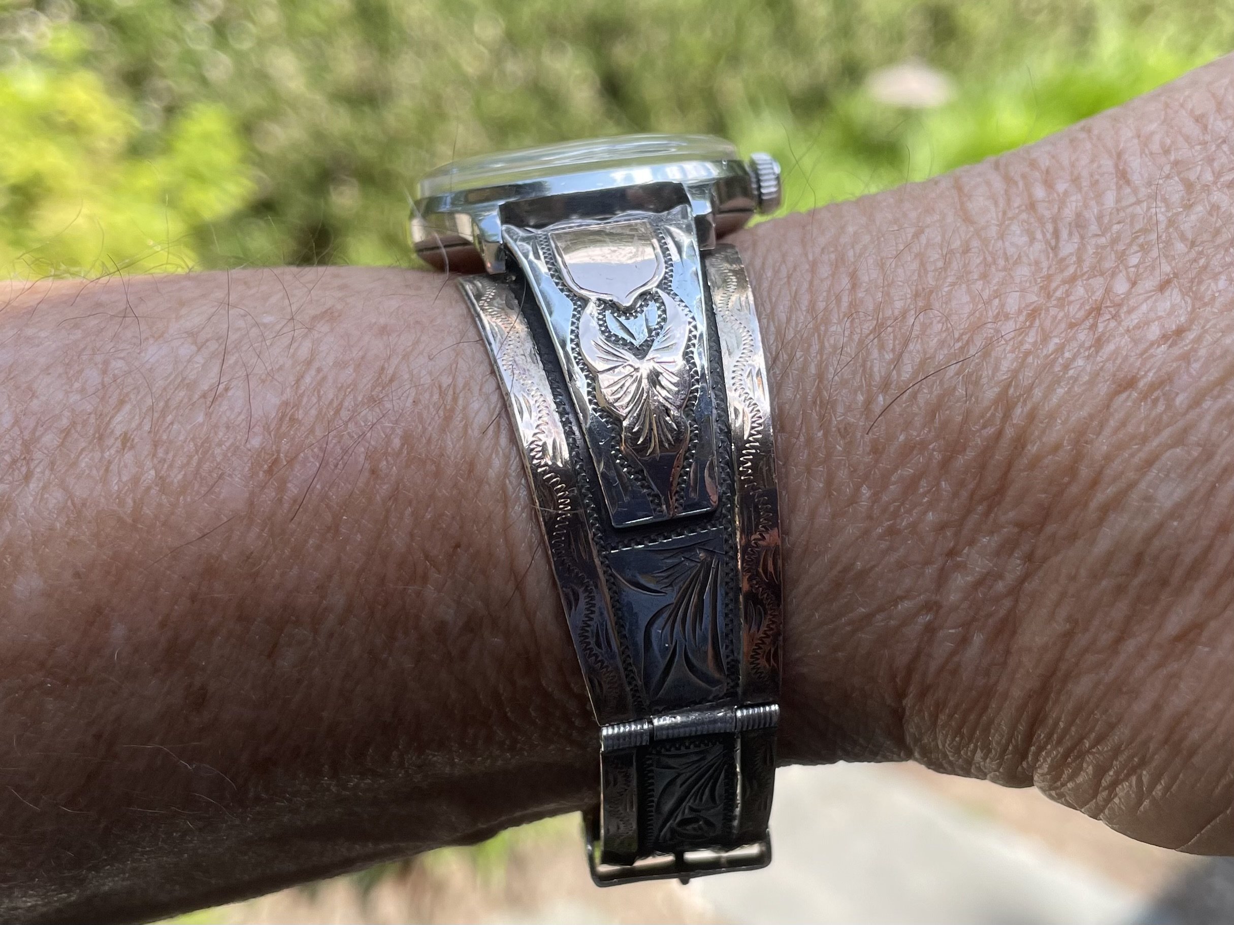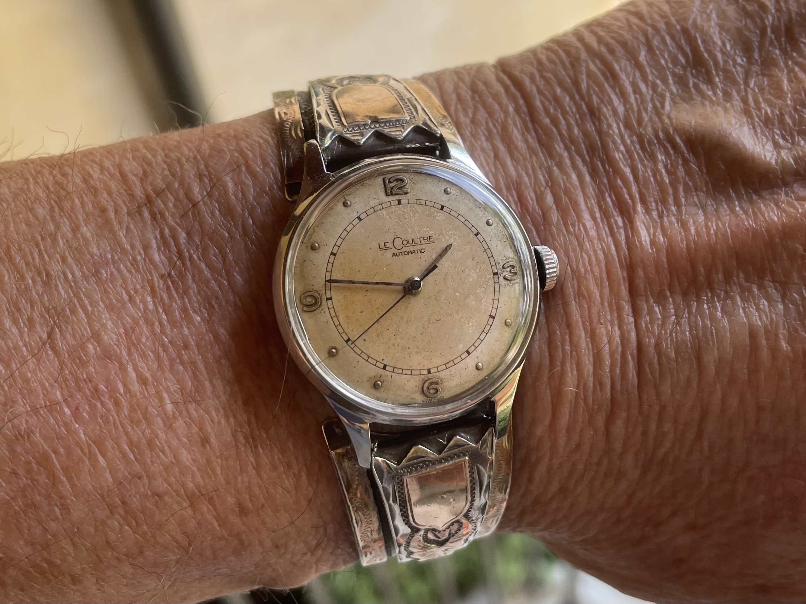 Gave into being a U.S. male senior citizen and recently purchased a Mexican carved silver and gold watch bracelet, coupled here with a 1946-47 LeCoultre bumper.