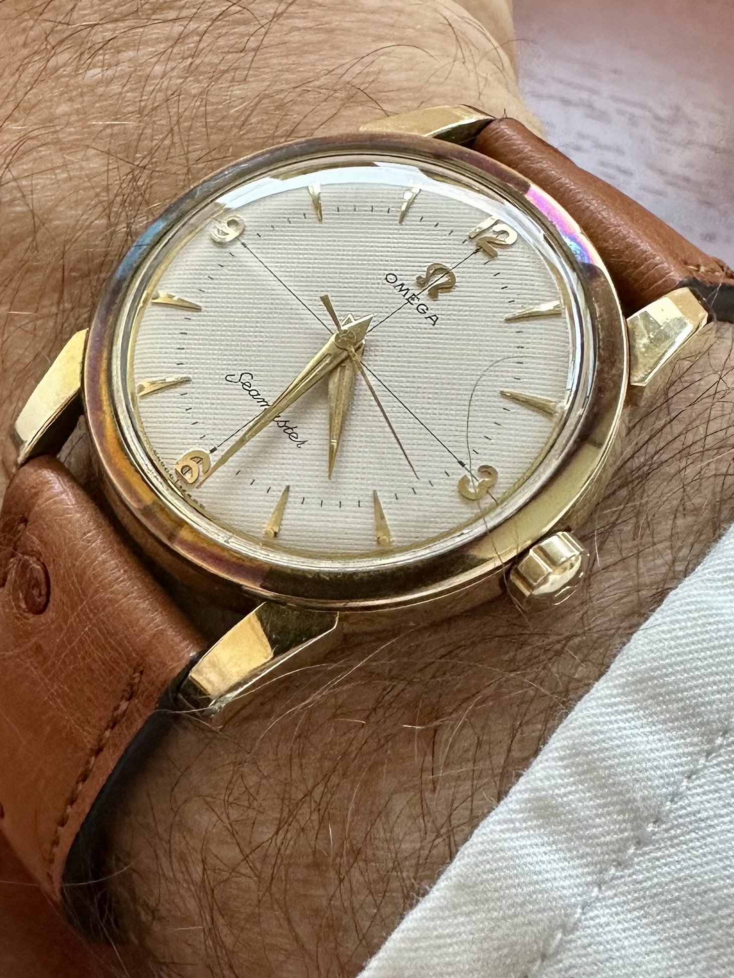 Posts 9,768 Likes 54,808 gbesq ·Aug 11, 2023 Good day all. 1956 Seamaster 2761 in gold cap with a crosshair waffle dial. Edited: Aug 11, 2023