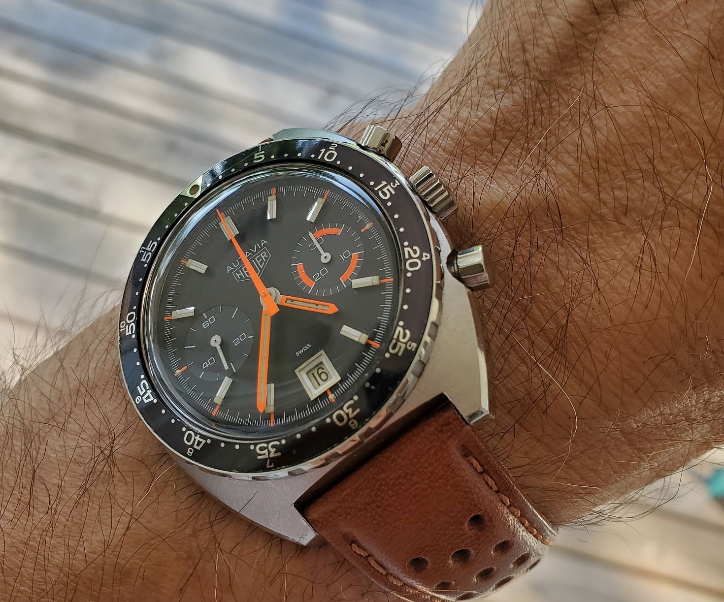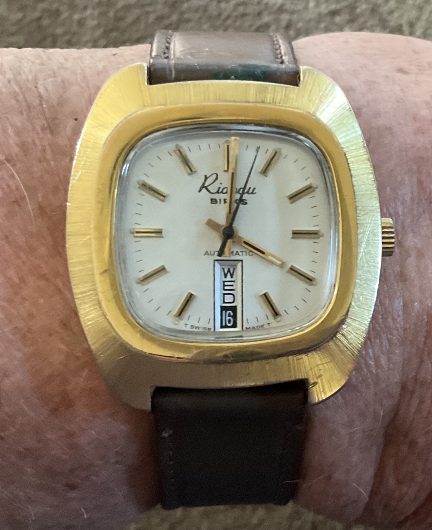Spending a few days camping with friends at Elk Flats campground in the Rockies. I usually wear an orchard run watch when camping. Don’t want to trash a significant watch. So today my sacrificial watch is a 50 year old (or so) automatic day/date for Henry Birks & Sons Jewellers in Canada. I’ve had this for 50 years and wear it only seldom. It’s a good runner, and a bit different.