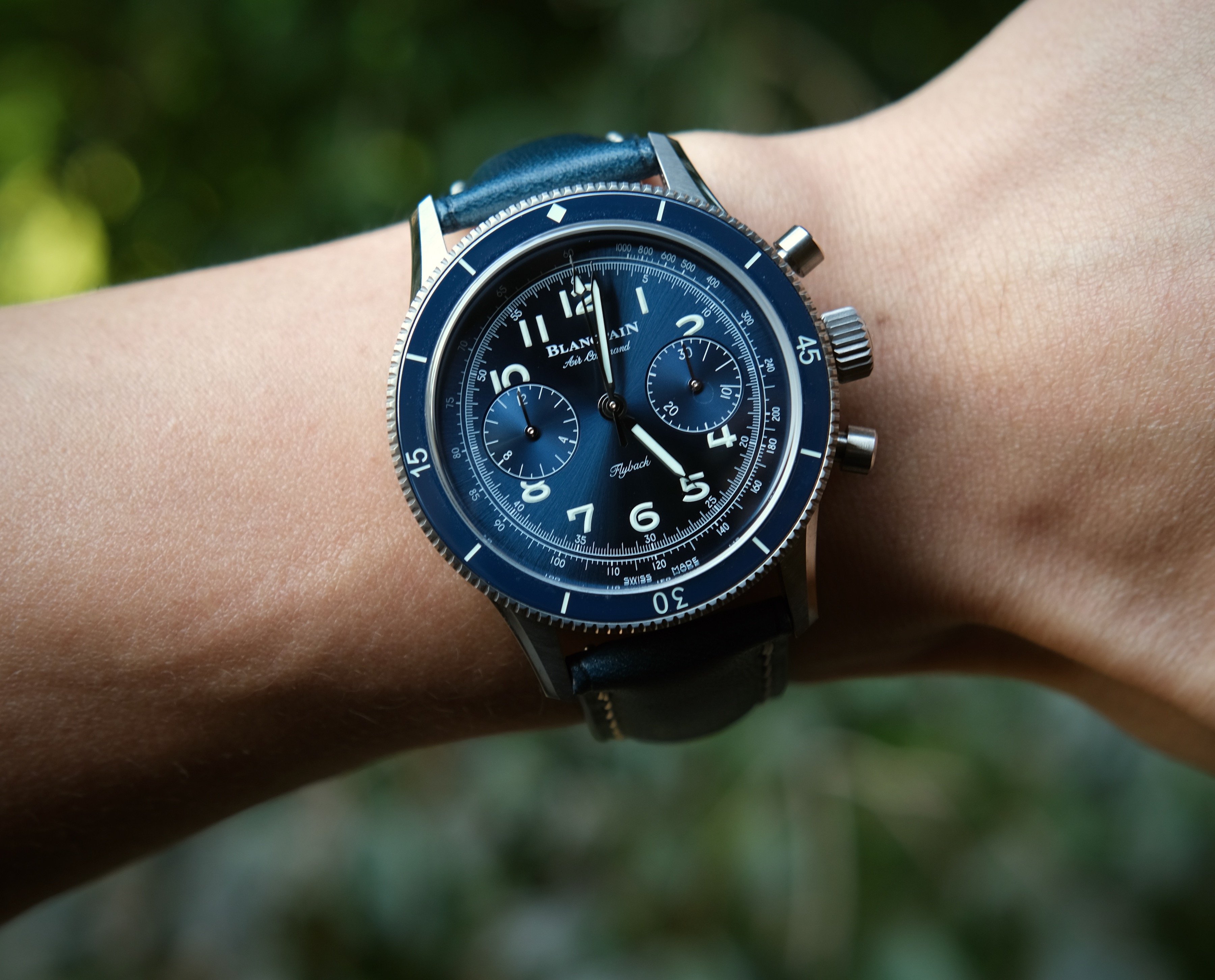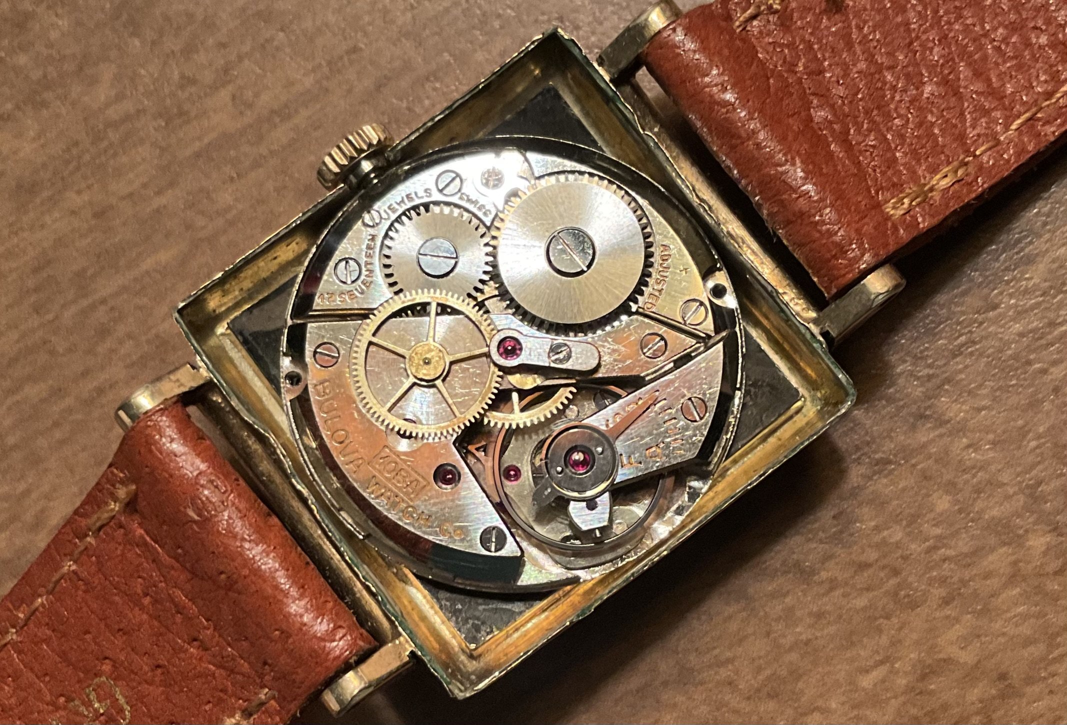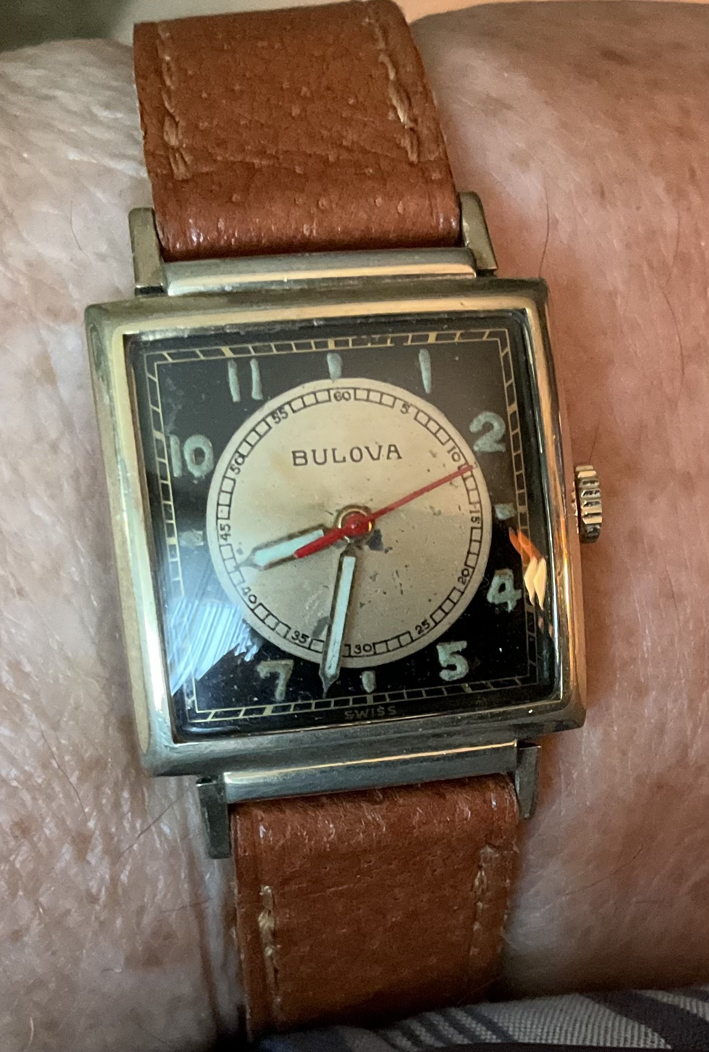 Time for a change. Off with the Rolex Oyster Air-King Date, and on with my 1943 Bulova “Blackhawk”. One of a series that ran for about 4 years in the early 1940s, with minor cosmetic changes, year to year. 80 years old, and a good performer. Reconditioned, NOS glass crystal, new red sweep seconds hand, 17-jewel manual wind, Bulova 10BA movement.