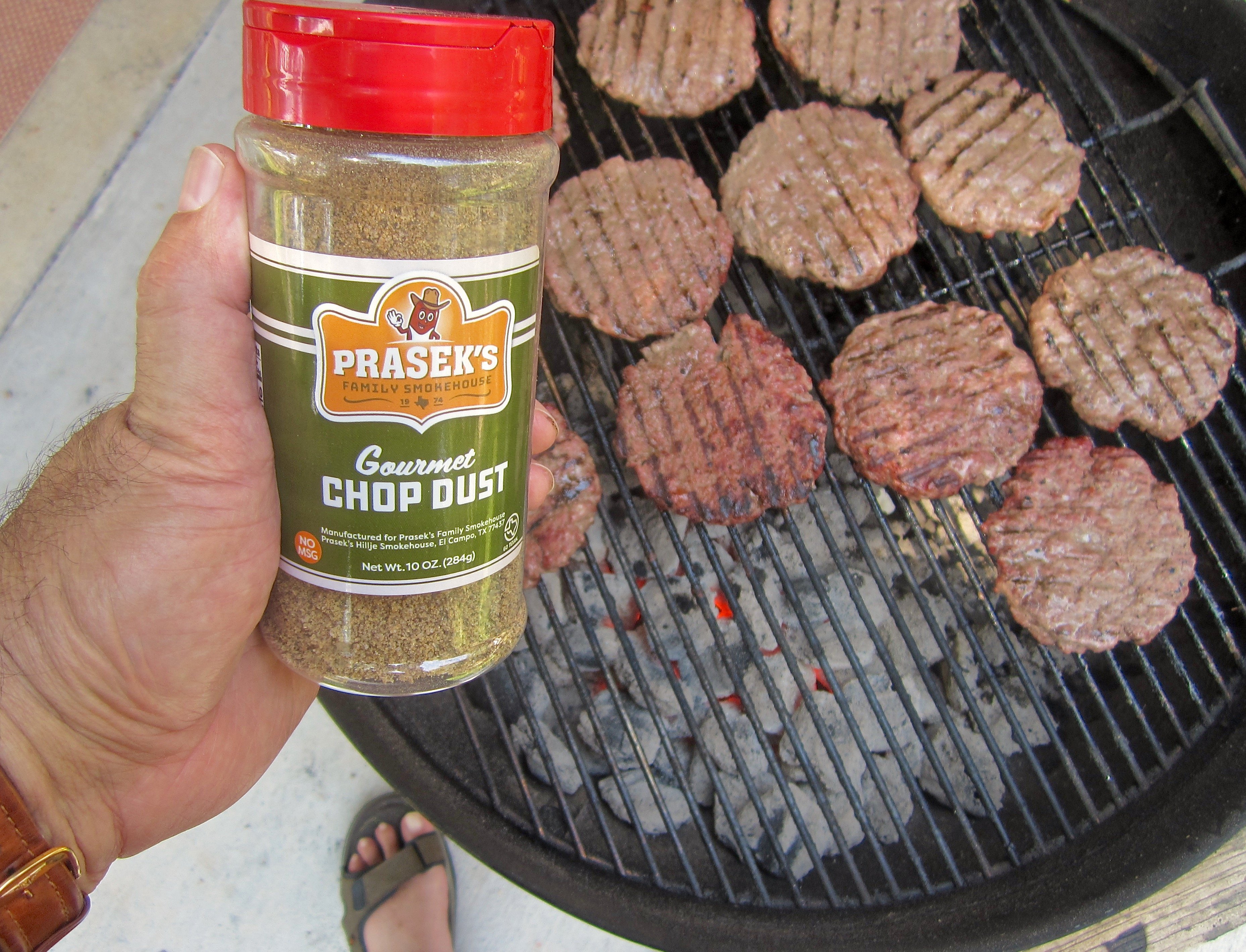 100 % Texas whitetail venison patties grilling. For guests preferring beef, the ground rib eye patties have already come off. Just a little smidgen of Chop Dust and ... yum!
