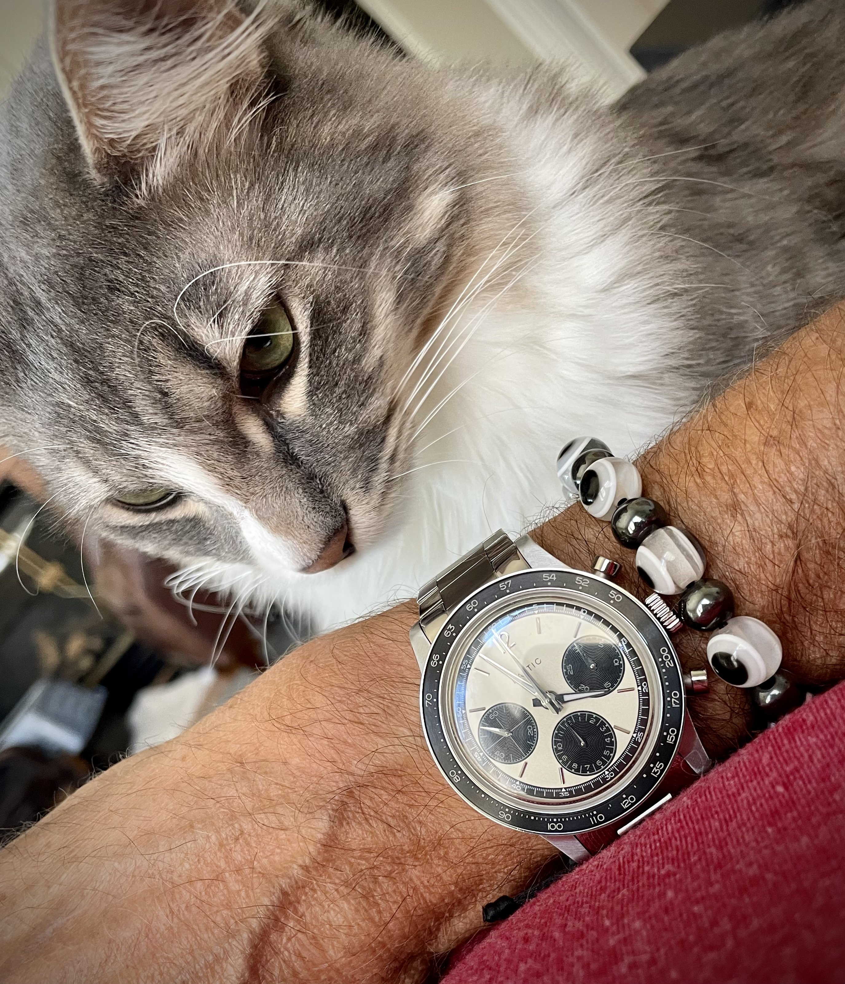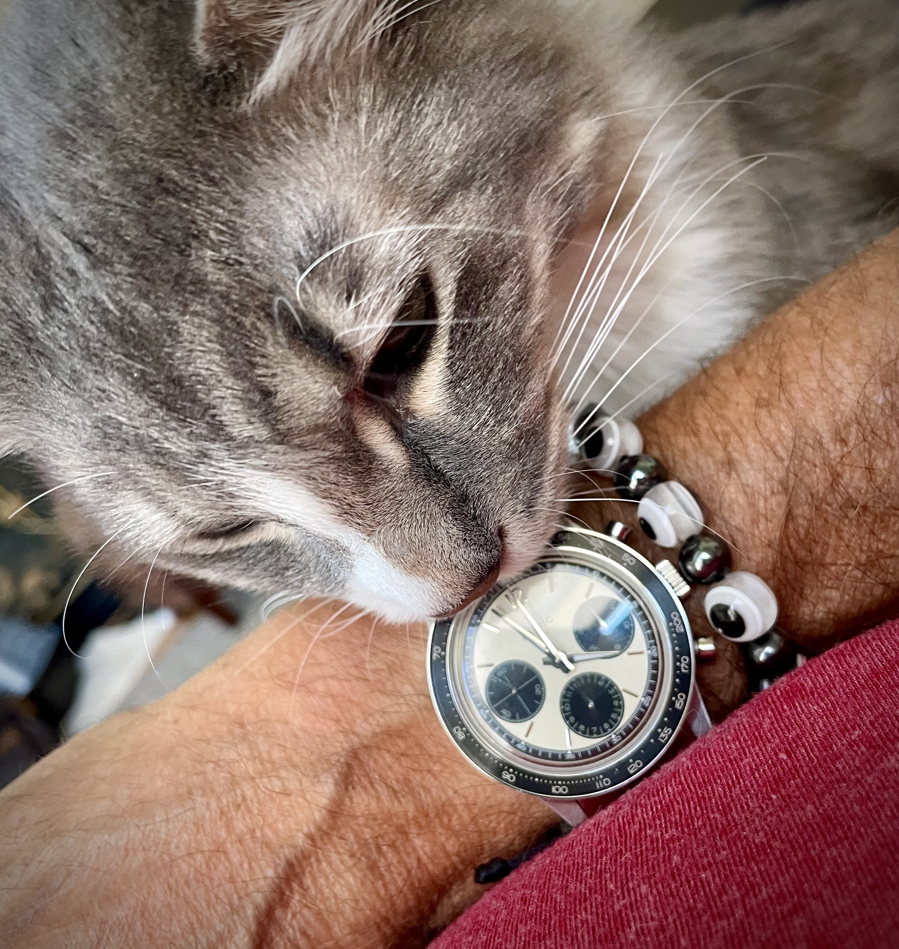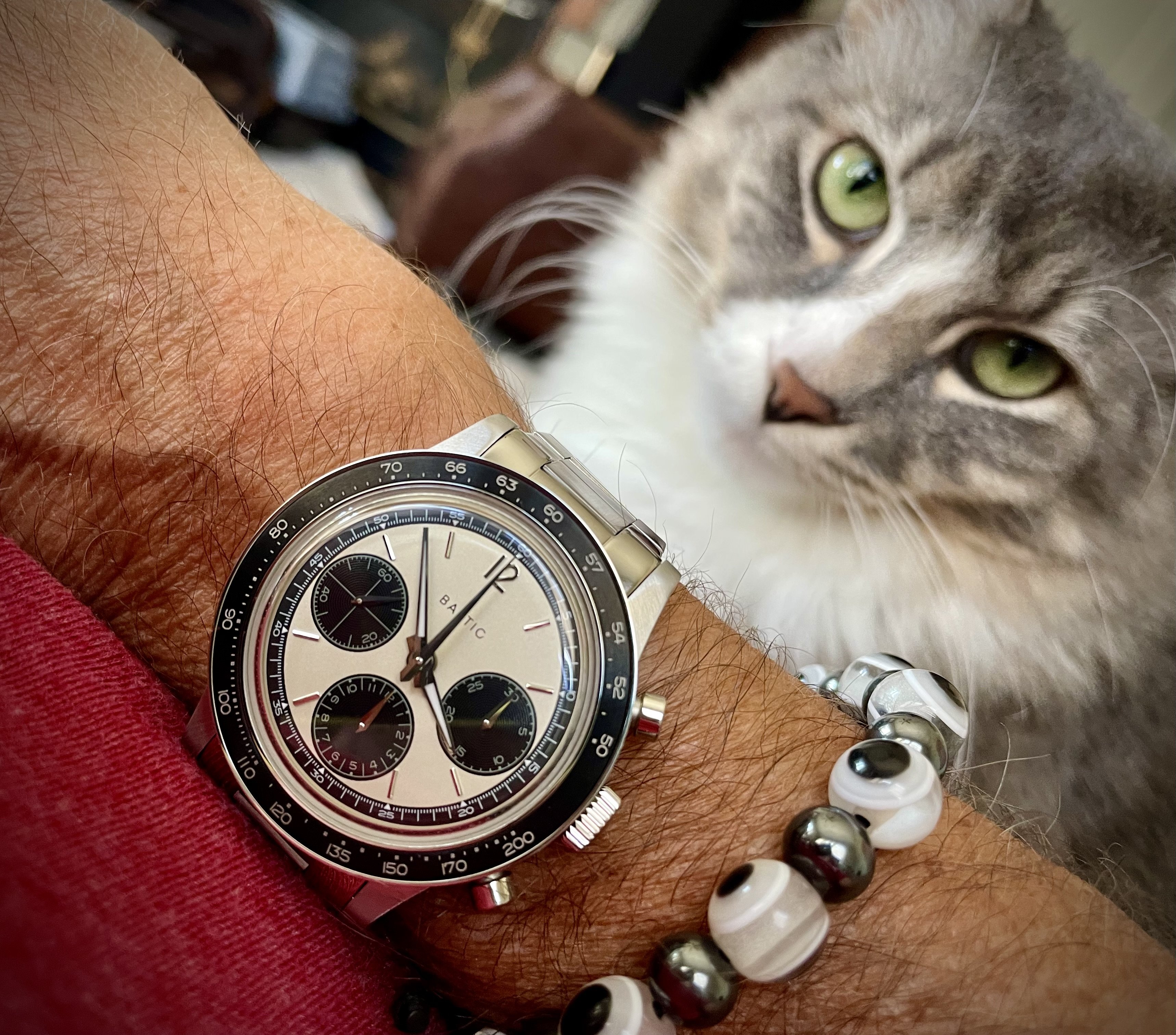 here she is admiring our latest arrival, my Baltic TriCompax: