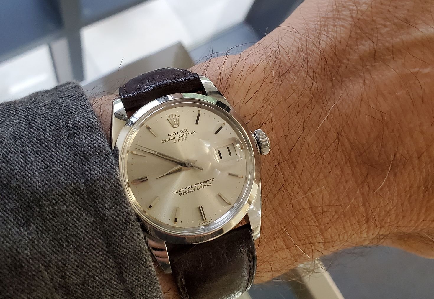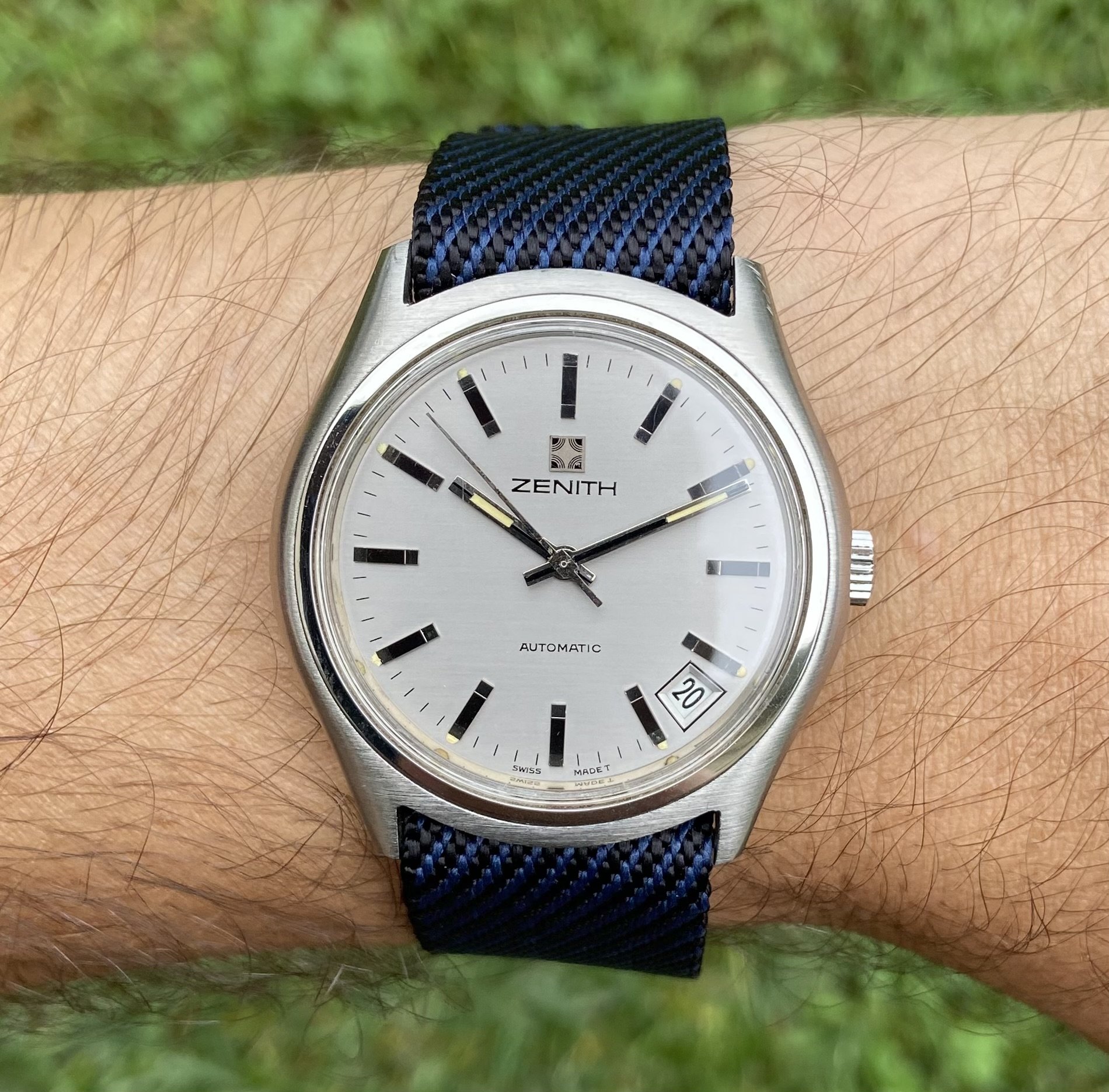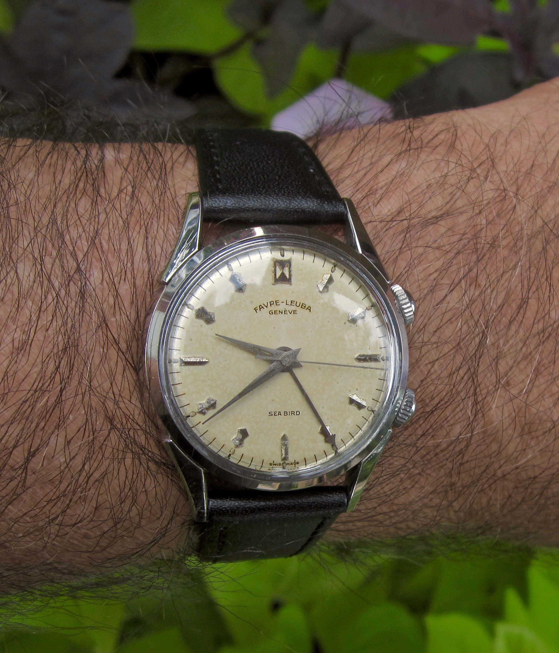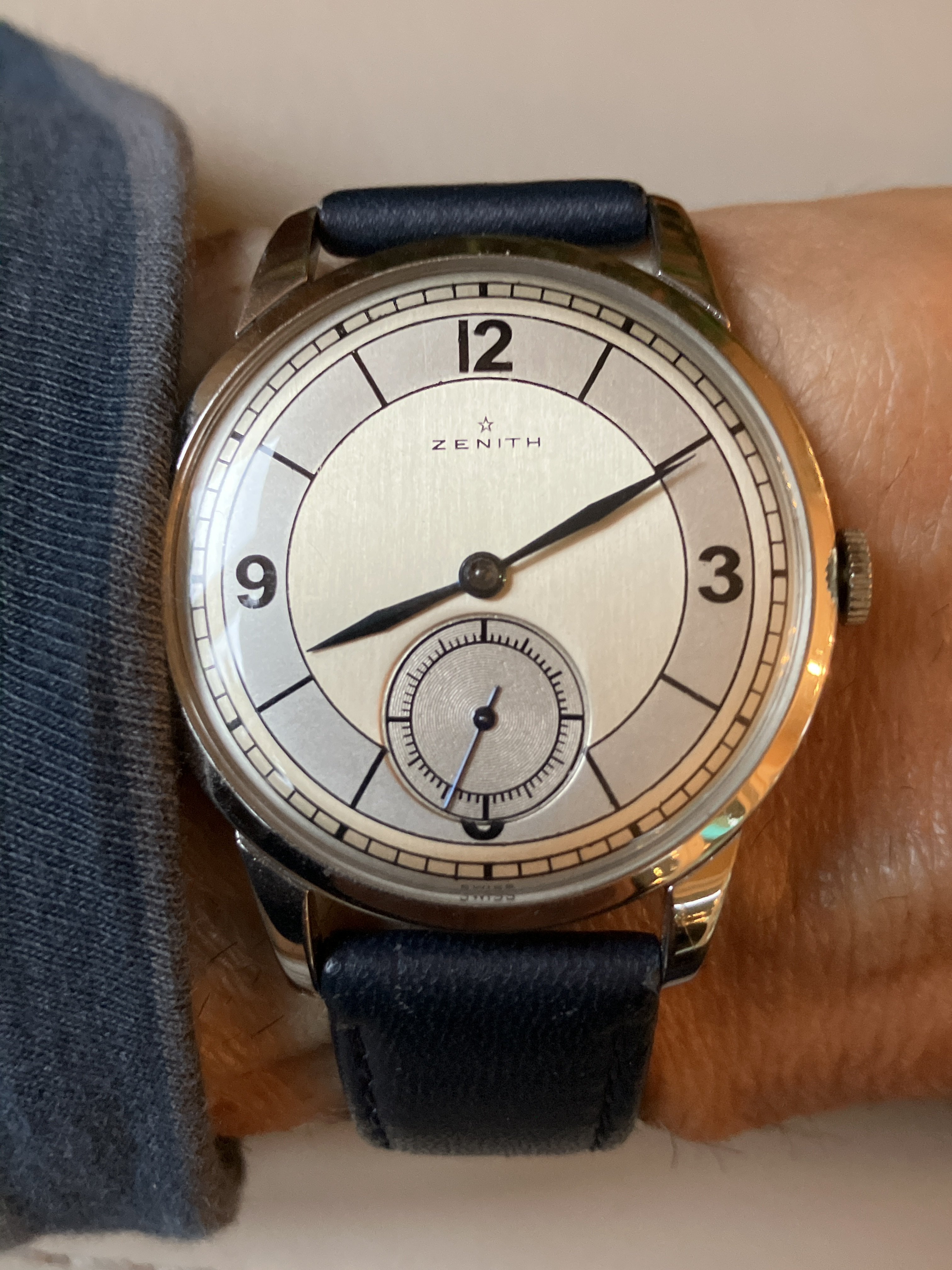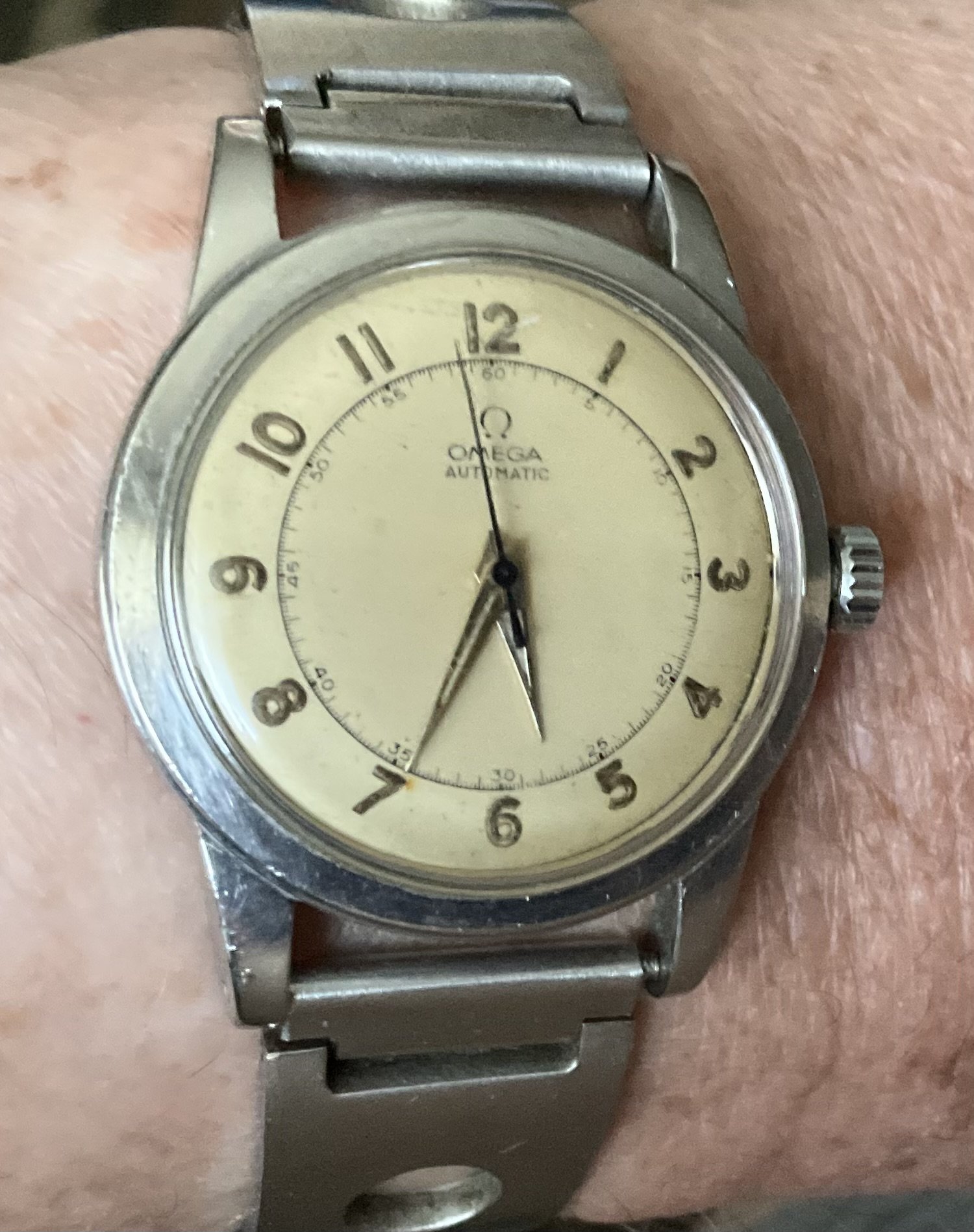 A watch with a story. It came to me as a result of a barter deal. I repaired a couple watches for a friend, and ended up with an Omega watch. Not this watch, exactly. The Omega came to me with a gold filled case that appeared to me as though someone had deliberately set out to destroy it! It had a horrible dial. But surprisingly, the bumper automatic movement was in good condition, it needed a mainspring and servicing. I had a donor Omega case on hand, a better dial, and I did the required service, including a generic crystal and crown. The bracelet in an after market clone with an Omega buckle that was too small for me. I built a 1/2 link to extend the bracelet. This would not be a grail watch for most people, but it is a good runner, and I like it. It will do for our upcoming jaunt in the trailer, for 5 days. Circa 1952-53.