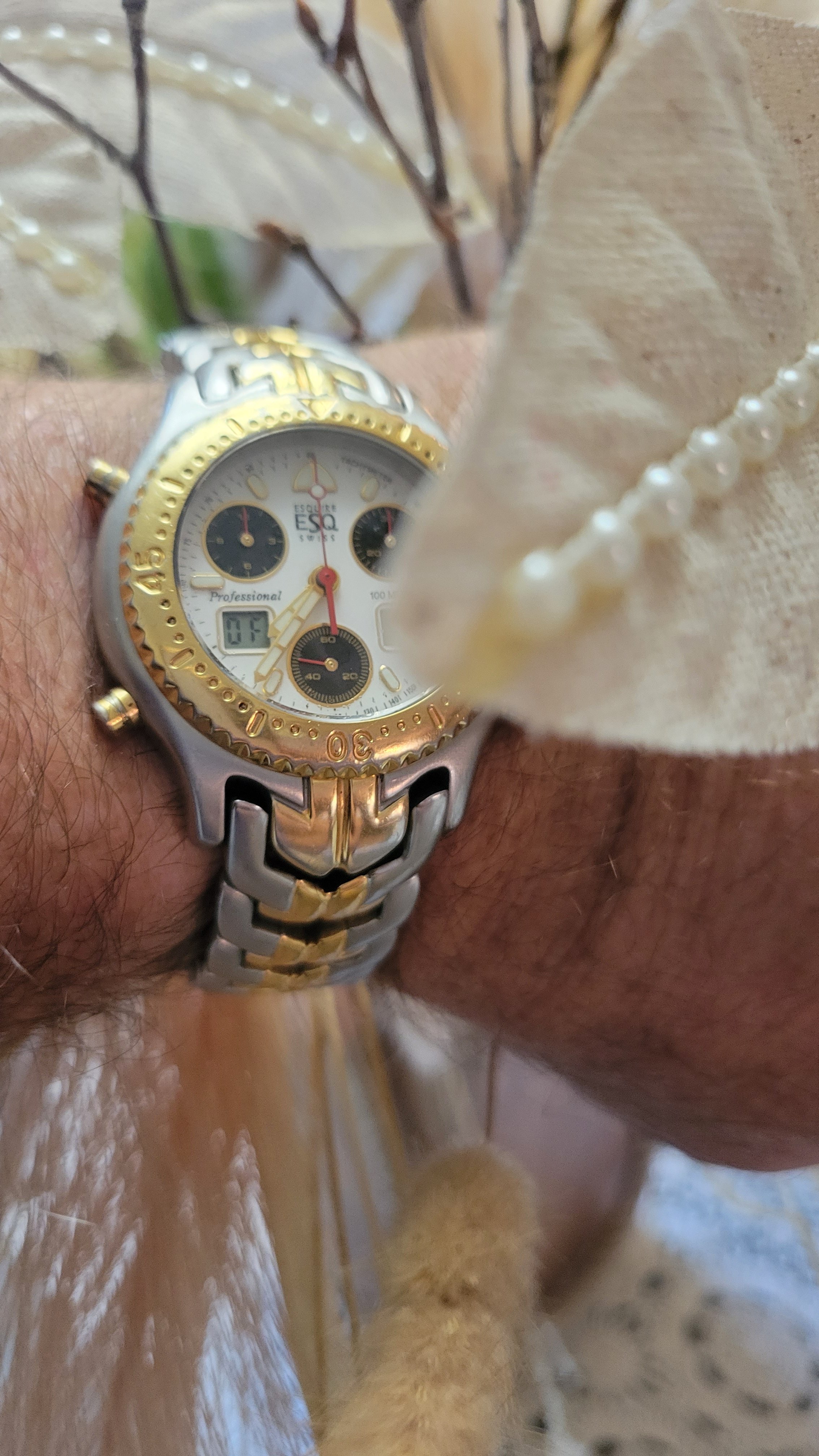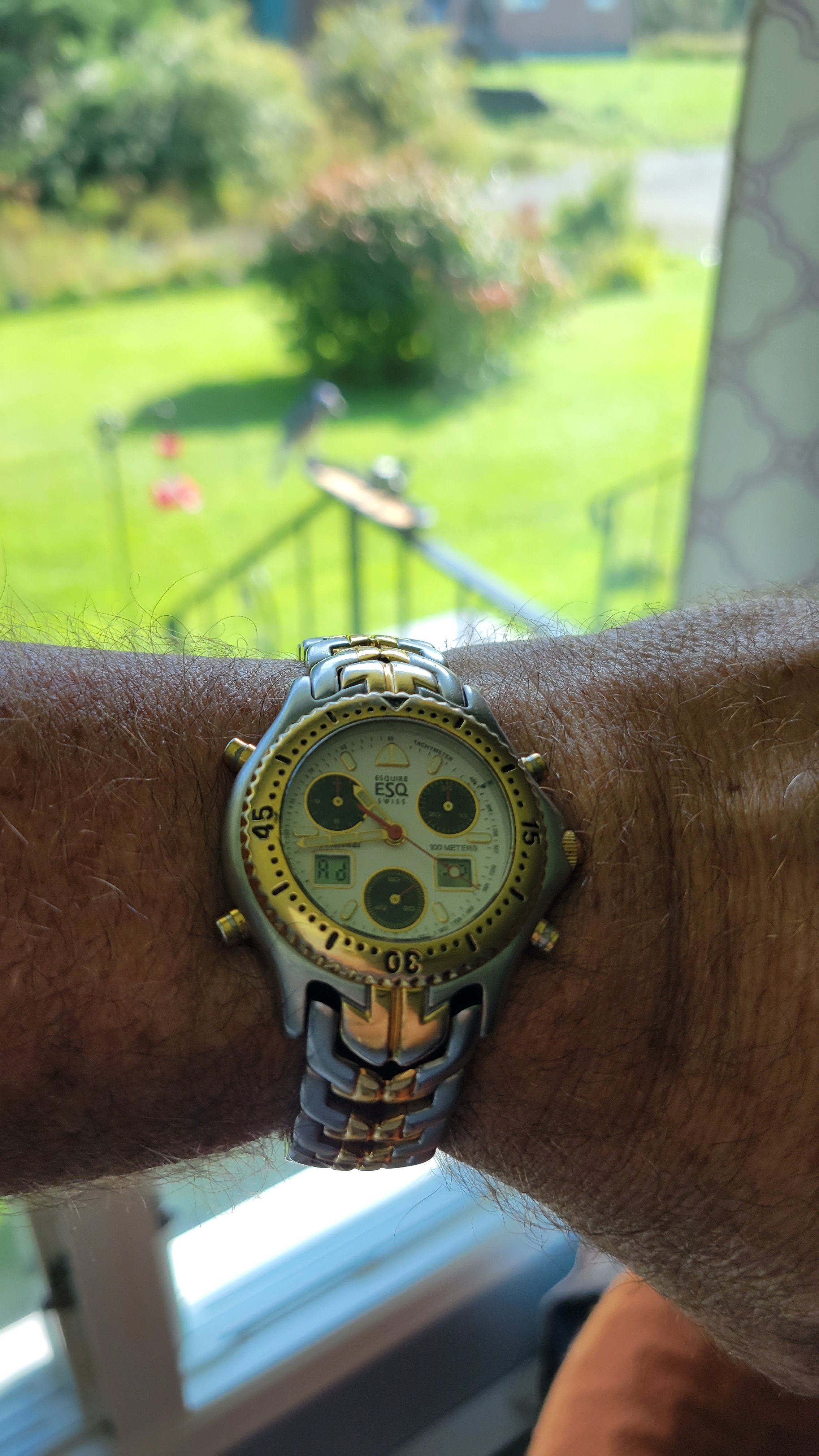 Starting the day with the Tag Heuer built ESQ 9500 SLX. Tag made this watch for 3 brands. Themselves it was of the Link collection they also made an offshoot watch called the Senna in recognition of the great driver which include digital functions along with analog. For ESQ as a high end quartz Chronograph and another brand I can't recall at this time. This is a great watch and highly comfortable with the Link styled bracelet.