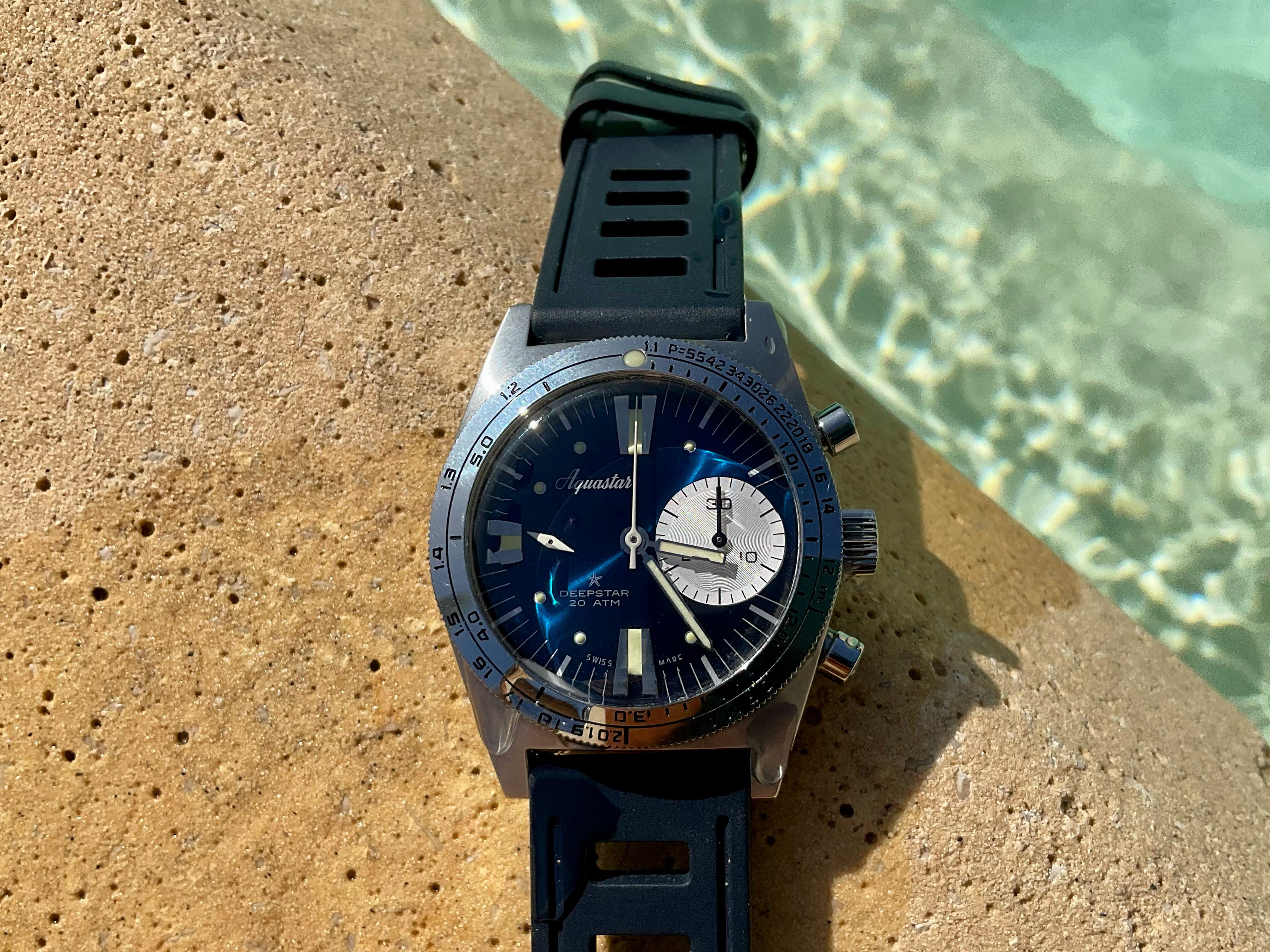 Do you see what’s special about this beautiful glossy lacquer with gilt print dial? - No “T Swiss Made T” designation. This is an early “Swiss Made“ only dial, meaning a Radium example, not often seen in the Ref. 7085. These dials were same as some 2nd Generation 5913 in very early 7085 production runs. Titus’s production of the two overlapped and they also likely used left over parts before using newer parts, creating these early "transitional" models. - Rare & early 1960’s “Transitional” Titus Calypsomatic Ref 7085 “Big Crown” (3rd execution) - ETA 2472.