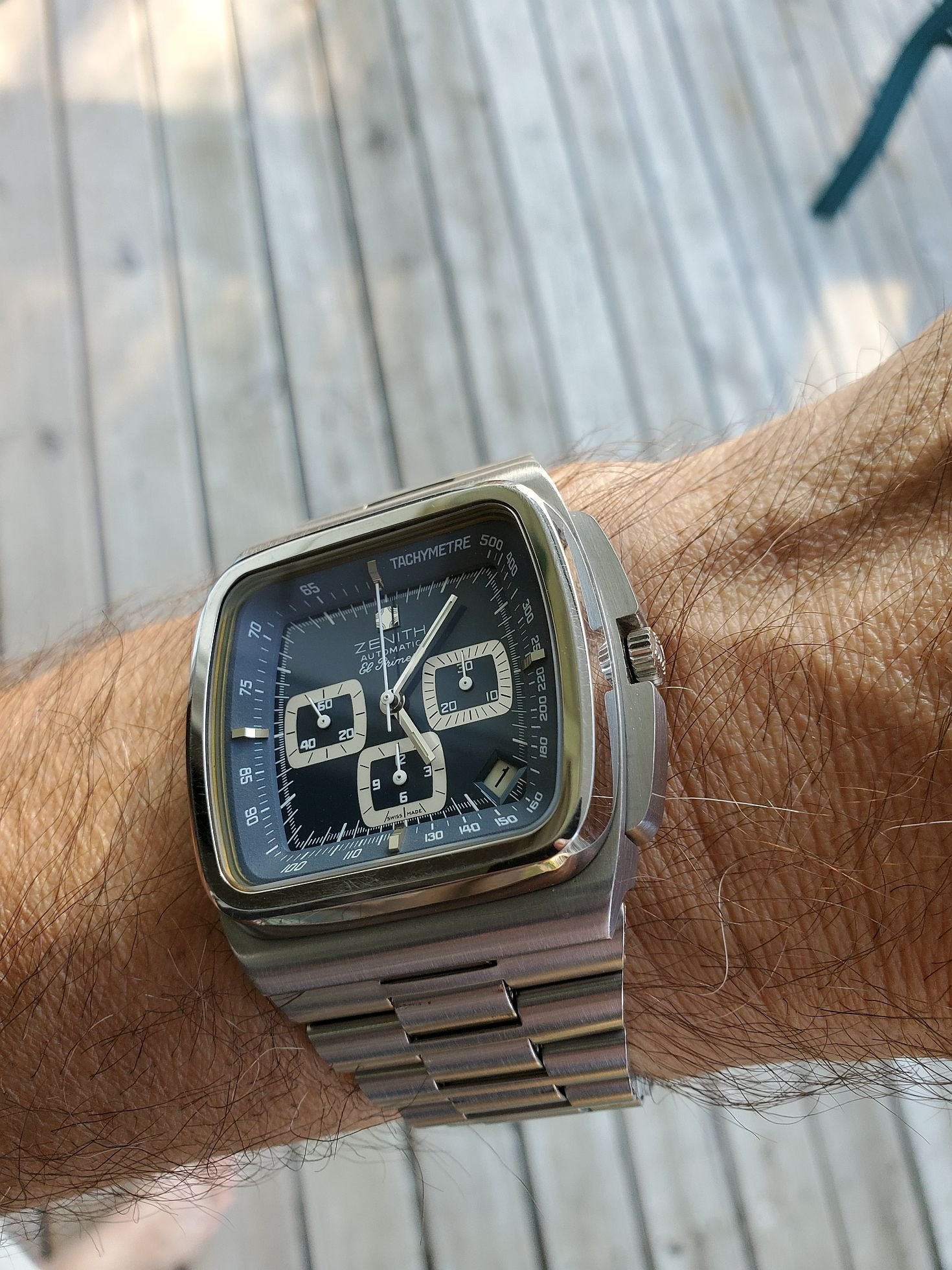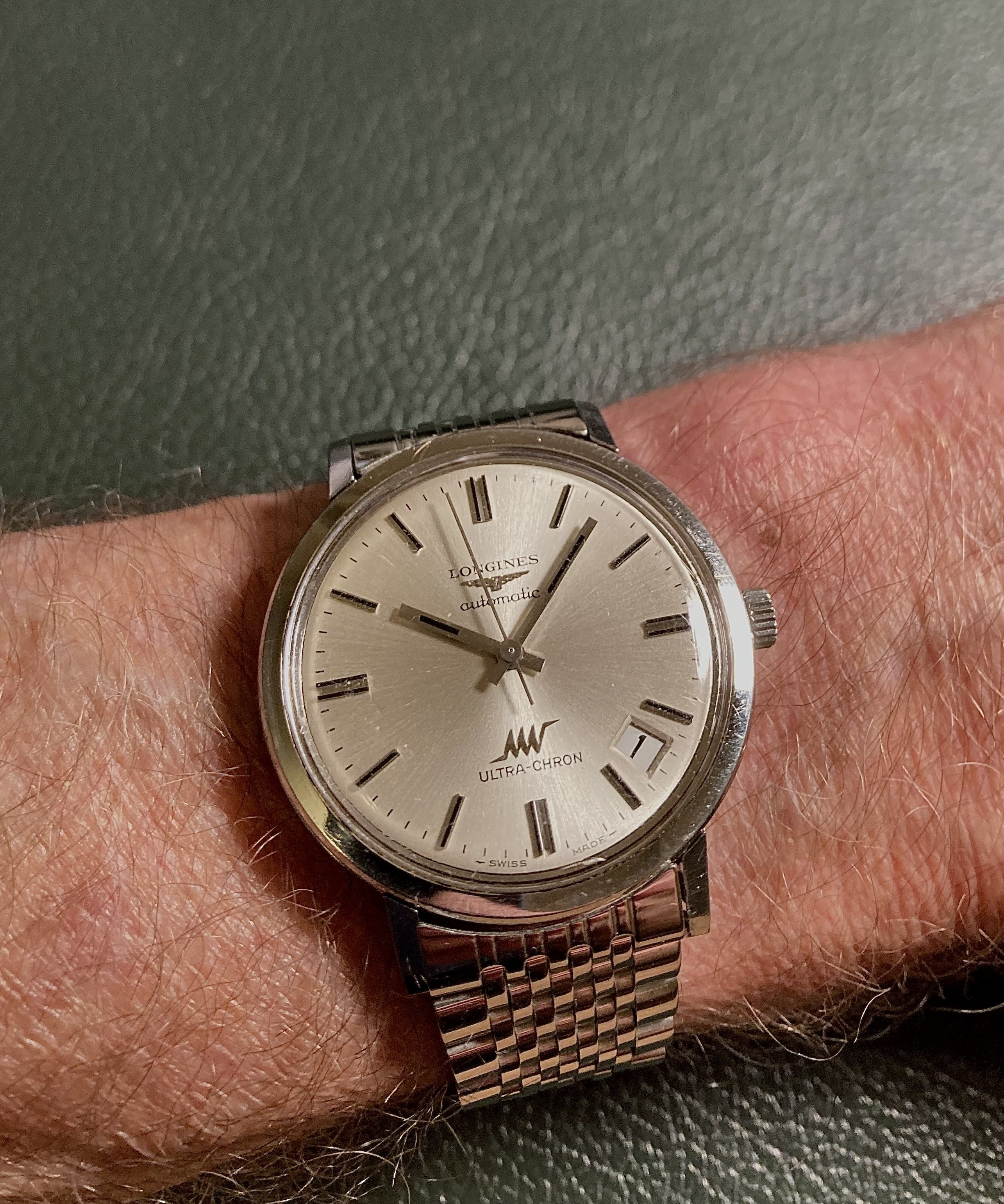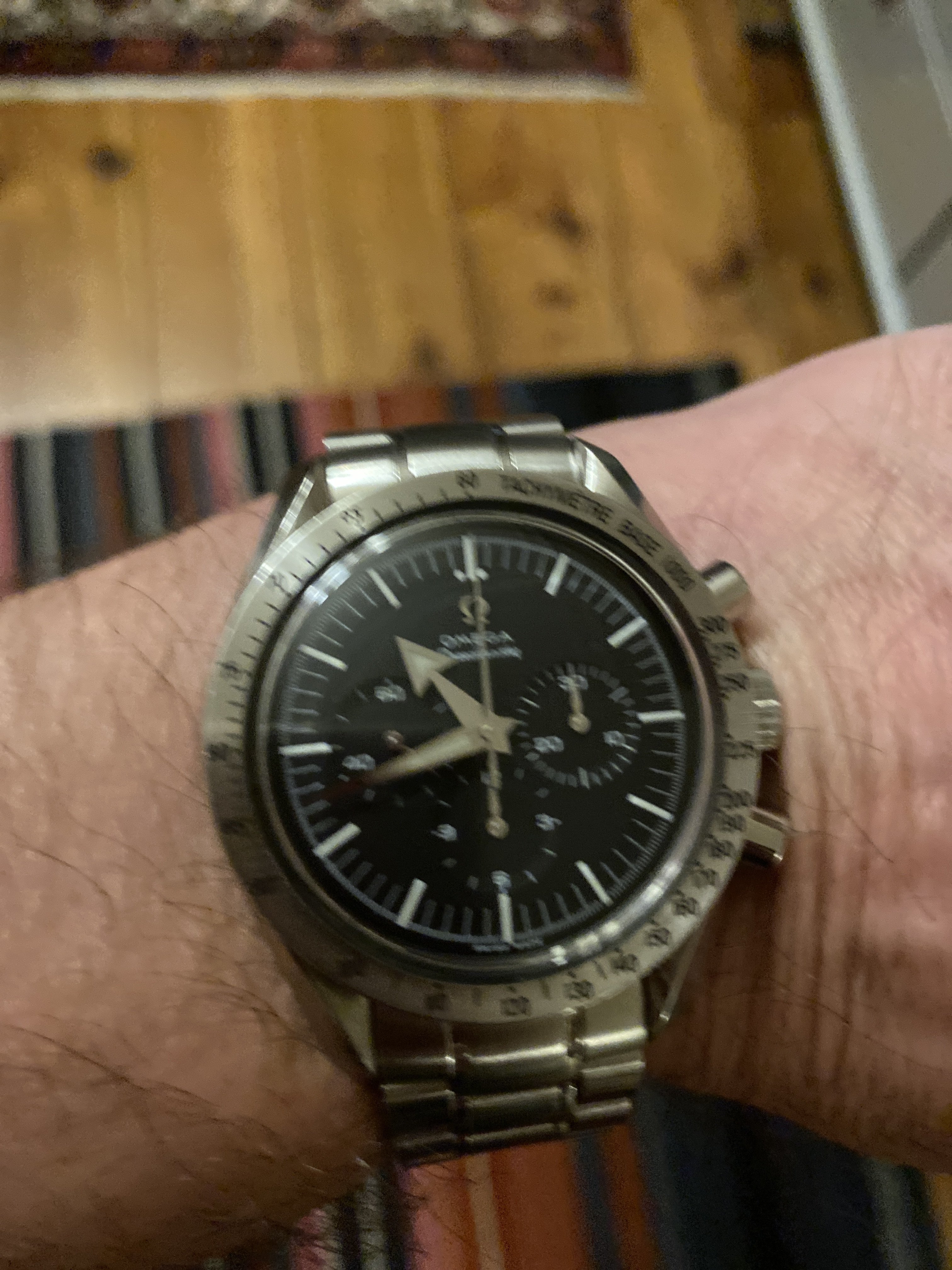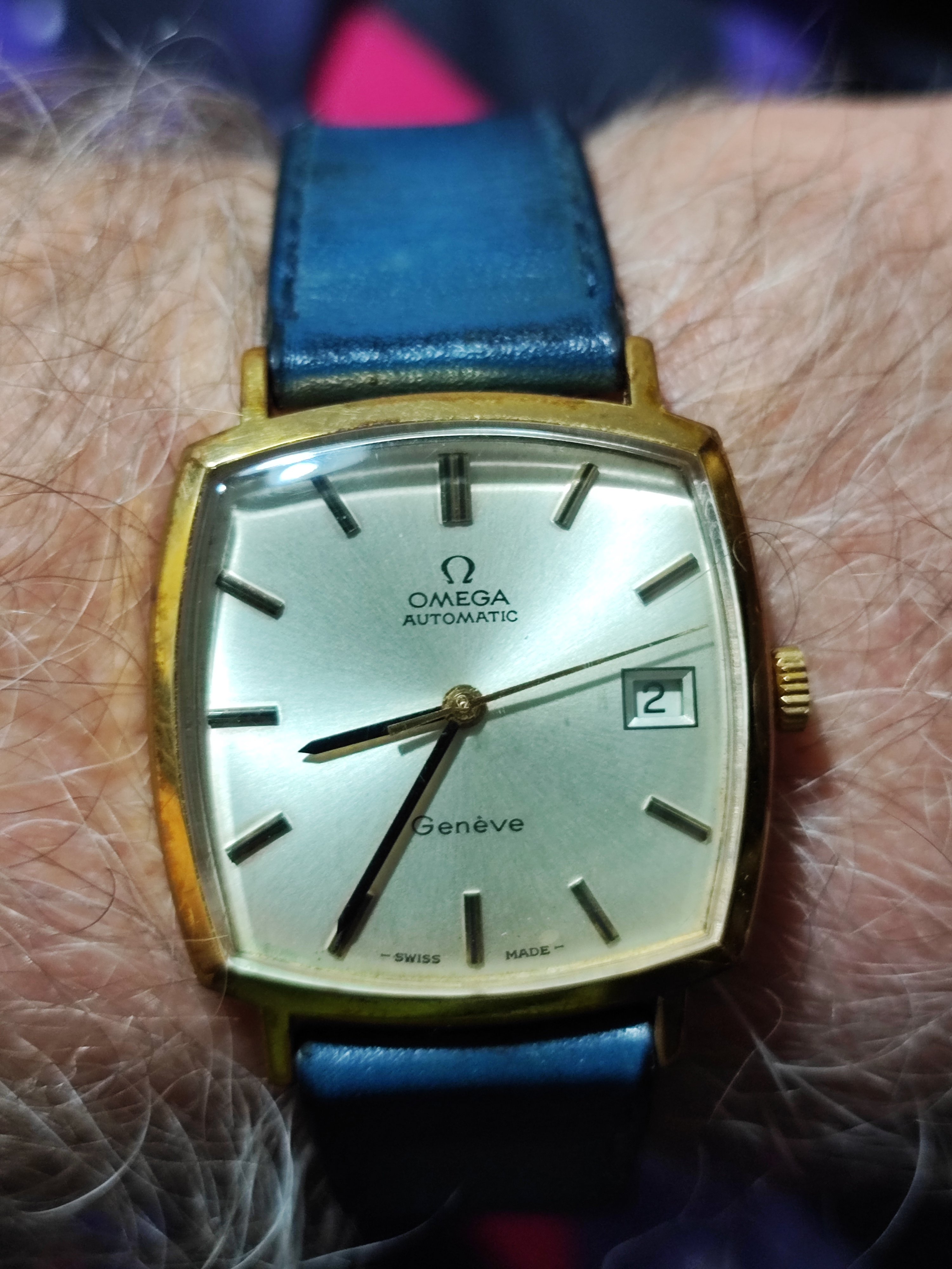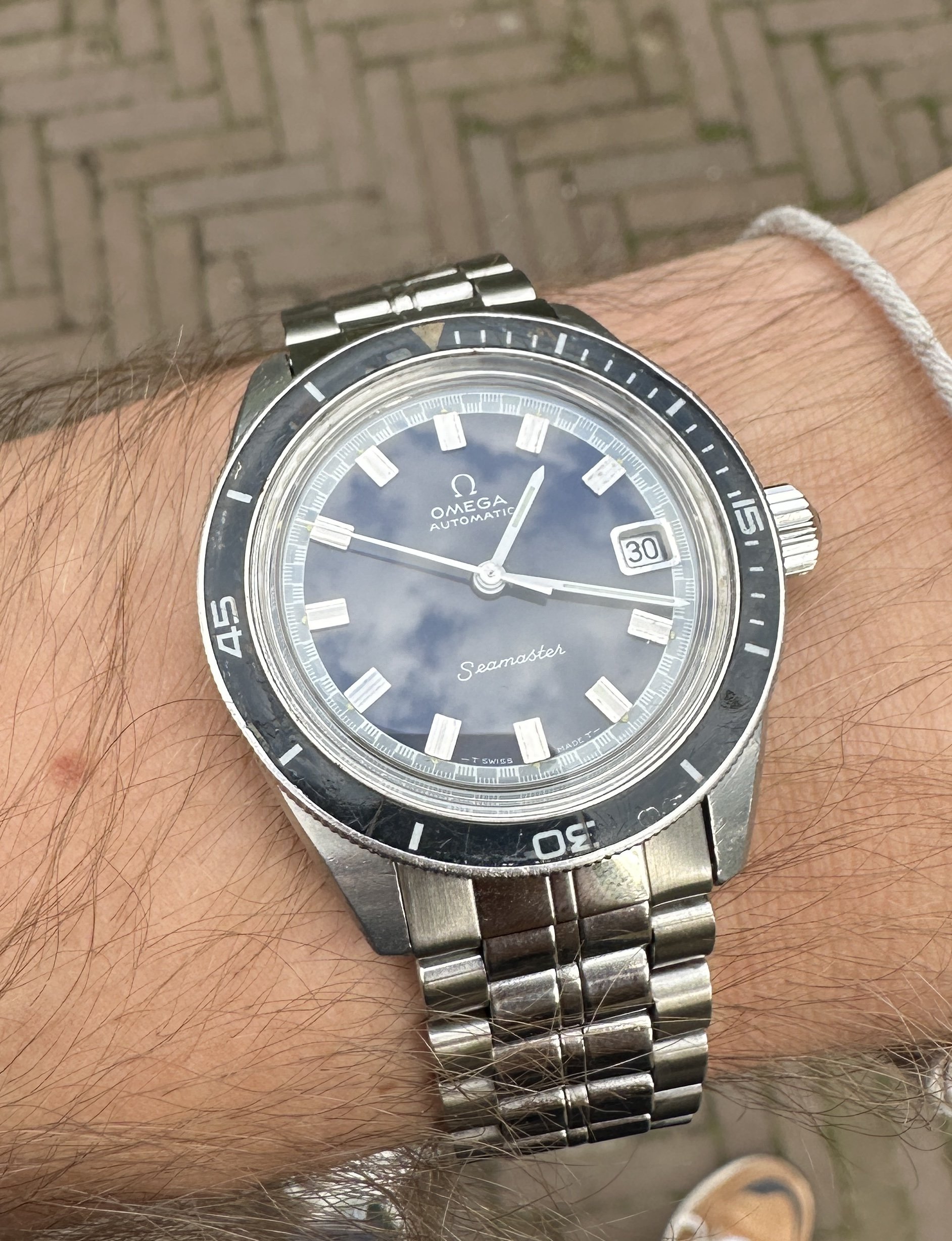 Last Saturday the new hands were installed. My model had a white second hand, where according to Omega a steel second hand is original. The crown and pin were also replaced. Unfortunately, the seconds hand also looks white in this picture, but so it is steel....