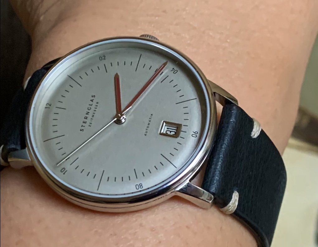 Sternglas,the Junghans-ish case,hands,lines&fonts and the Nomos Orion-ish lens shaped sapphire seem worked quite well together. Graphics of the dial is effortless. Good job!
