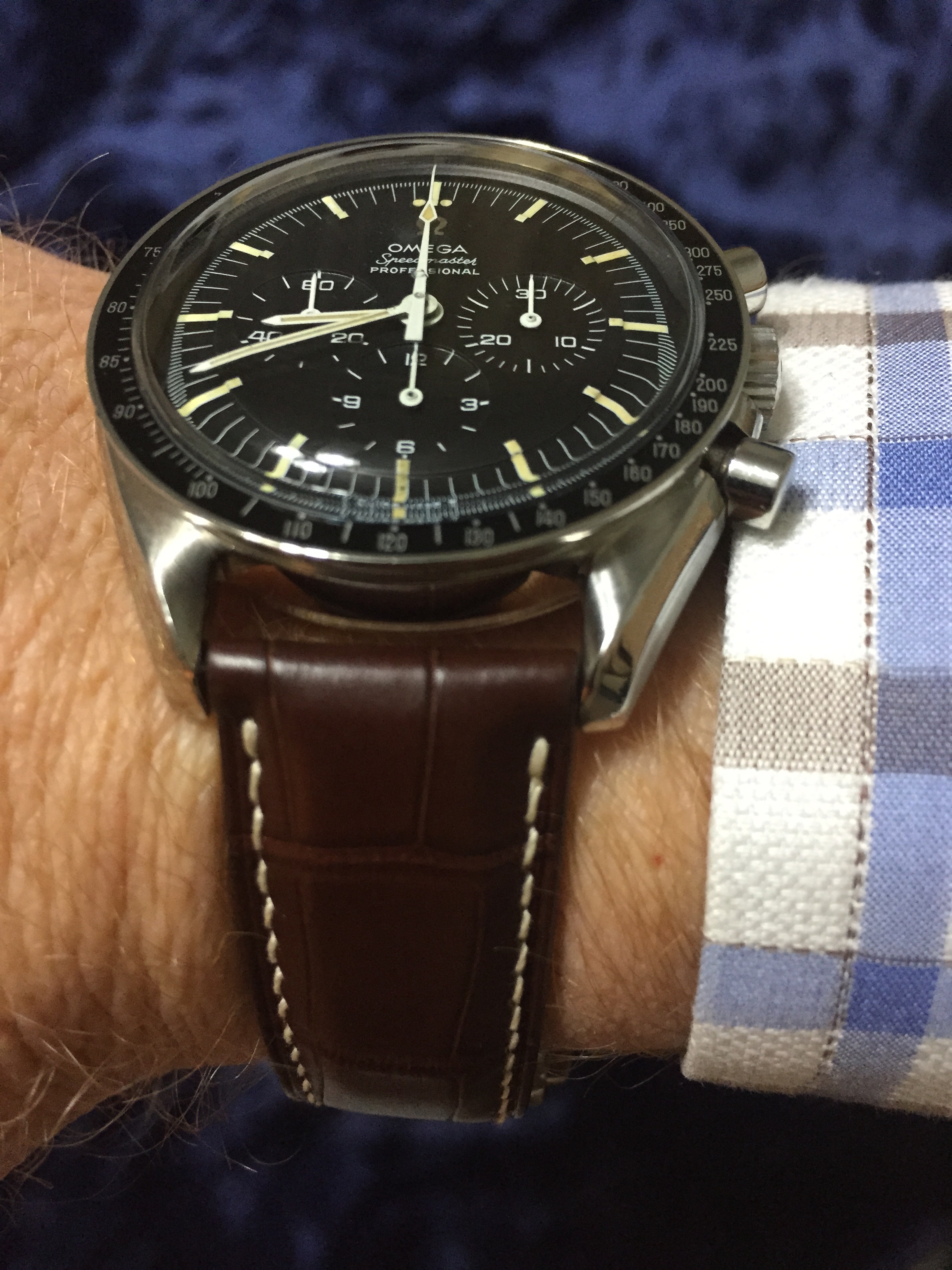 Posts 132 Likes 235 sirish19 ·Feb 19, 2015 Sporting the new Alligator strap with the Omega deployant on my '68 transitional Speedy.