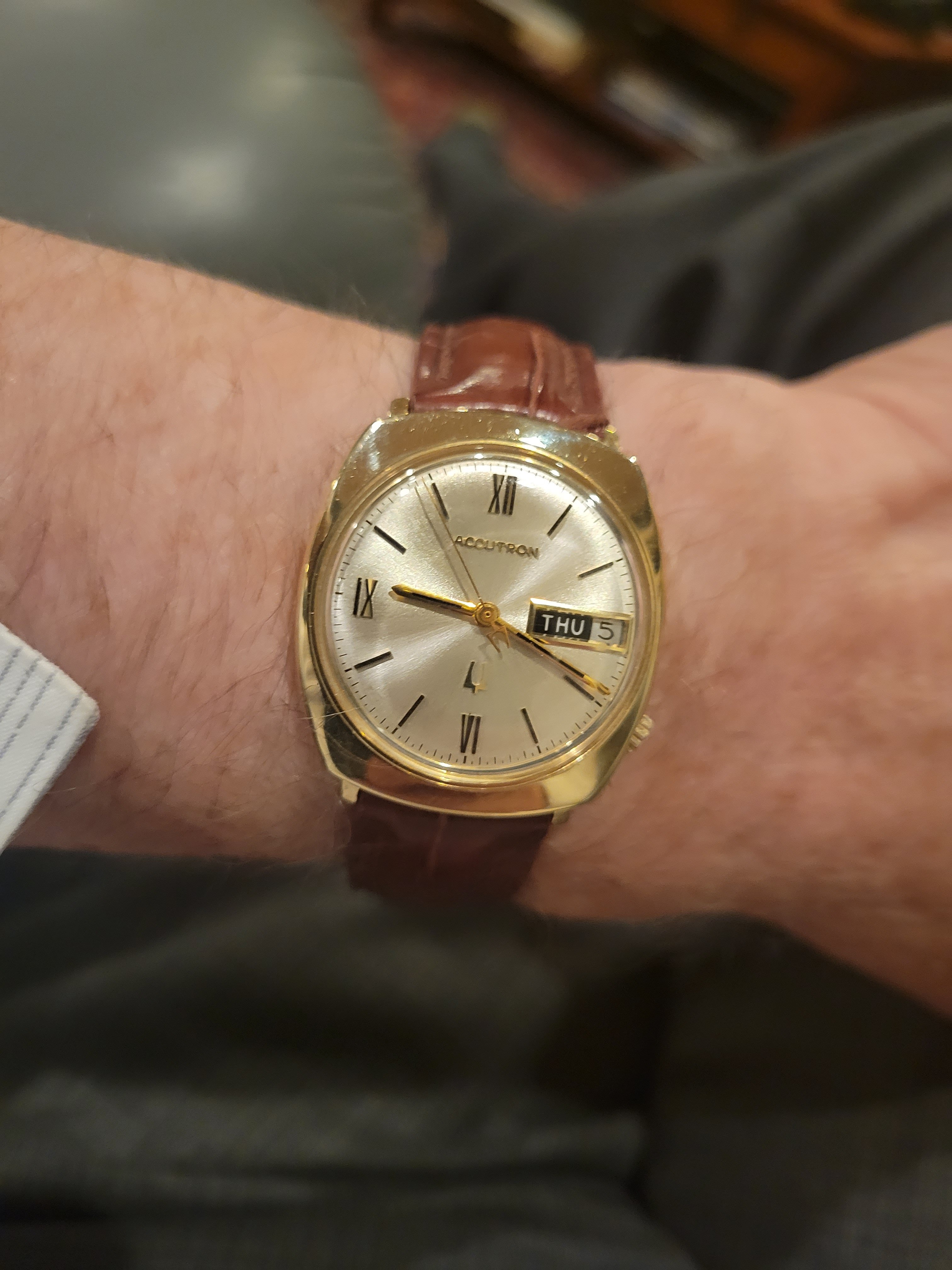 On the subject of Accutrons, today I’m wearing my 60 year old (yes, that’s correct) Accutron that I’ve had since new. It has been on my wrist for many important occasions. Our wedding in 1966, at Expo ‘67 in Montreal when I got caught in a cloudburst while lined up to get into the Czech pavilion, the christening of our son in 1971, at our 50th wedding anniversary soirée, at our 56th anniversary dinner, and today. Nothing special about today, really. But I’m wearing my Accutron. Looks and runs like new.