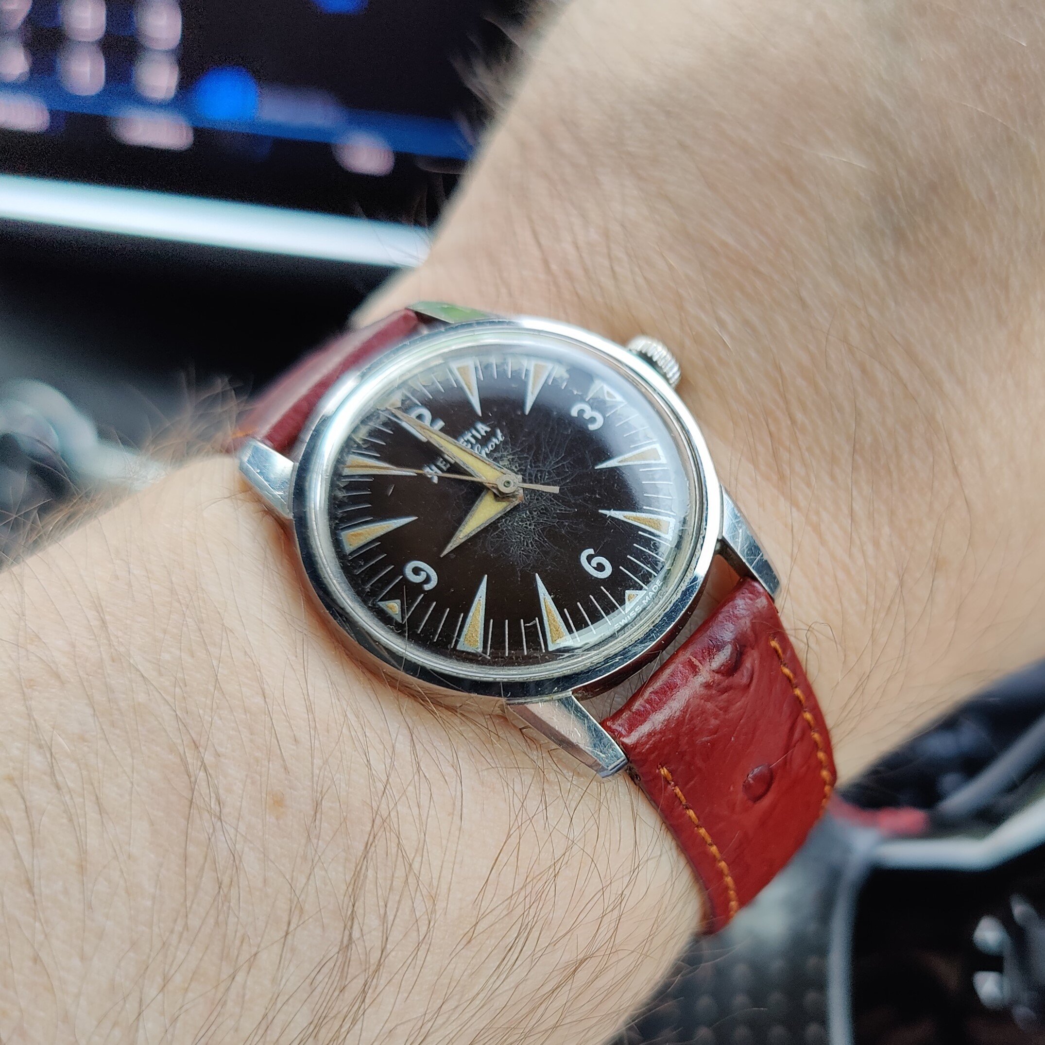 Posts 428 Likes 1,447 Helvetia History ·Oct 13, 2023 Wearing my new Helvetia to work today, took a photo as I arrived. Strong Seamaster 300 vibes. These dials always seem to have degradation of the lacquer but I think it looks OK, adds a bit of character!