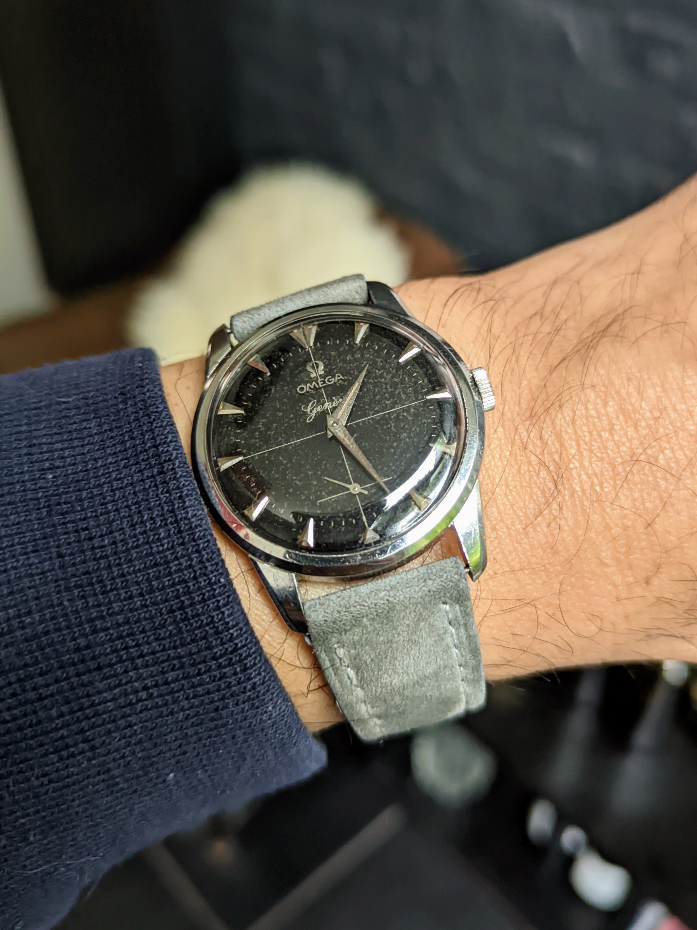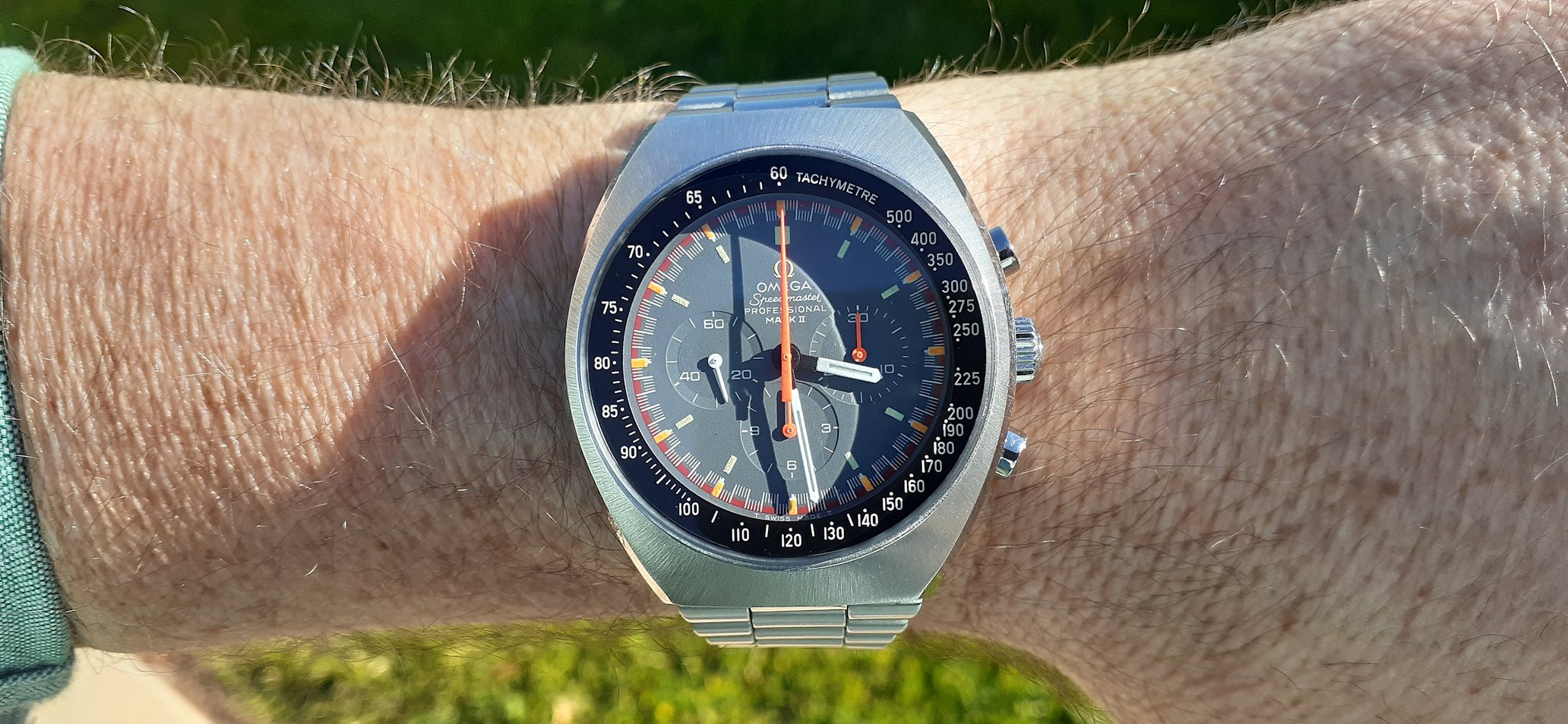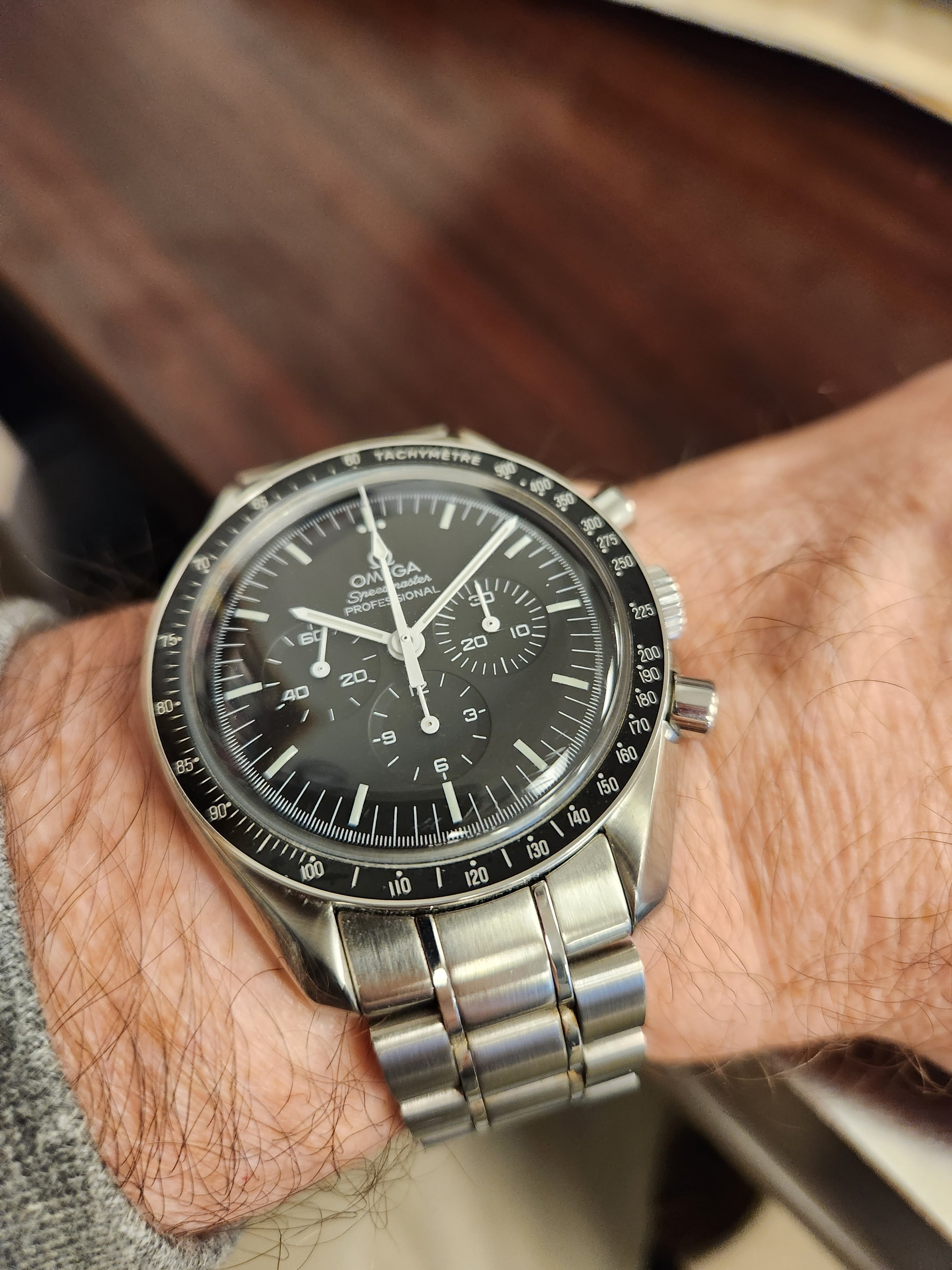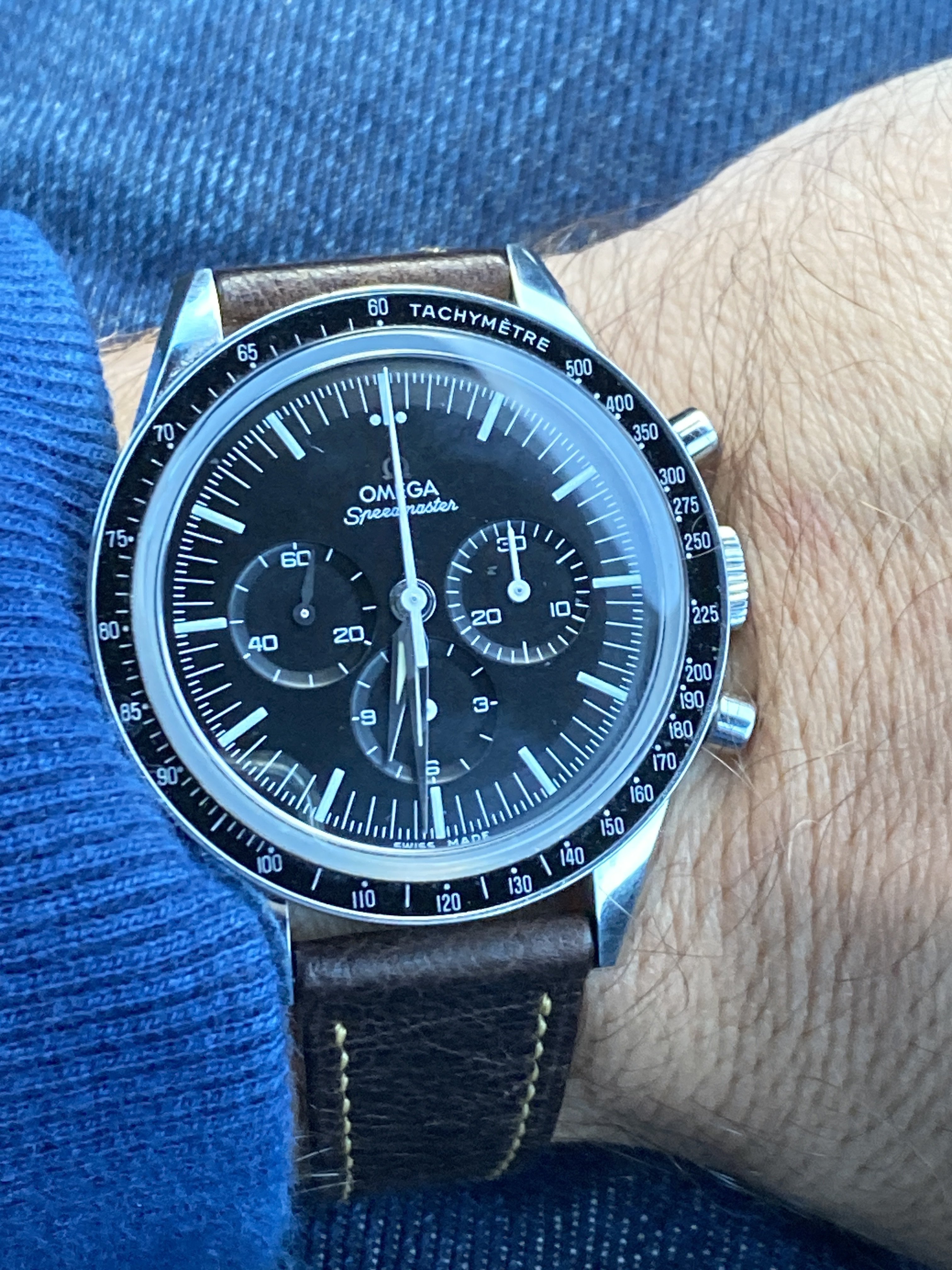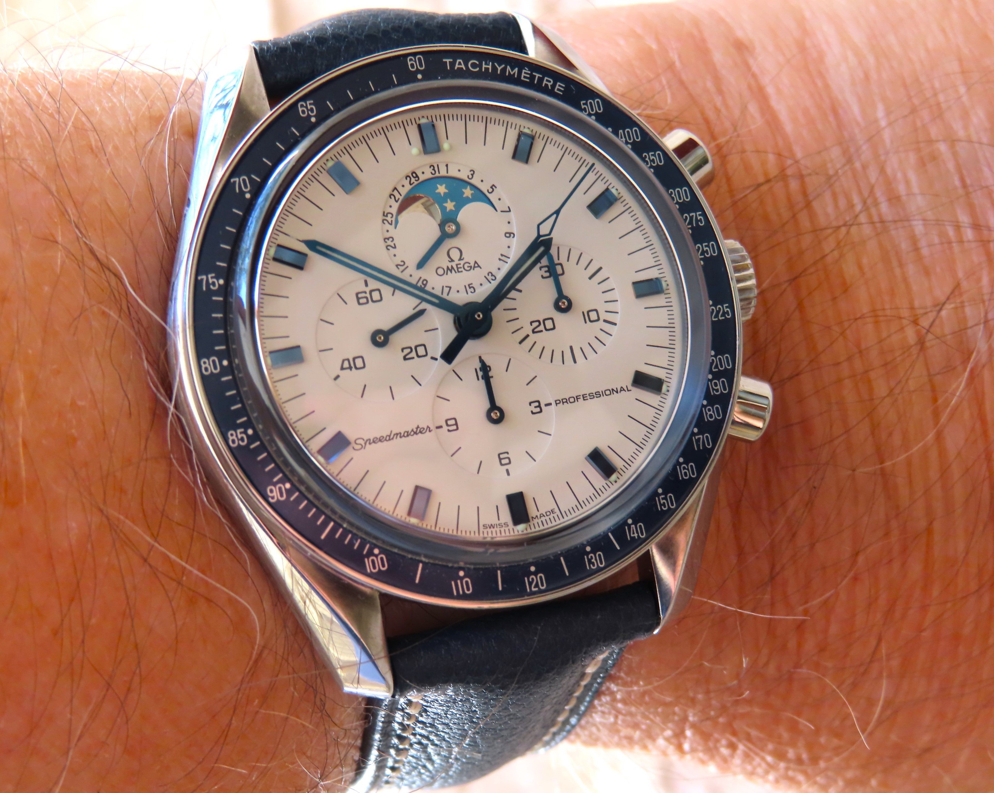 A modded 3575.20.00 from around 2003, started life with Broad Arrow hands and WG bezel, freshened up with blue baton hand set and Gemini IV bezel. The 1866 Speedmasters are generally underappreciated, and I think this dial (ecru/beige) is one of the best of any Speedmaster.
