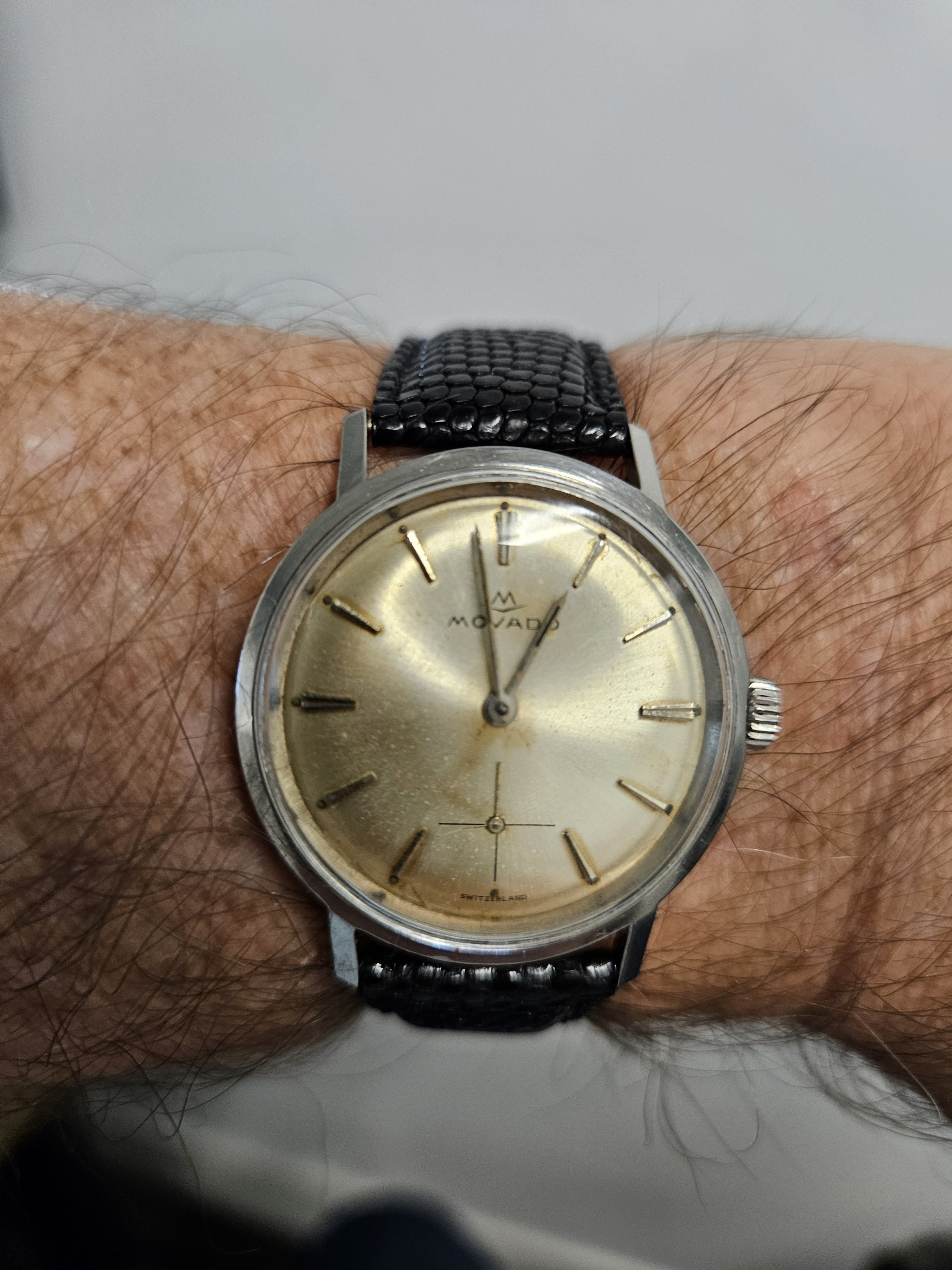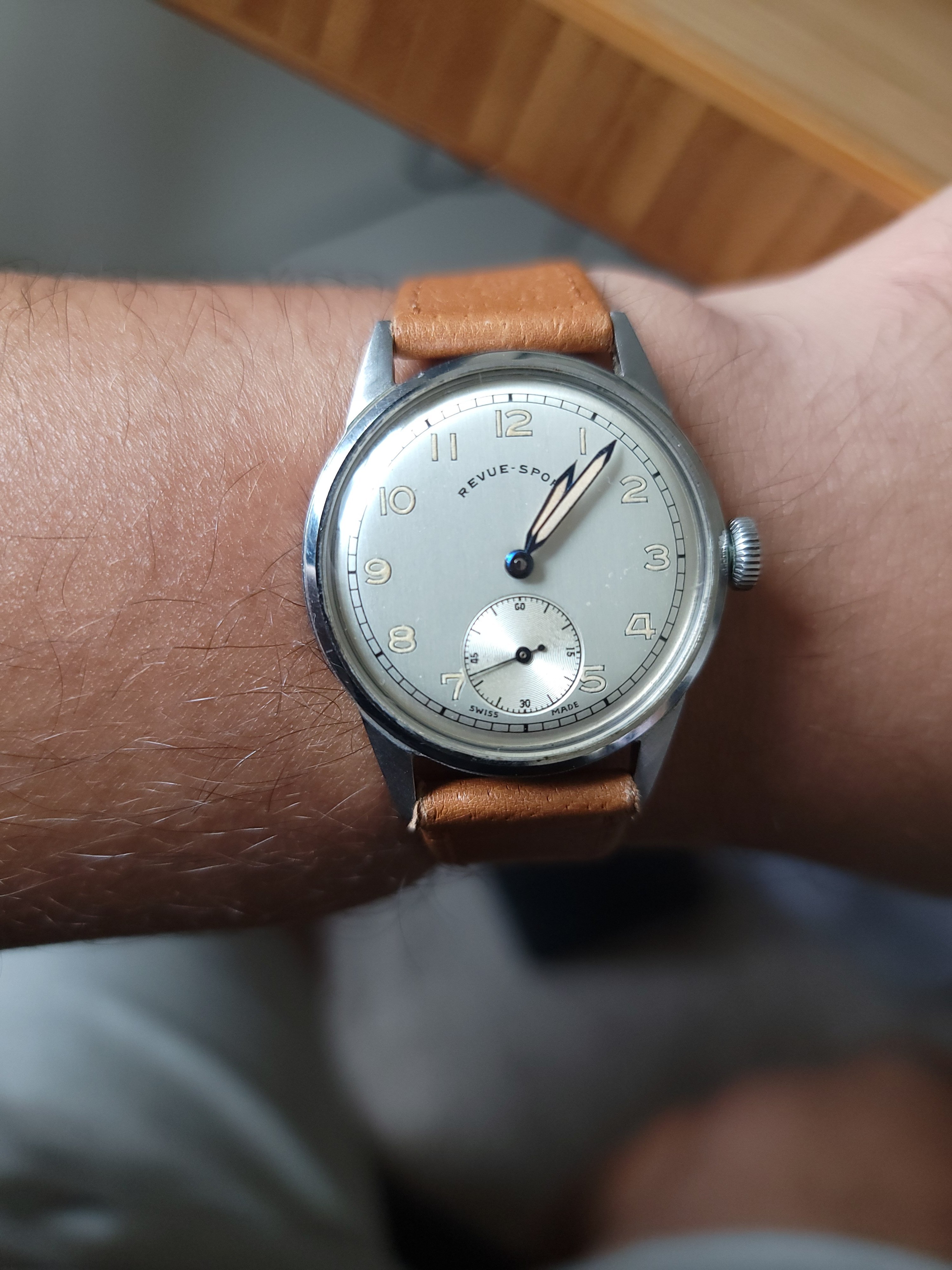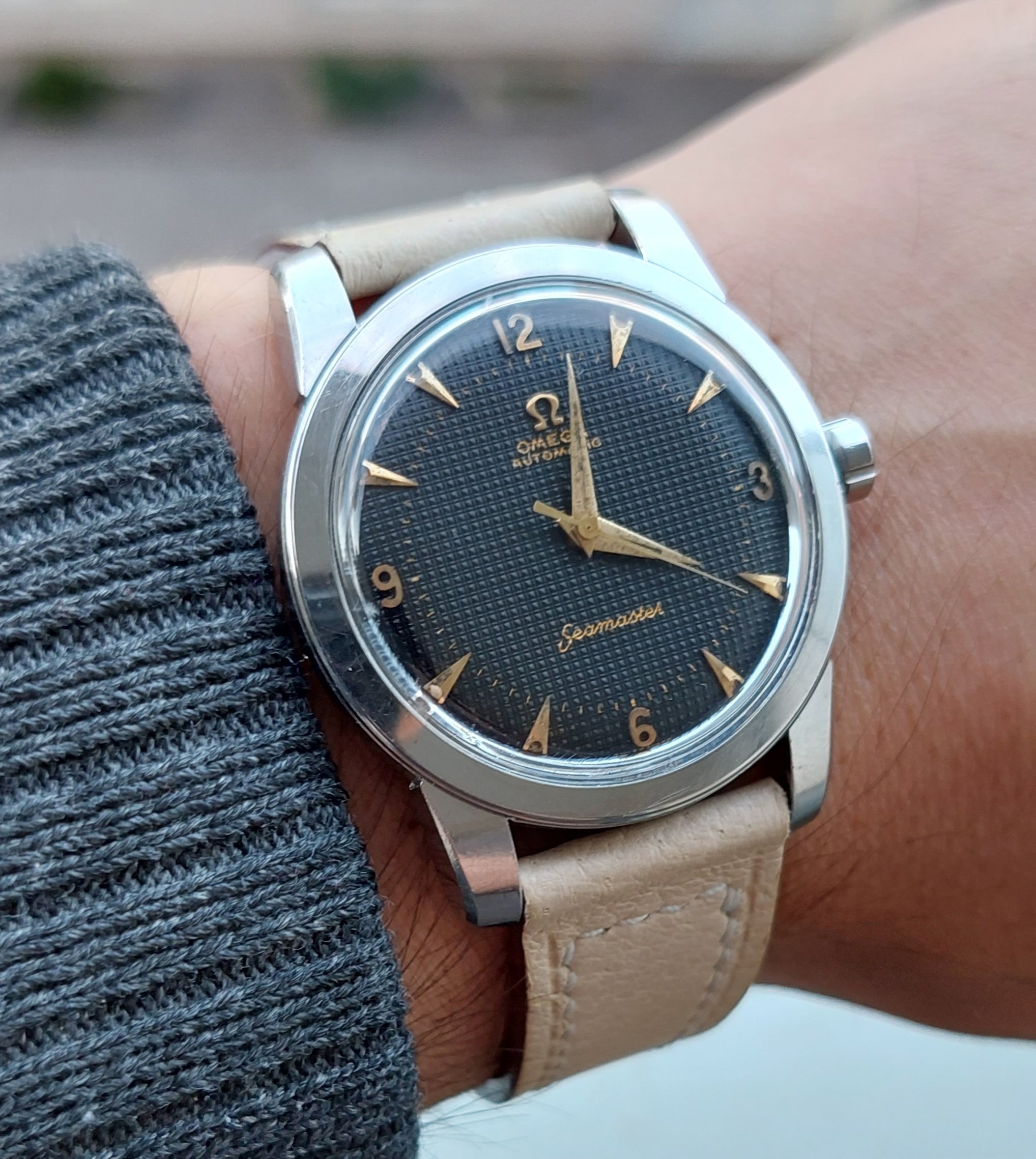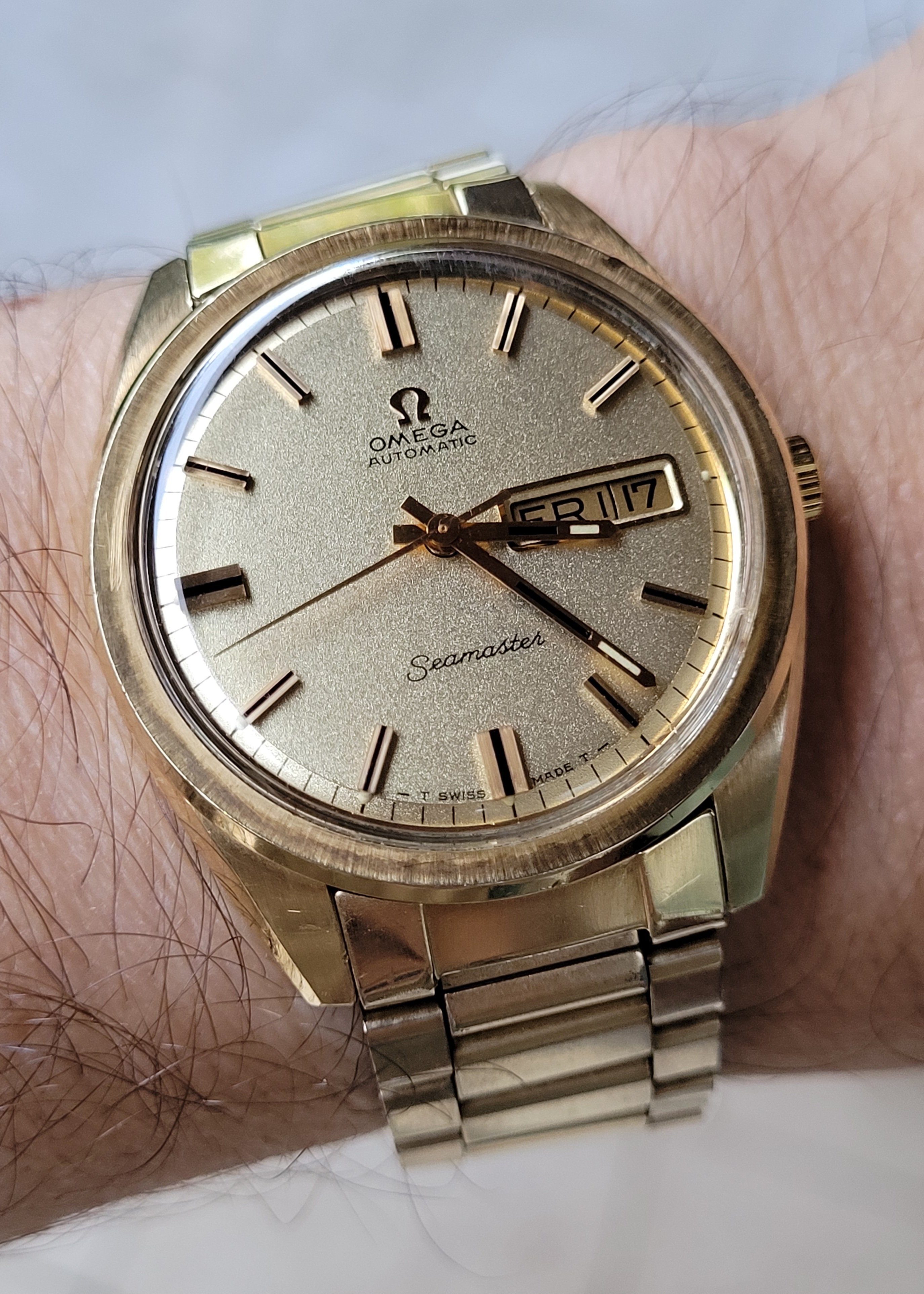 The date is correct, but this one is not on my wrist, today. This one spent about 50 years, slumbering in a lozenge tin of Omega bumper parts, all dismantled. Then I discovered the dial in that same tin! Everything was there, with evidence of rust on a few parts, but no case! I resurrected it. I posted it in the message board, mentioning I didn’t have a case. Several months later, @Tritium , a collector from Madrid PMed me that he had an extra NOS steel case! Voila! Here is the result.
