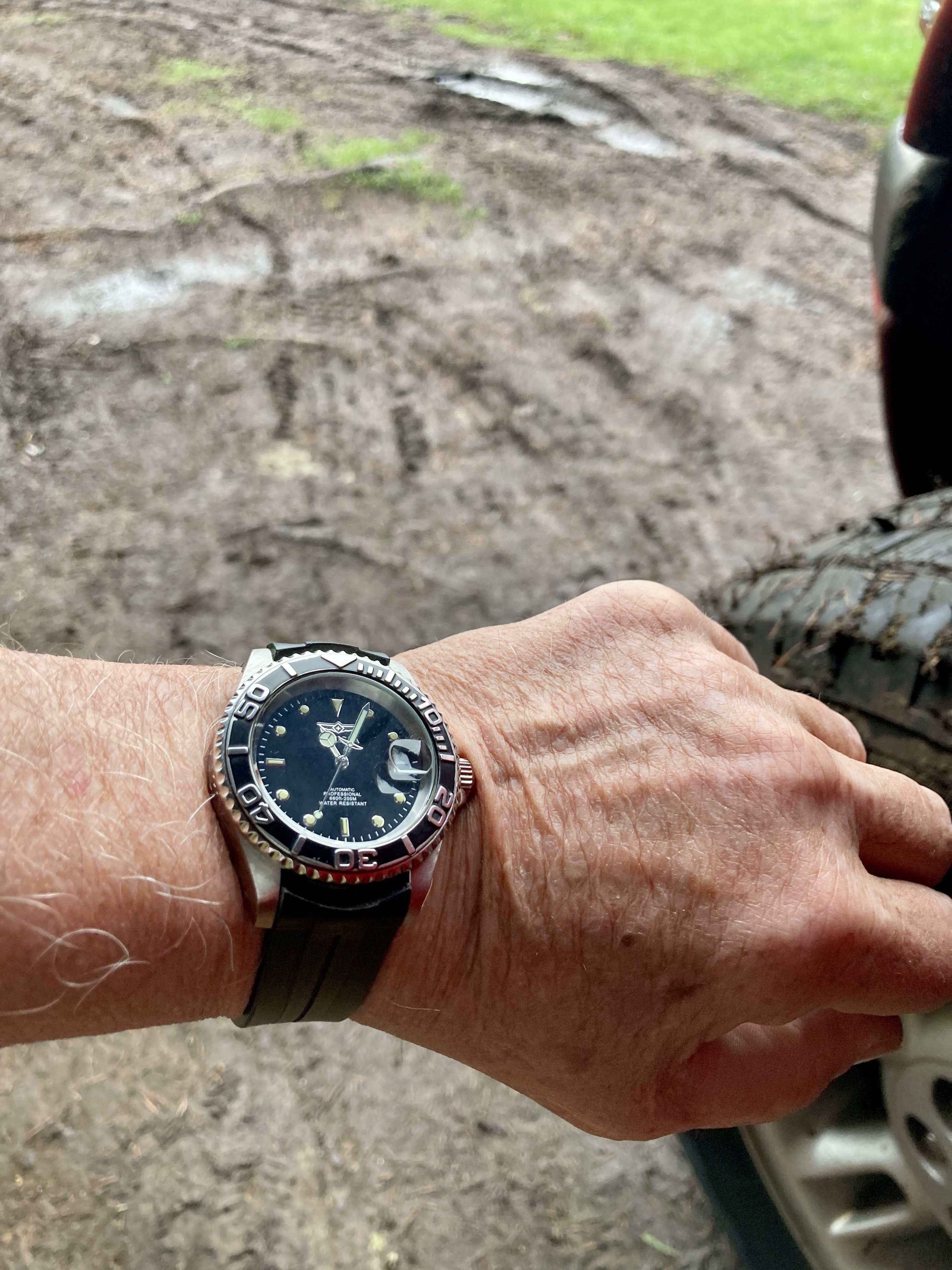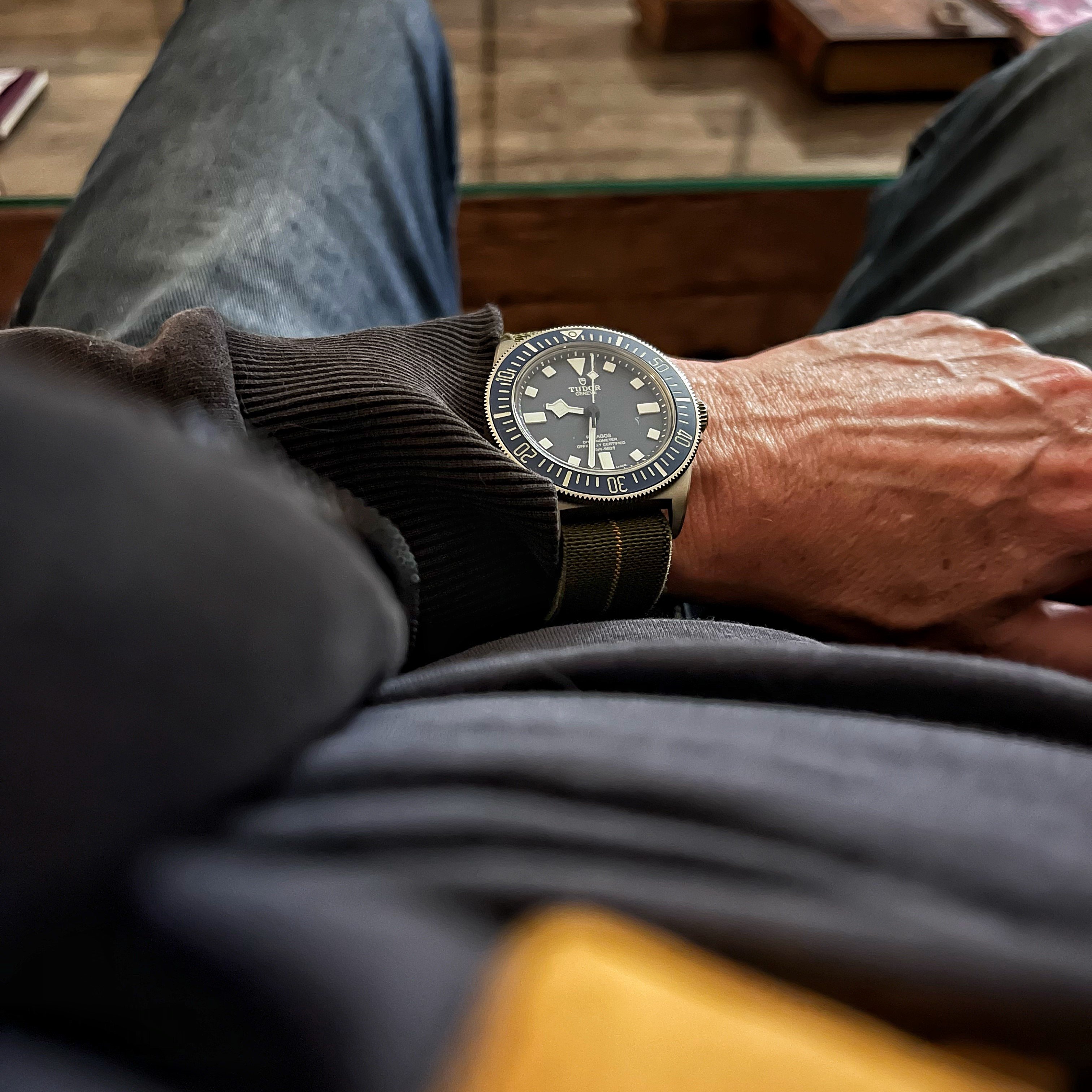 Tudor FXD on an https://ndcstraps.com/ strap. The genuine mil-spec new & NOS Marine Nationale parachute elastic made in the original factory in France.